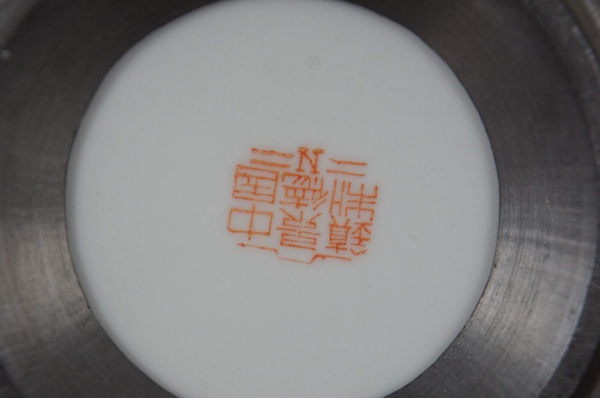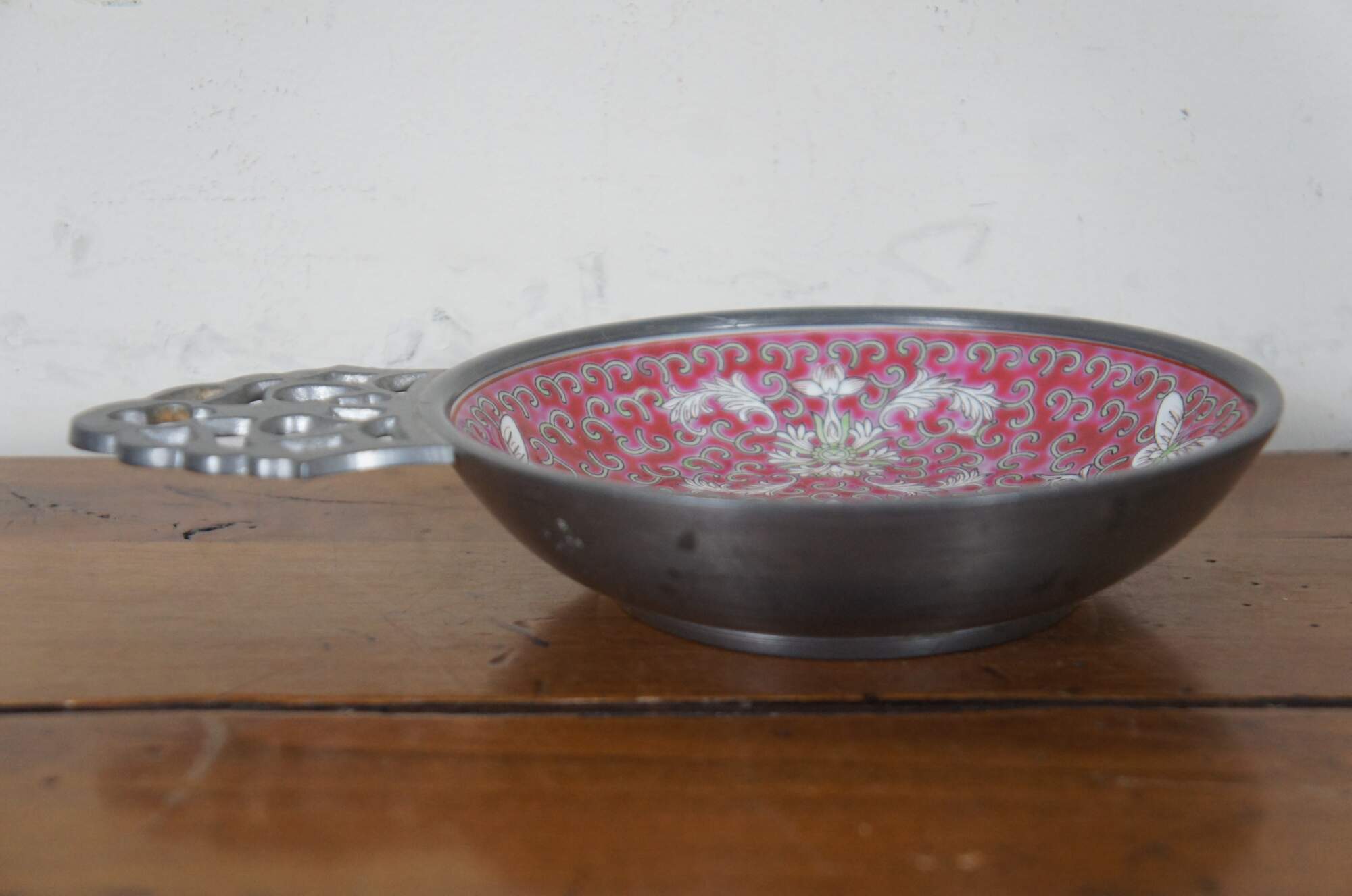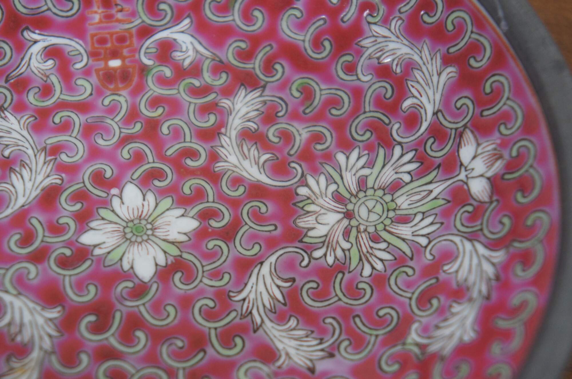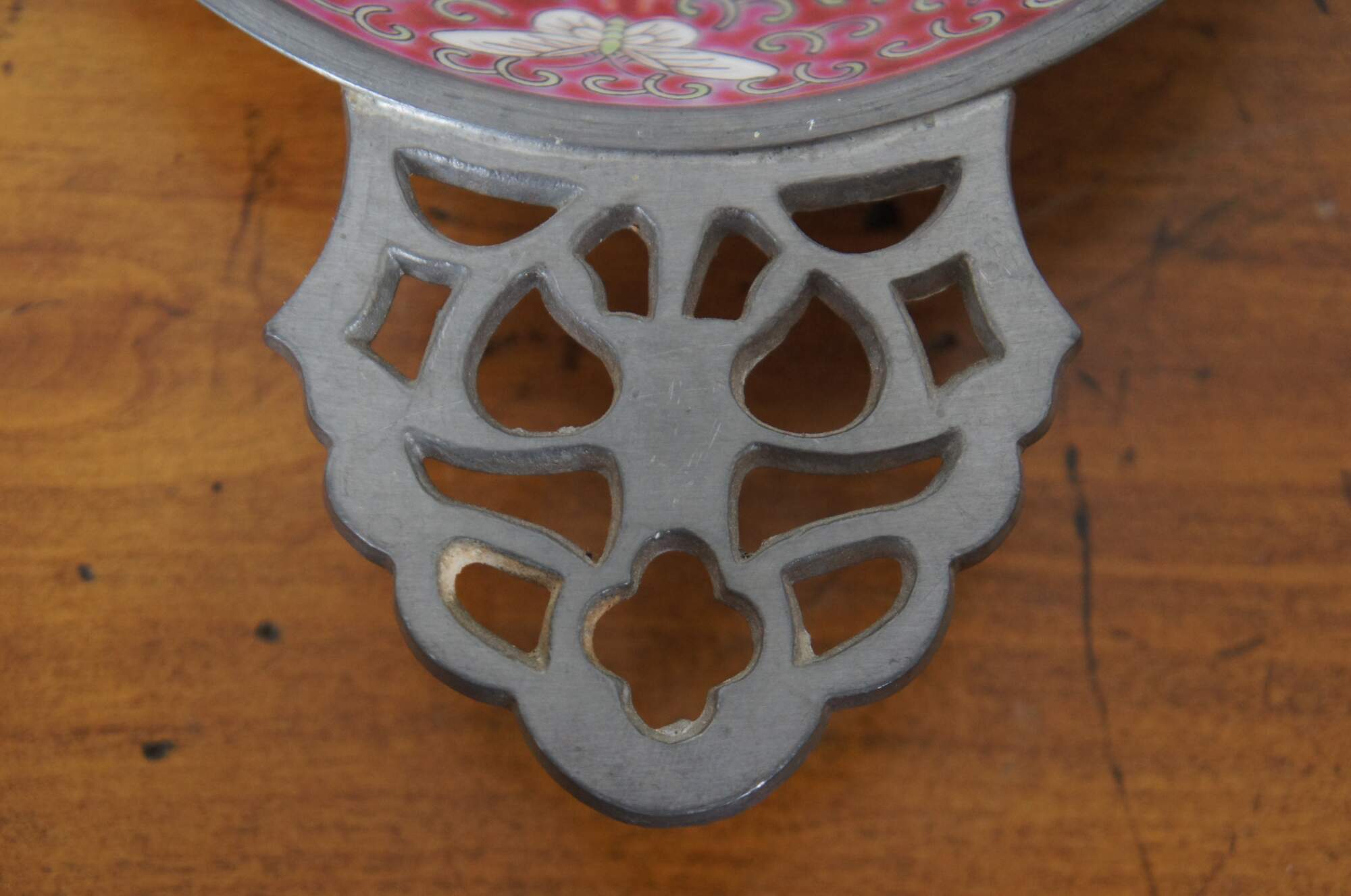 Vintage Hong Horizons canton ware hand painted cloisonne double happiness / marriage porcelain bowl, dish or wall plaque featuring butterflies, lotus flowers, chrysanthemums and a plum flower. Made in Hong Kong and Jingdezhen.