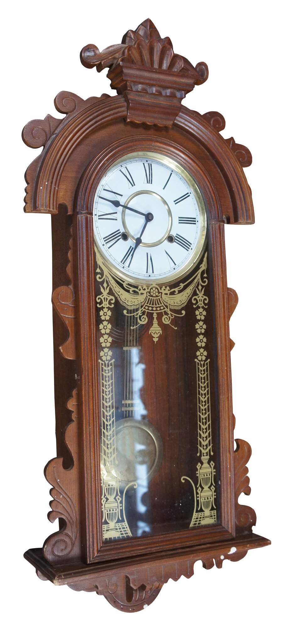 Korean Reproduction of a nineteenth-century Erie Regulator wall clock, featuring a dark walnut case, ornate scrolled and carved shell motif, arched door with gold painted Neoclassical urn and floral designs, Roman numerals face, and a brass pendulum and key.