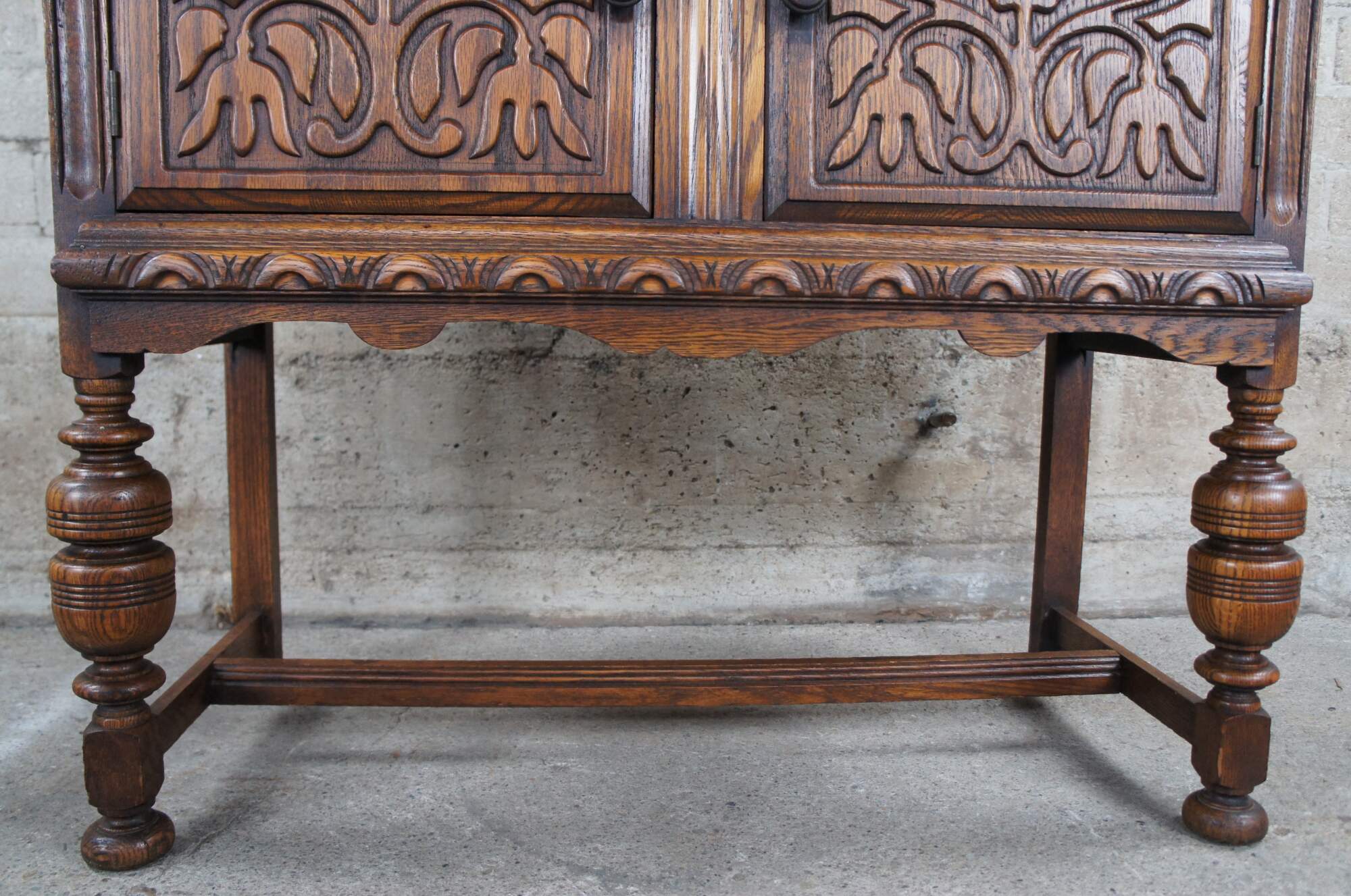 Early 20th Century Jacobean / Elizabethan revival court cupboard. Made from oak with an upper hutch mounted between two beautifully turned baluster supports. Features low relief foliate carved doors and a large lower storage area. The rectangular frame is supported by baluster turned legs with bun feet connected by an H stretcher.