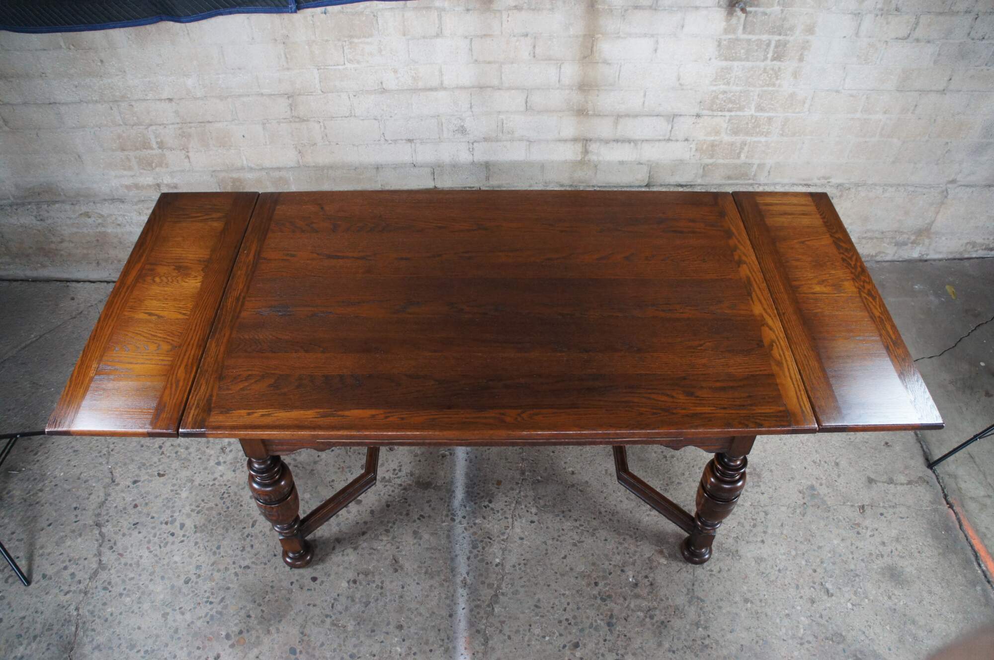 An Impressive early 20th century Elizabethan or Jacobean style Oak Draw-Leaf table. Features a plank top with pull-out leaves on each end, Bulbous carved legs and bun feet connected by stretchers.