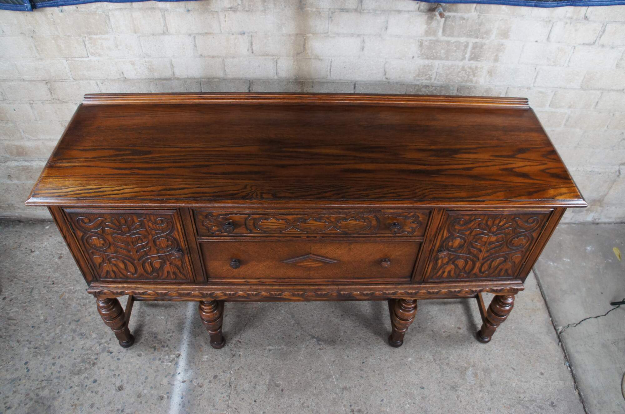 Early 20th Century Jacobean / Elizabethan revival buffet or server. A rectangular form made from oak two central drawers flanked by outer storage cabinets. Features beautiful carving throughout, a serpentine apron, sleek backsplash and turned baluster supports leading to bun feet connected by an H stretcher.