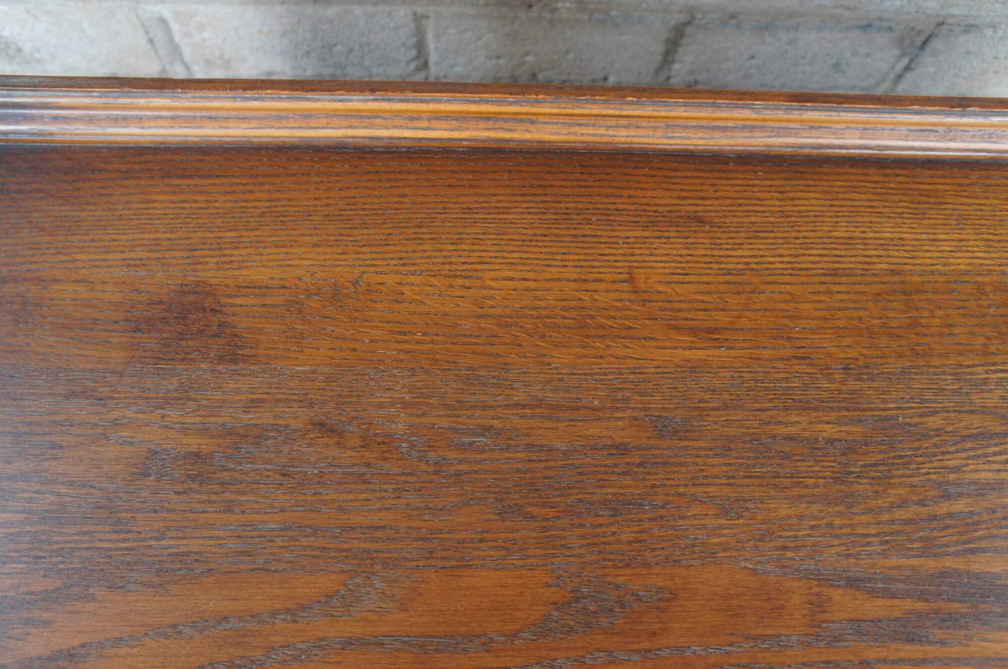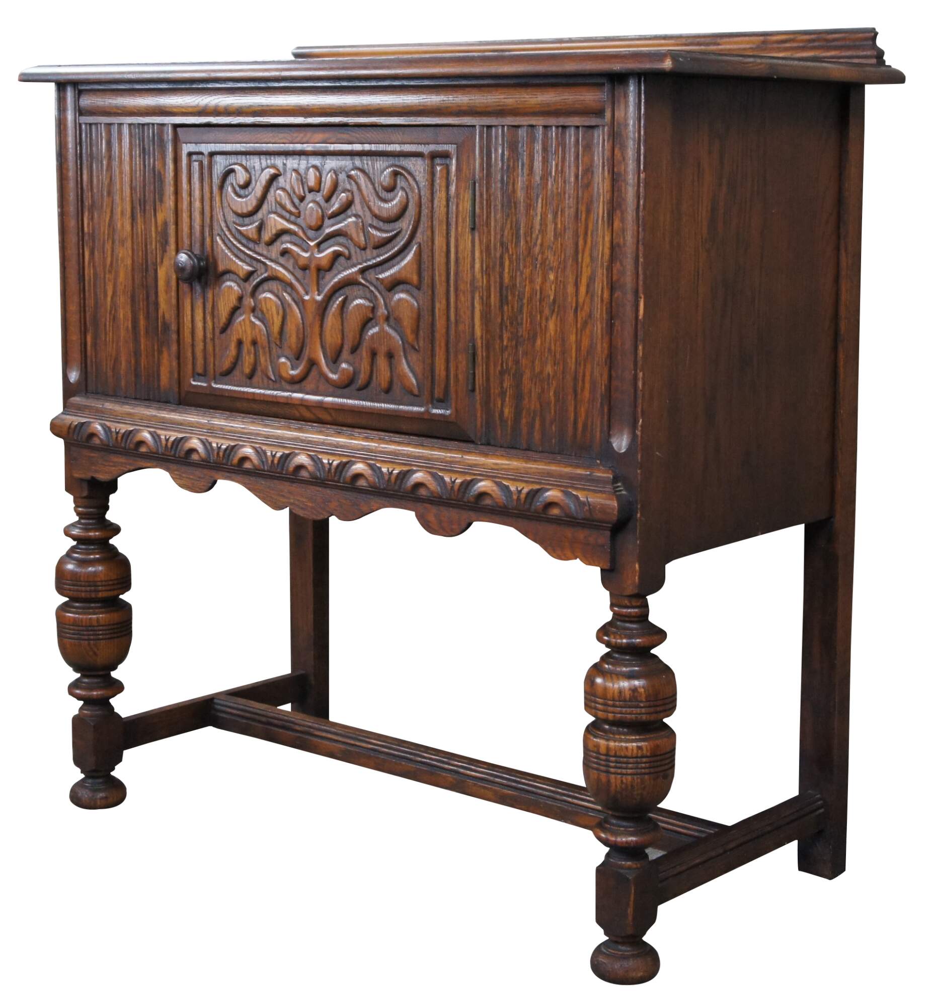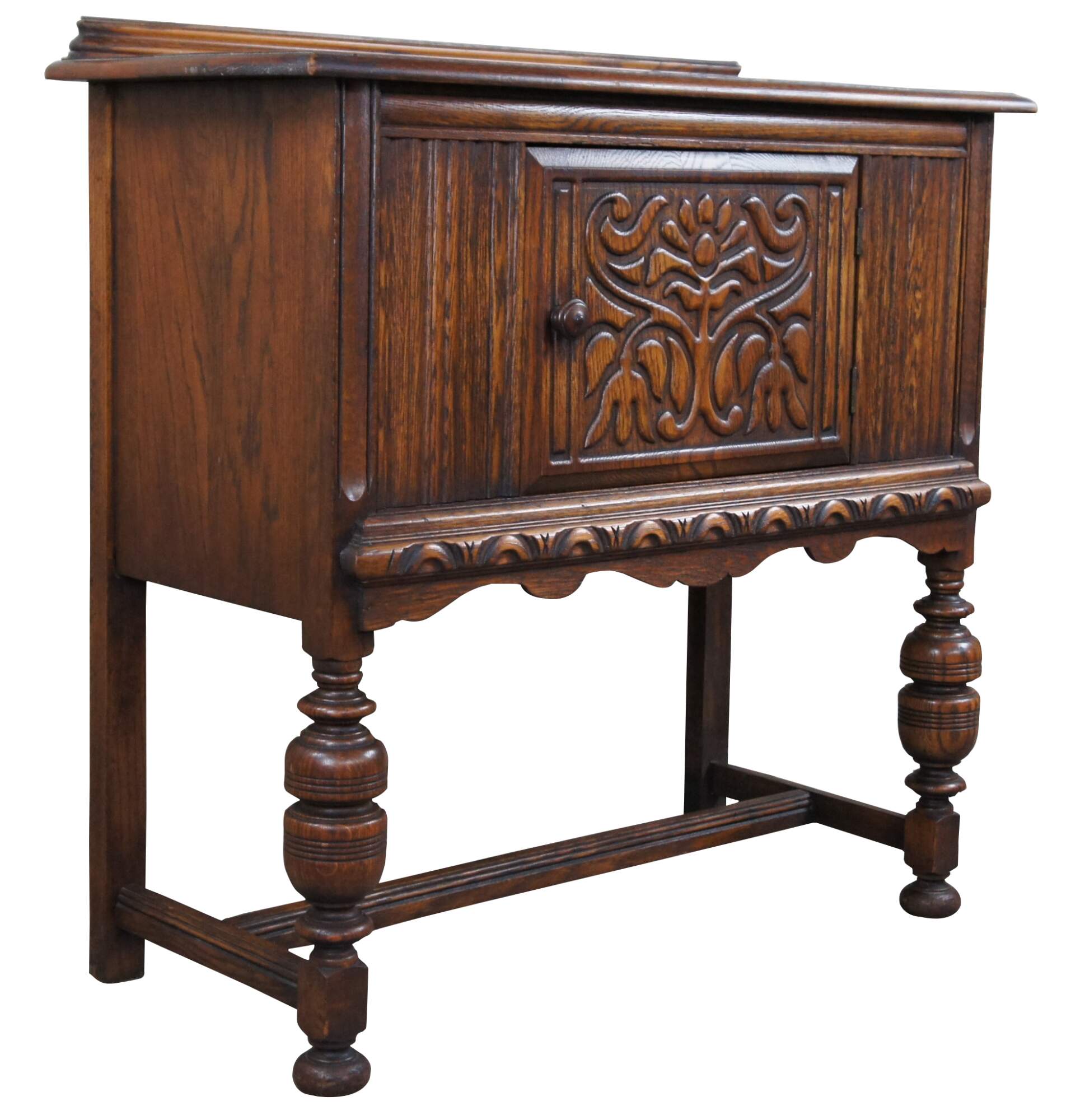 Early 20th Century Jacobean / Elizabethan revival buffet or server. A rectangular form Made from oak with a carved central cabinet above a serpentine apron, turned baluster supports and bun feet connected by an H stretcher.