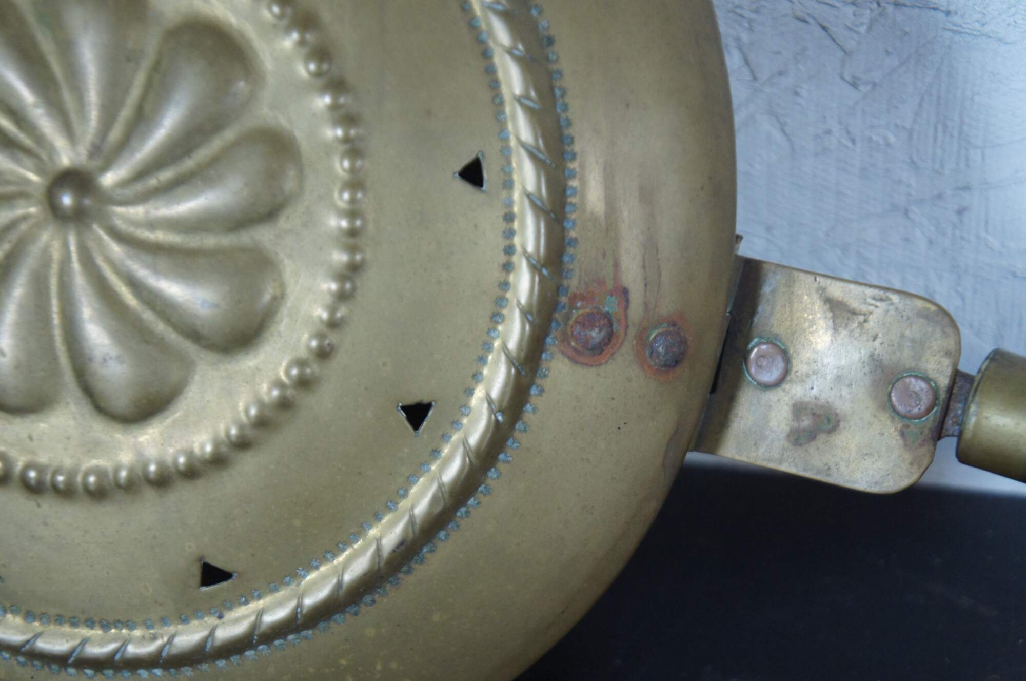 Antique 19th century brass bed warming pan with a turned black lacquered handle and a design of a pinwheel shaped flower within beaded and rope twist trim.