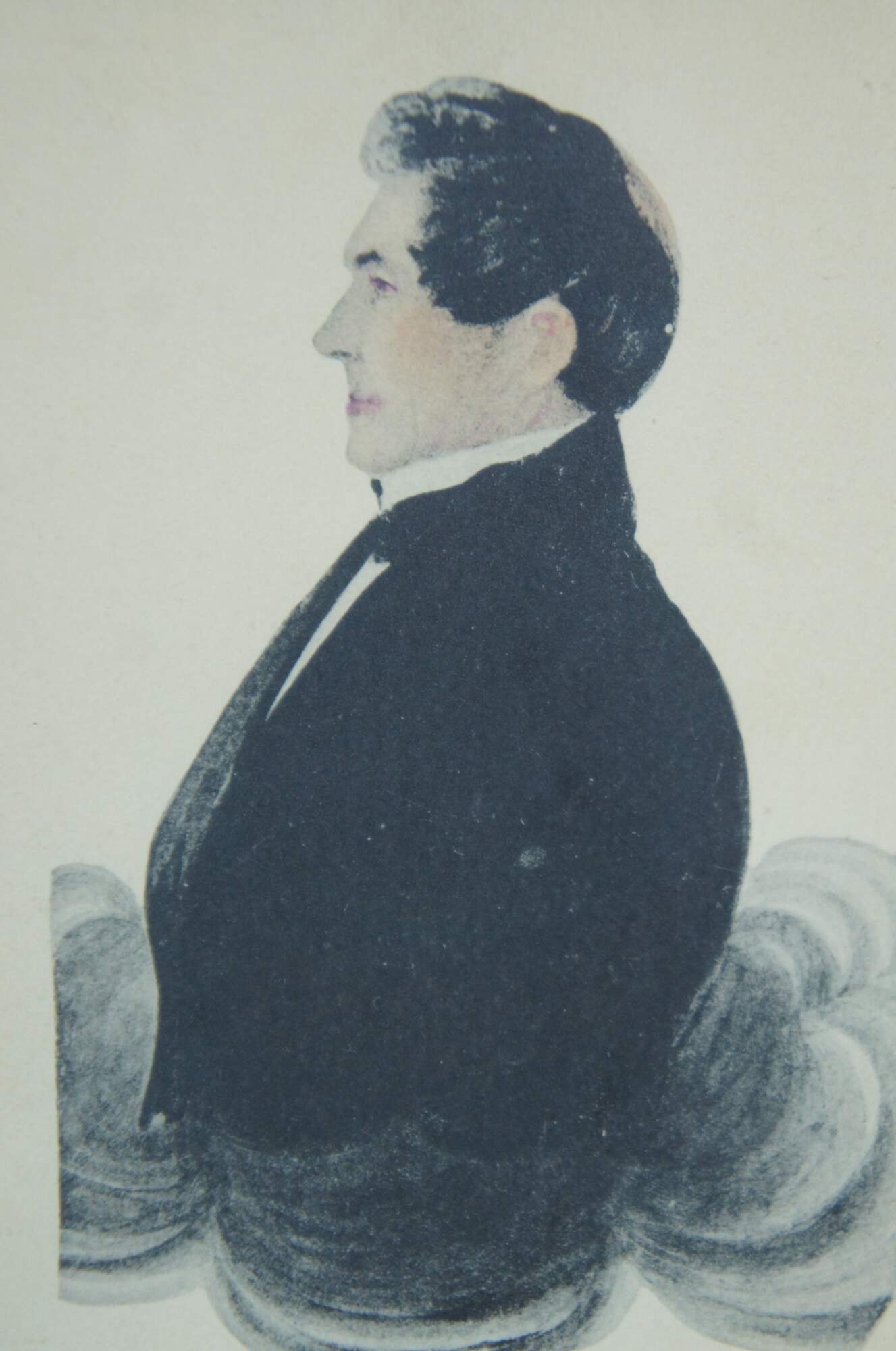 Pair of antique 19th century aquatint portrait prints, of a Victorian man and woman, originally painted by James Sanford Ellsworth. “Silhouettist, portrait, and miniature painter, James Sanford Ellsworth was born in Windsor, Connecticut in 1802. Depicting Massachusetts and Connecticut farmers and their families, the artist painted miniature watercolor portraits on paper, and all but seven of them are profiles. Only two of the full-face miniatures show the entire figure. Many of his sitters are sitting on chairs resembling doll furniture, and often his faces are framed by scalloped clouds, which gives them the appearance of floating in air. He painted images of at least sixty-four children. His signature appears with thirteen variations. Sometimes he used initials, and occasionally he wrote the word ""Painter"" after his signature.