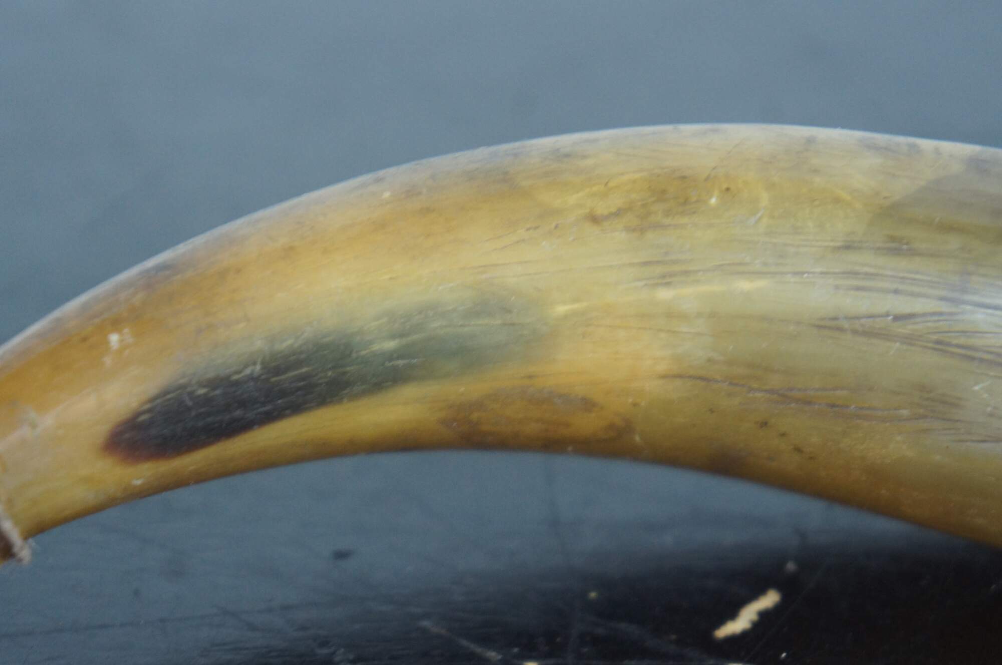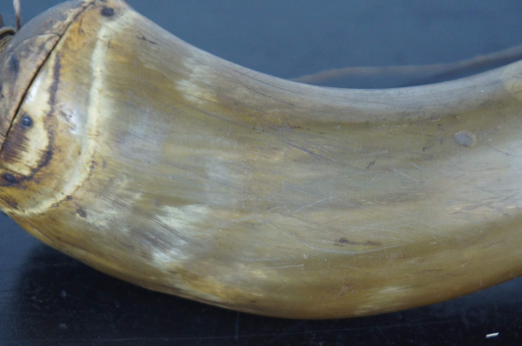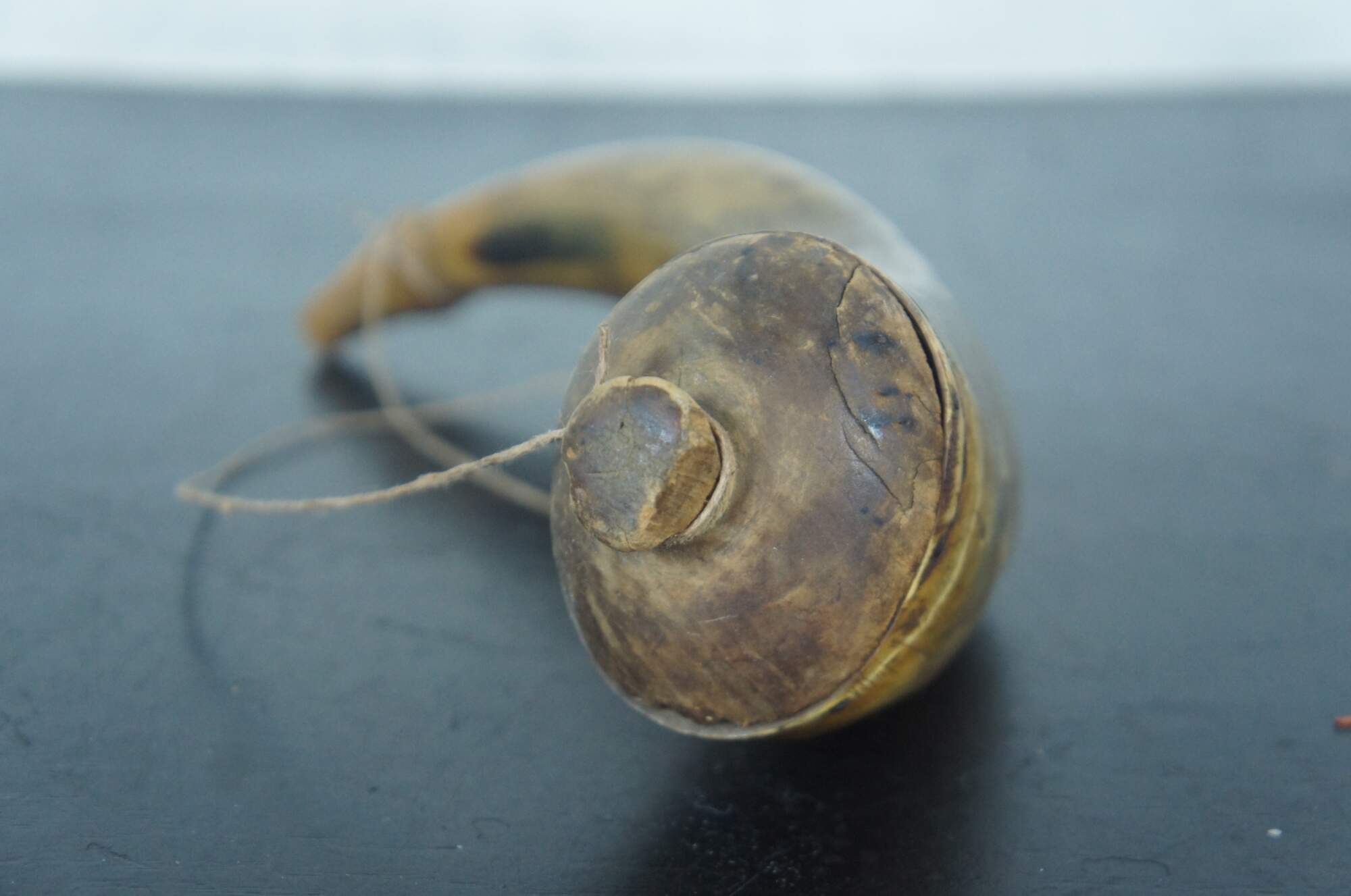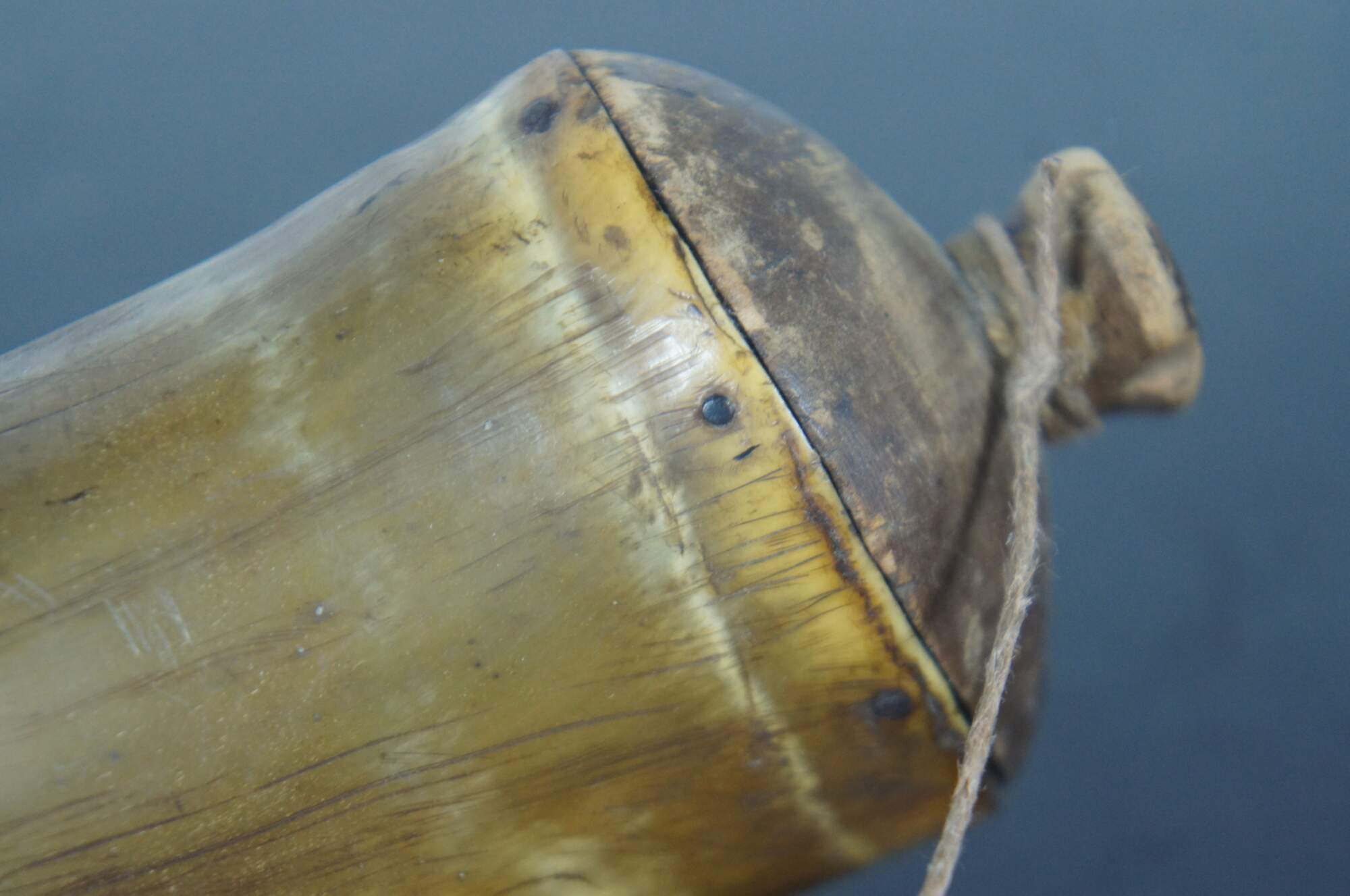 Antique colonial era carved powder horn with wooden base, carrying string and small carved star on one side. No stopper.