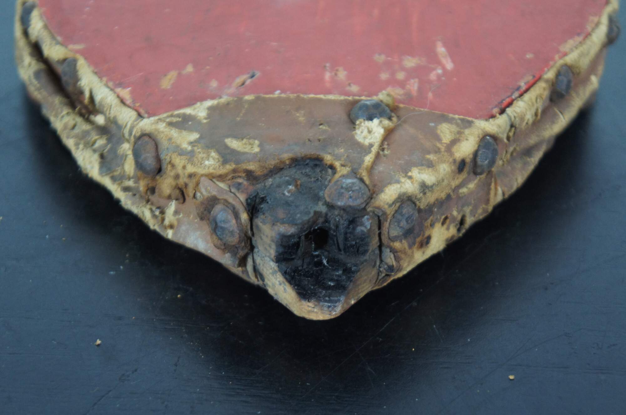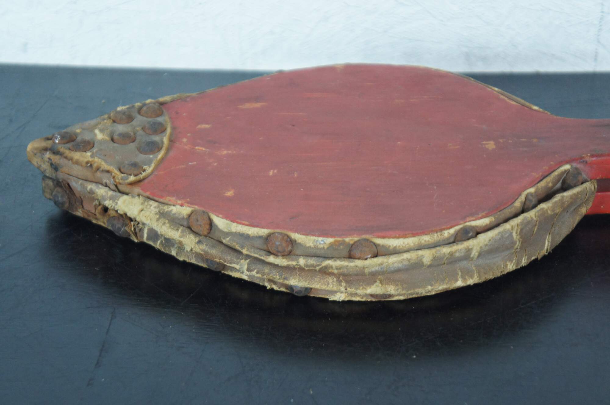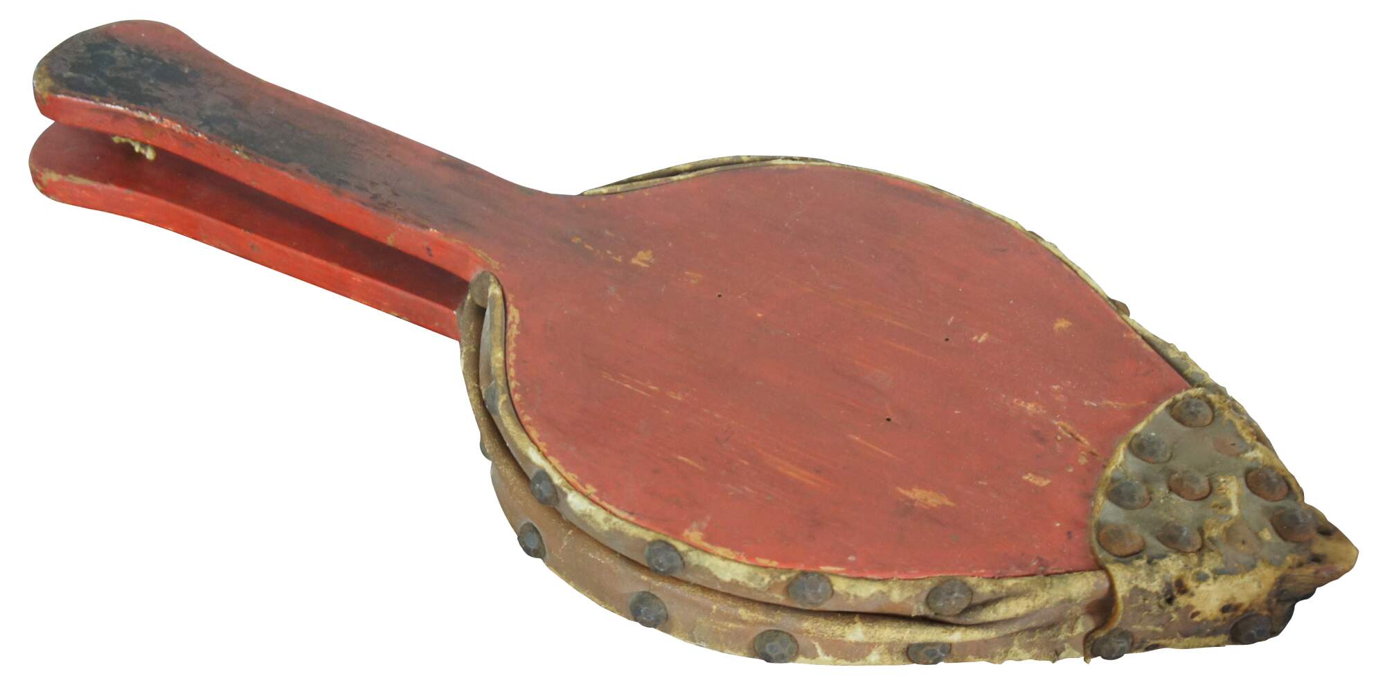 Antique wood and leather fireplace bellows, painted red and studded with hammered nail heads.