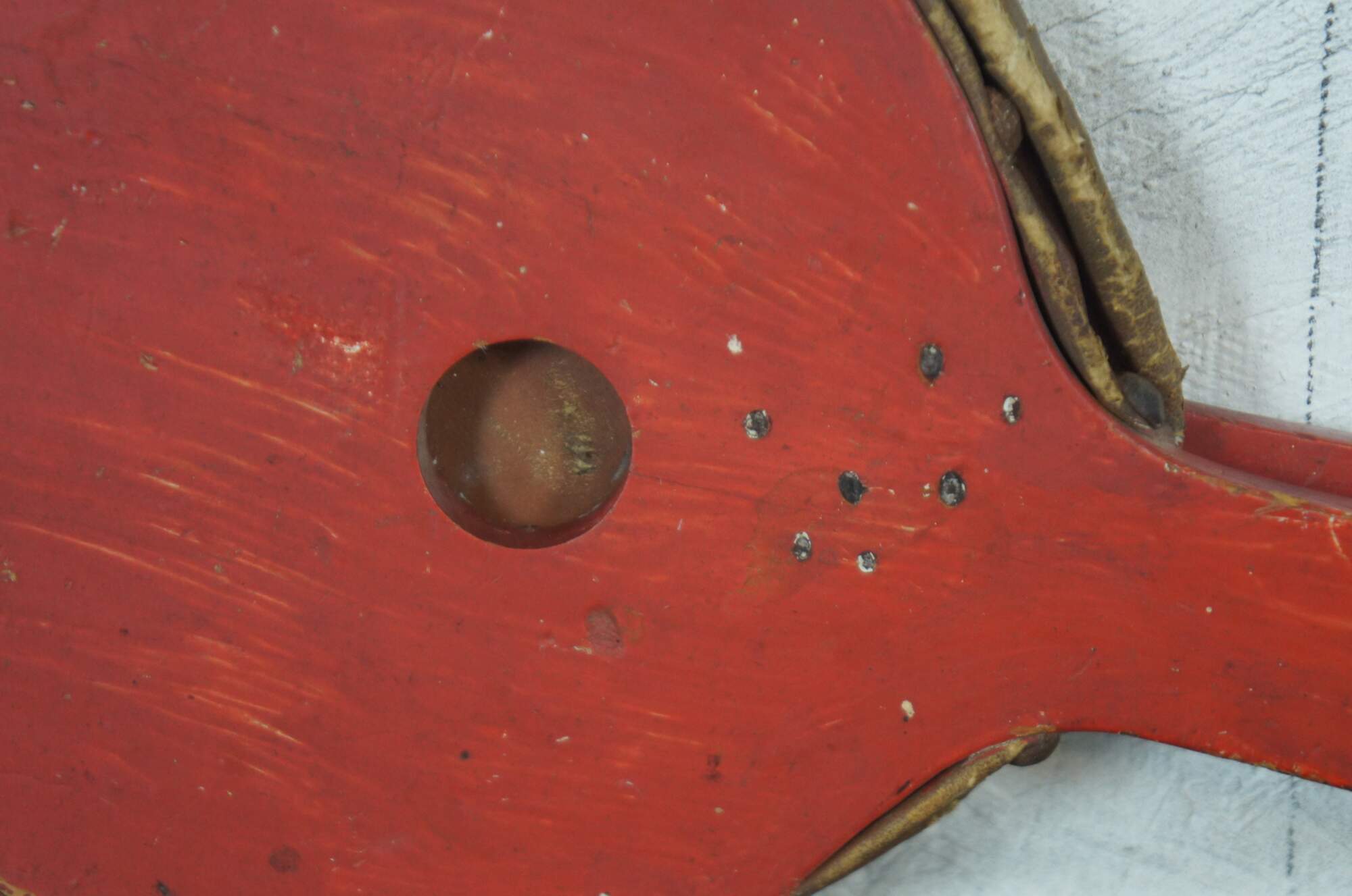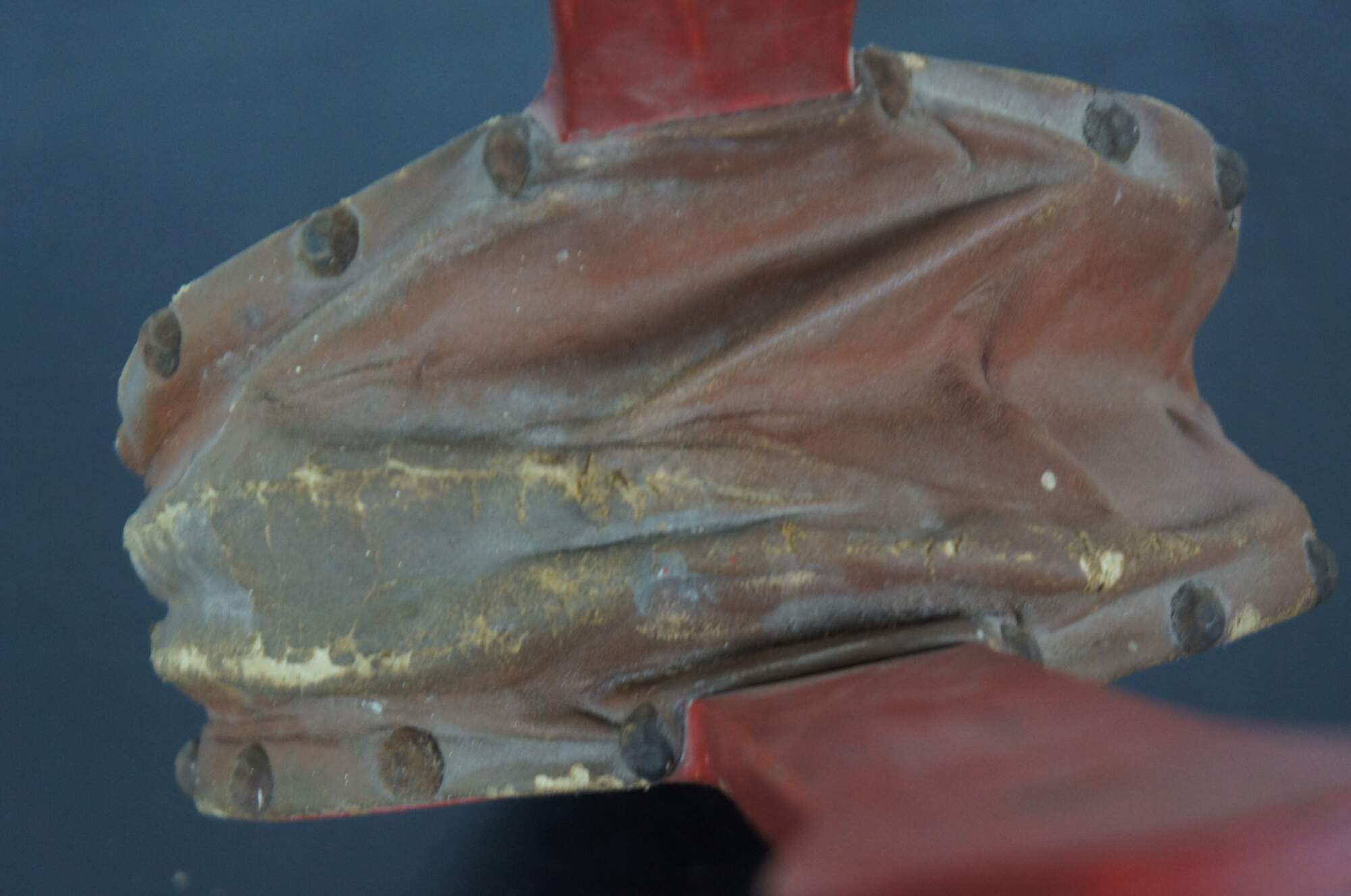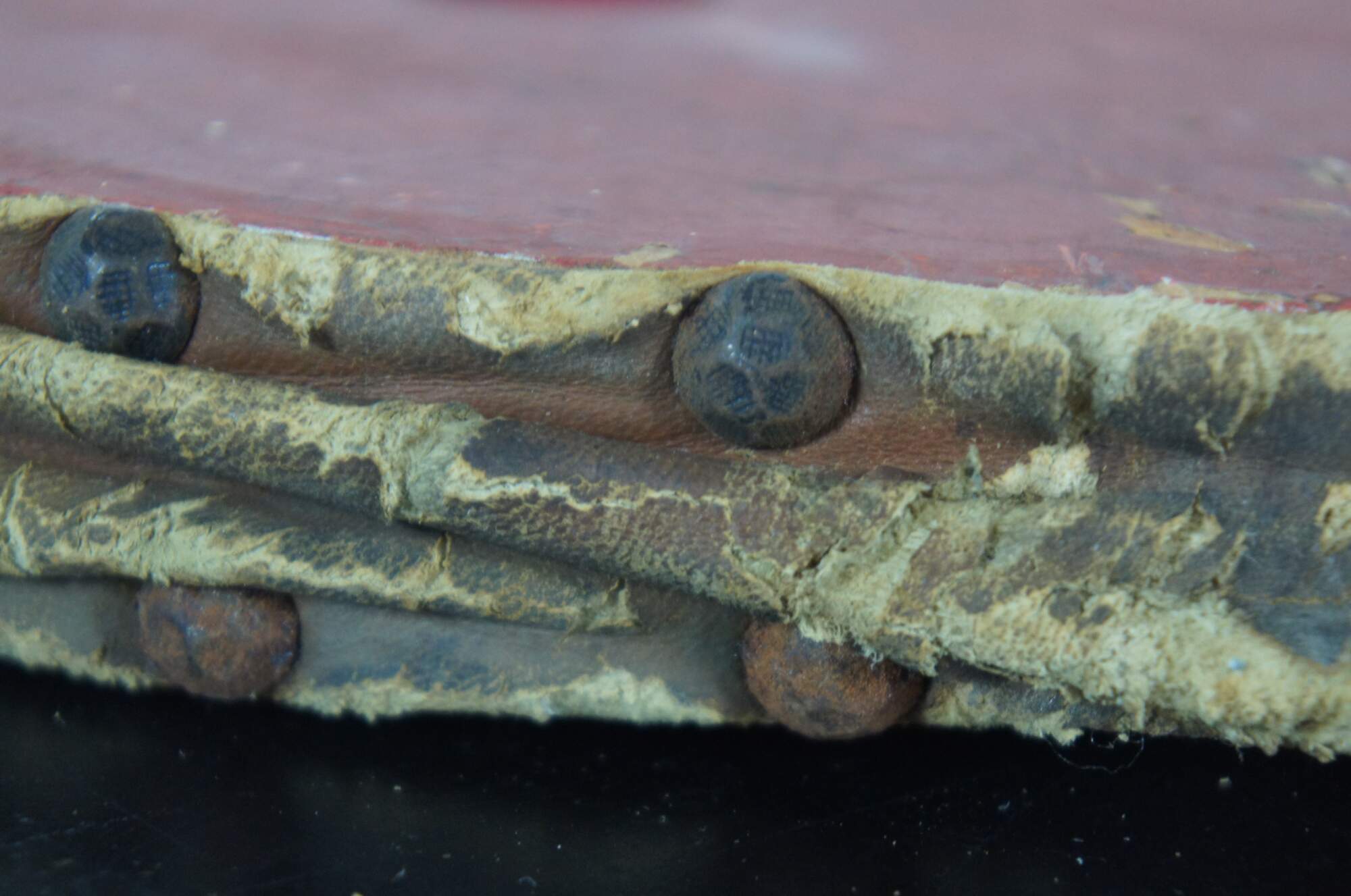 Antique wood and leather fireplace bellows, painted red and studded with hammered nail heads.