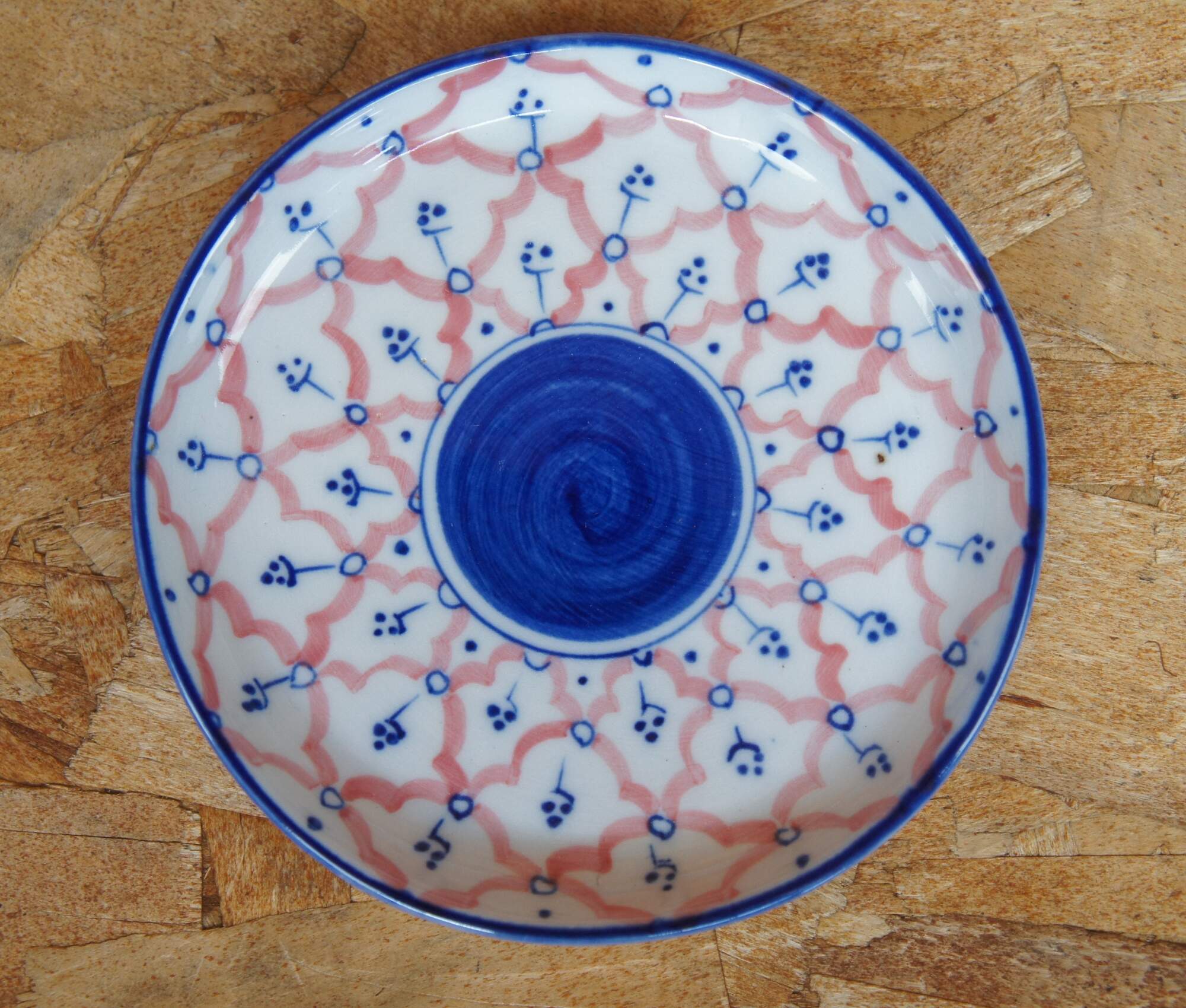 Two vintage miniature porcelain childs / doll tea sets featuring a hand painted cobalt blue and pink pattern. Includes tea/coffee pots, creamers, sugars, cups, saucers, trays and lids.