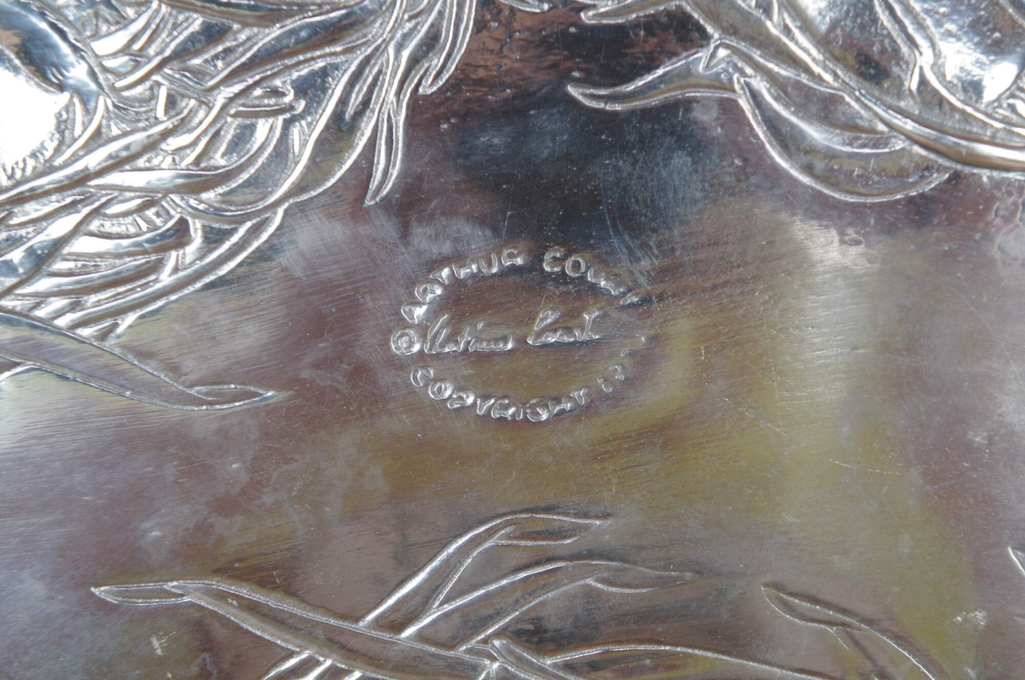 Aluminum hunt platter by Arthur Court designs depicting a scene with pheasants / roosters / chickens / eggs / baby chicks in a nest.