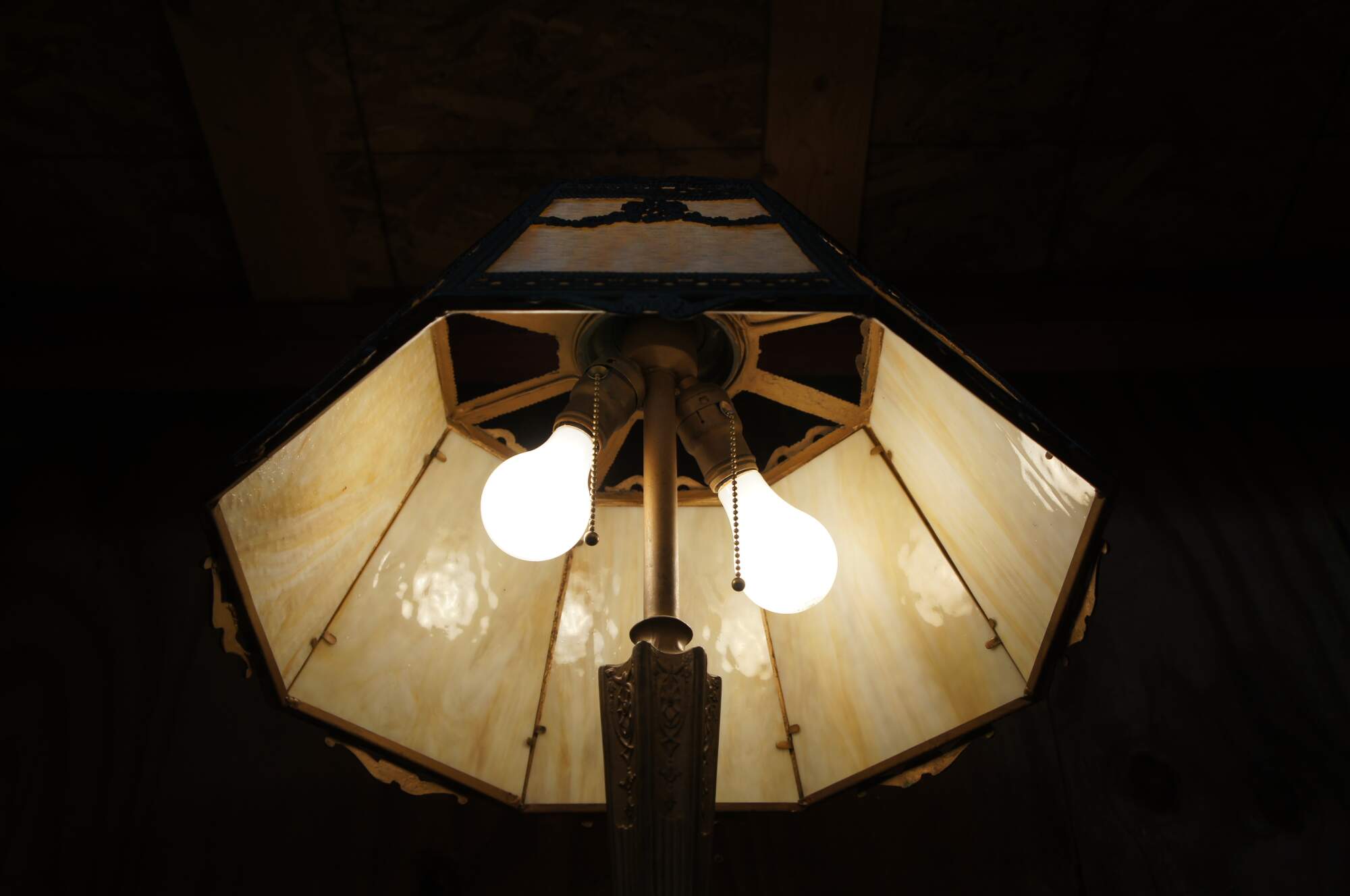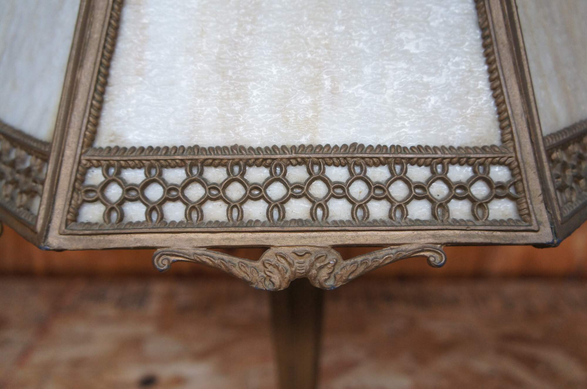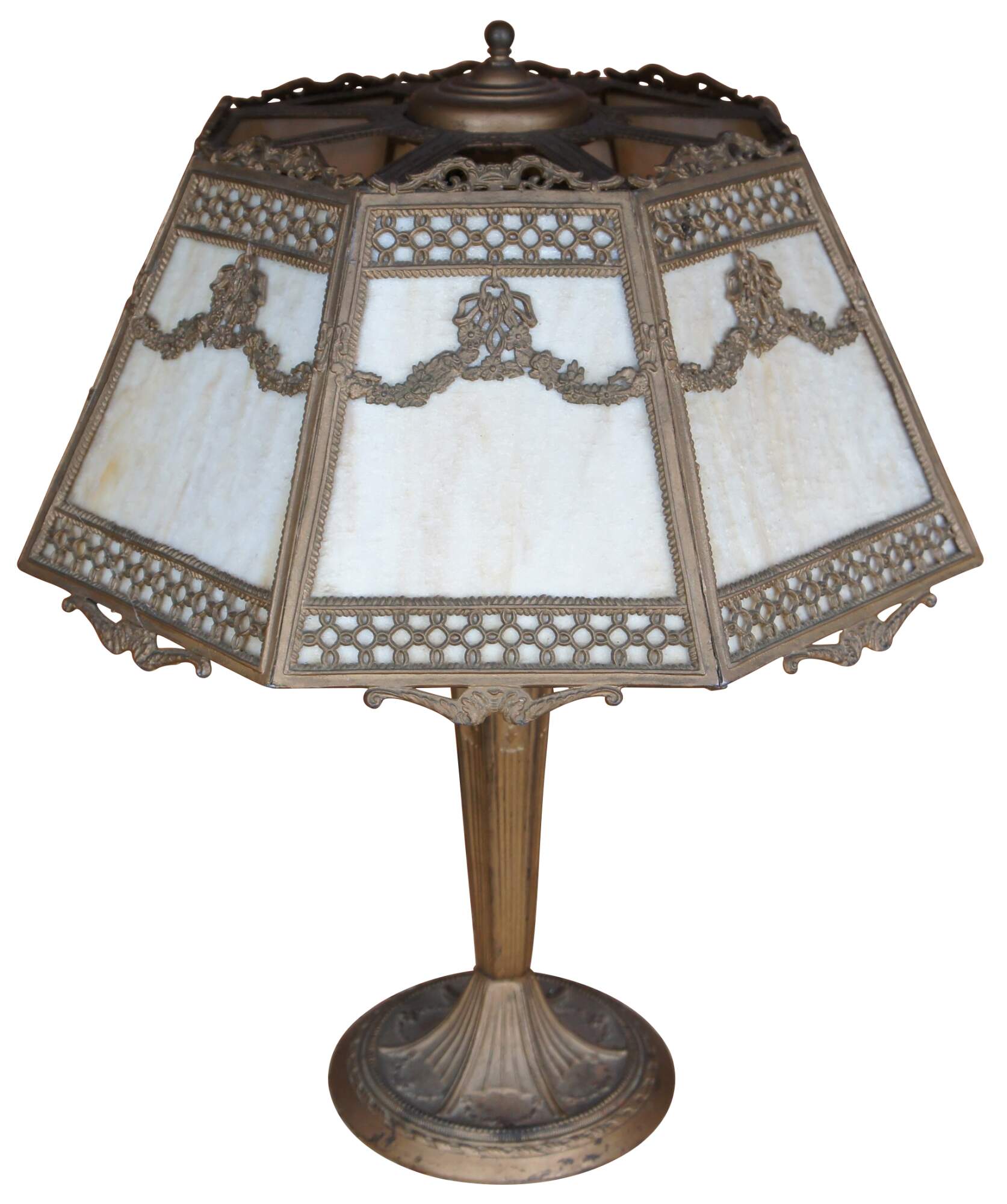 Antique Victorian cast iron library, desk or parlor lamp featuring slag glass filigree / reticulated shade and neoclassical styling.