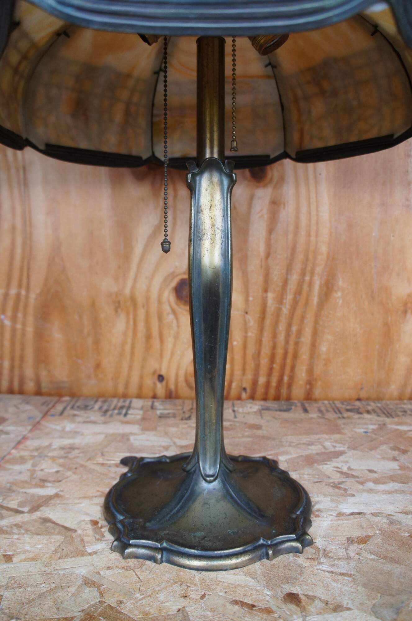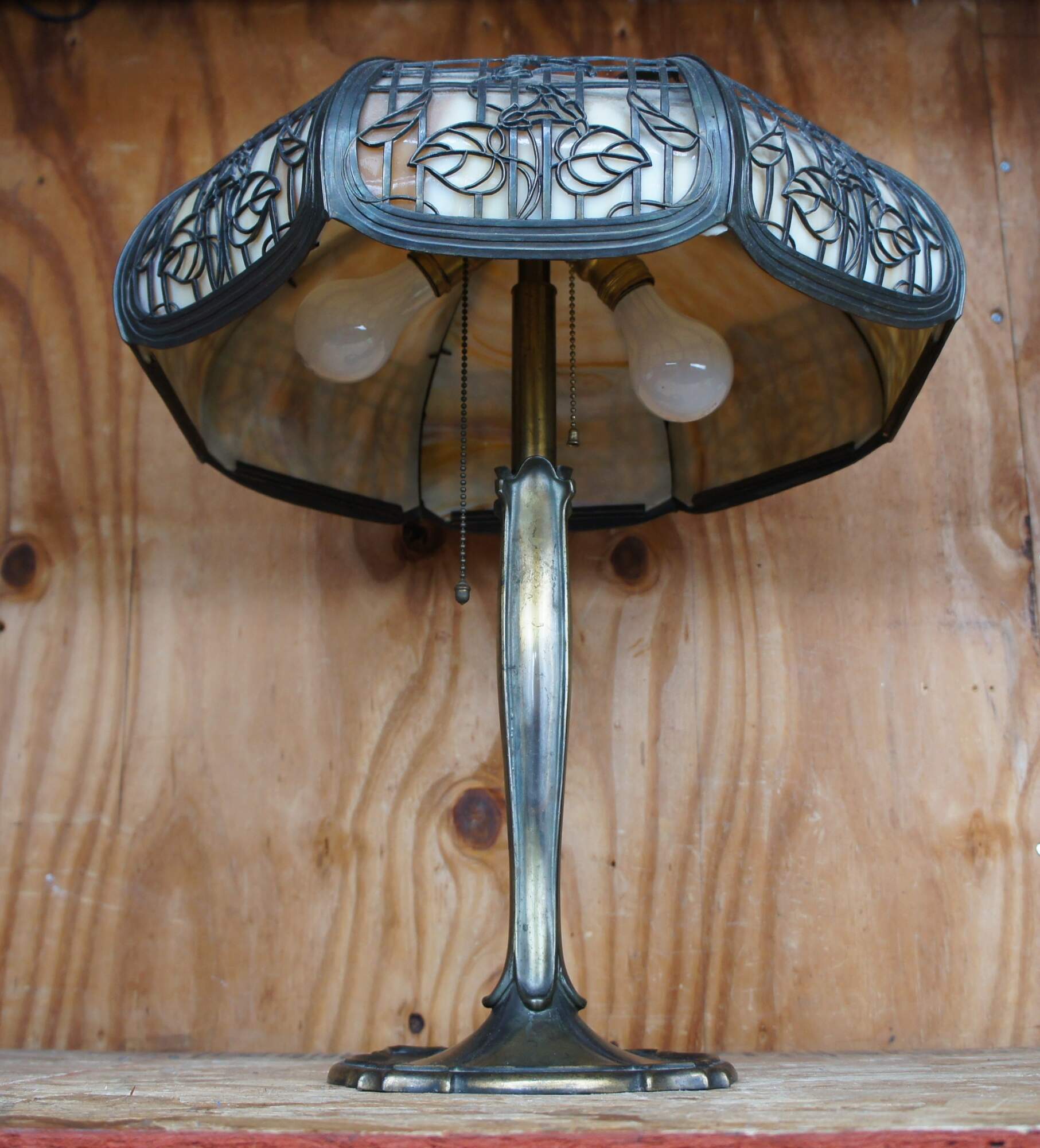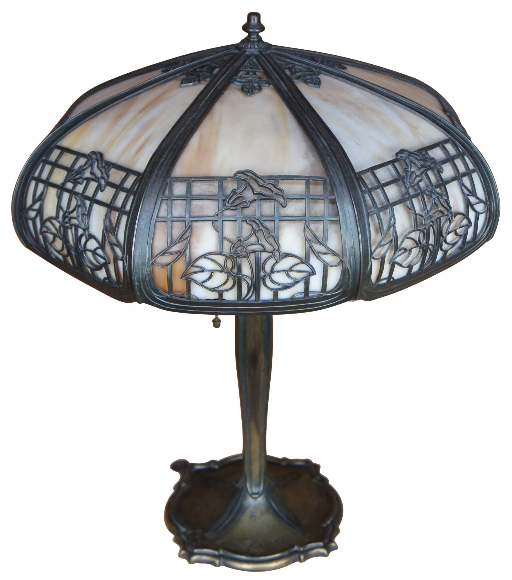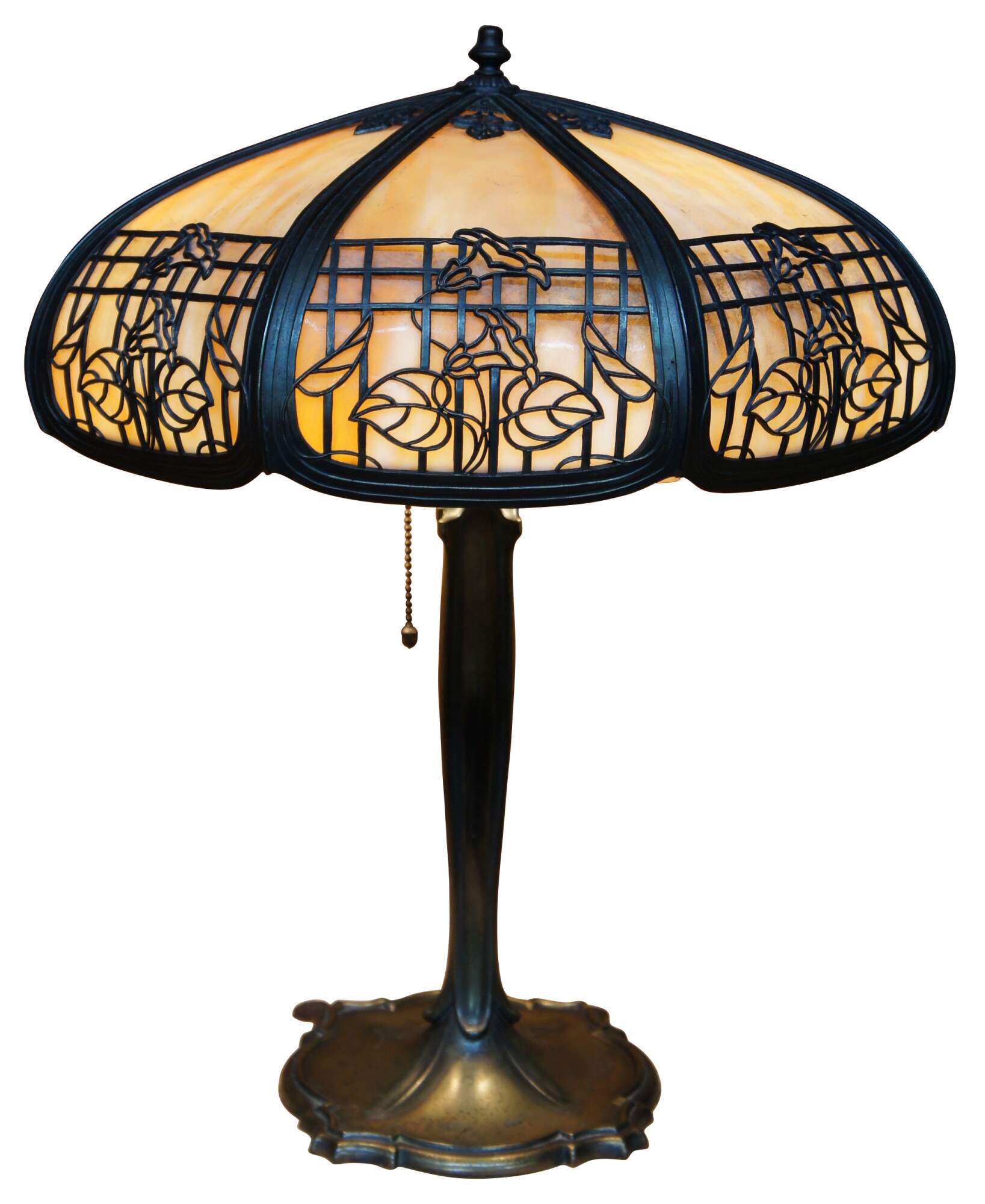 Antique Victorian Art Nouveau cast iron and slag glass parlor lamp featuring a reticulated filigree “morning glory trellis” rose design and acorn pull chain. Attributed to the Chicago Empire Lamp Company, circa 1910.