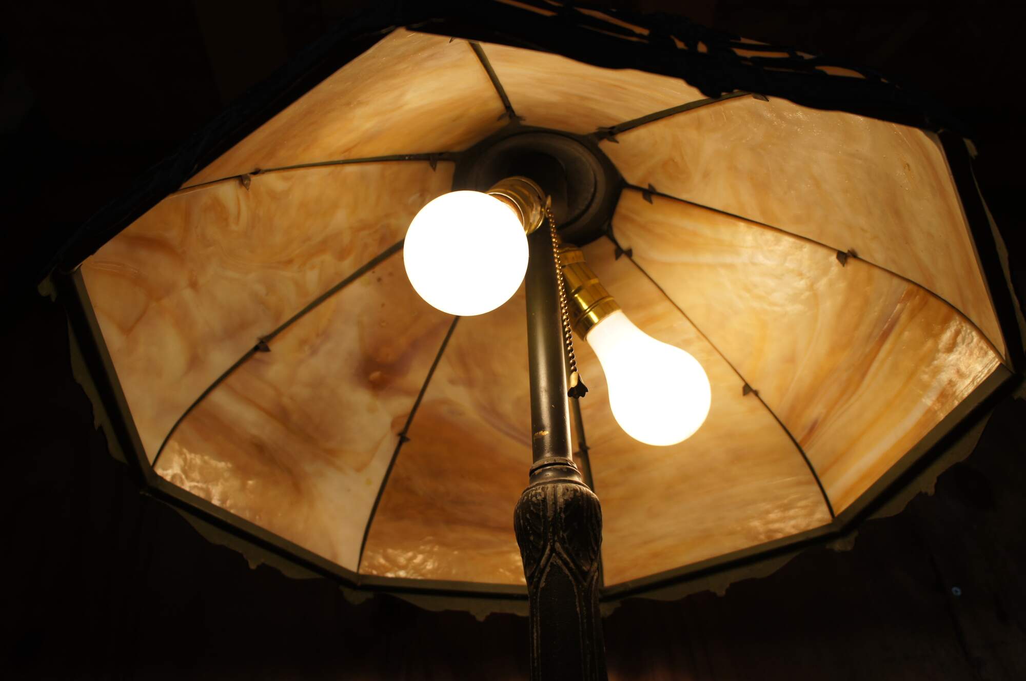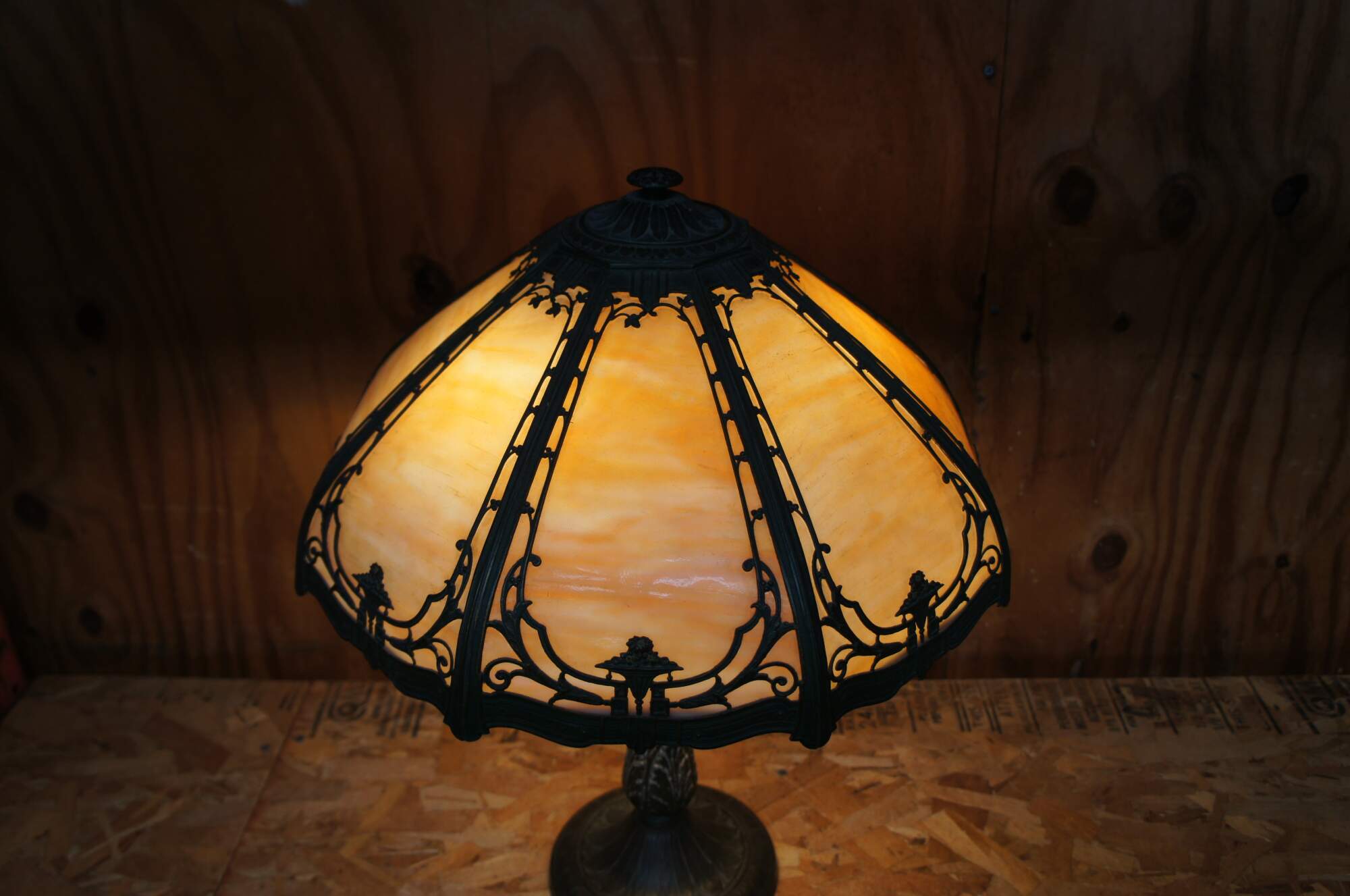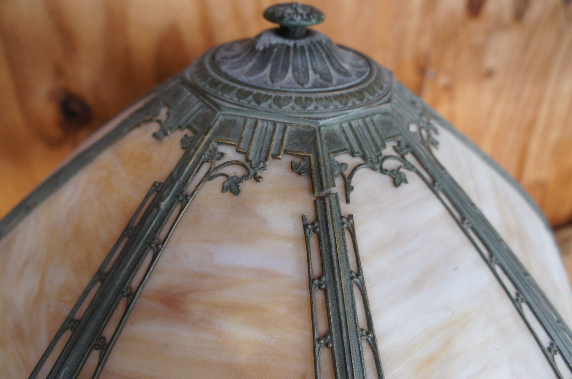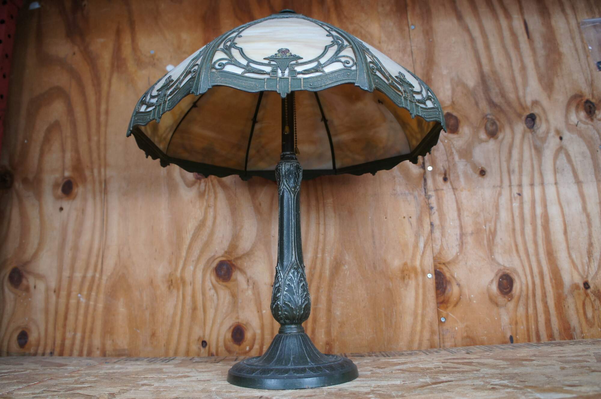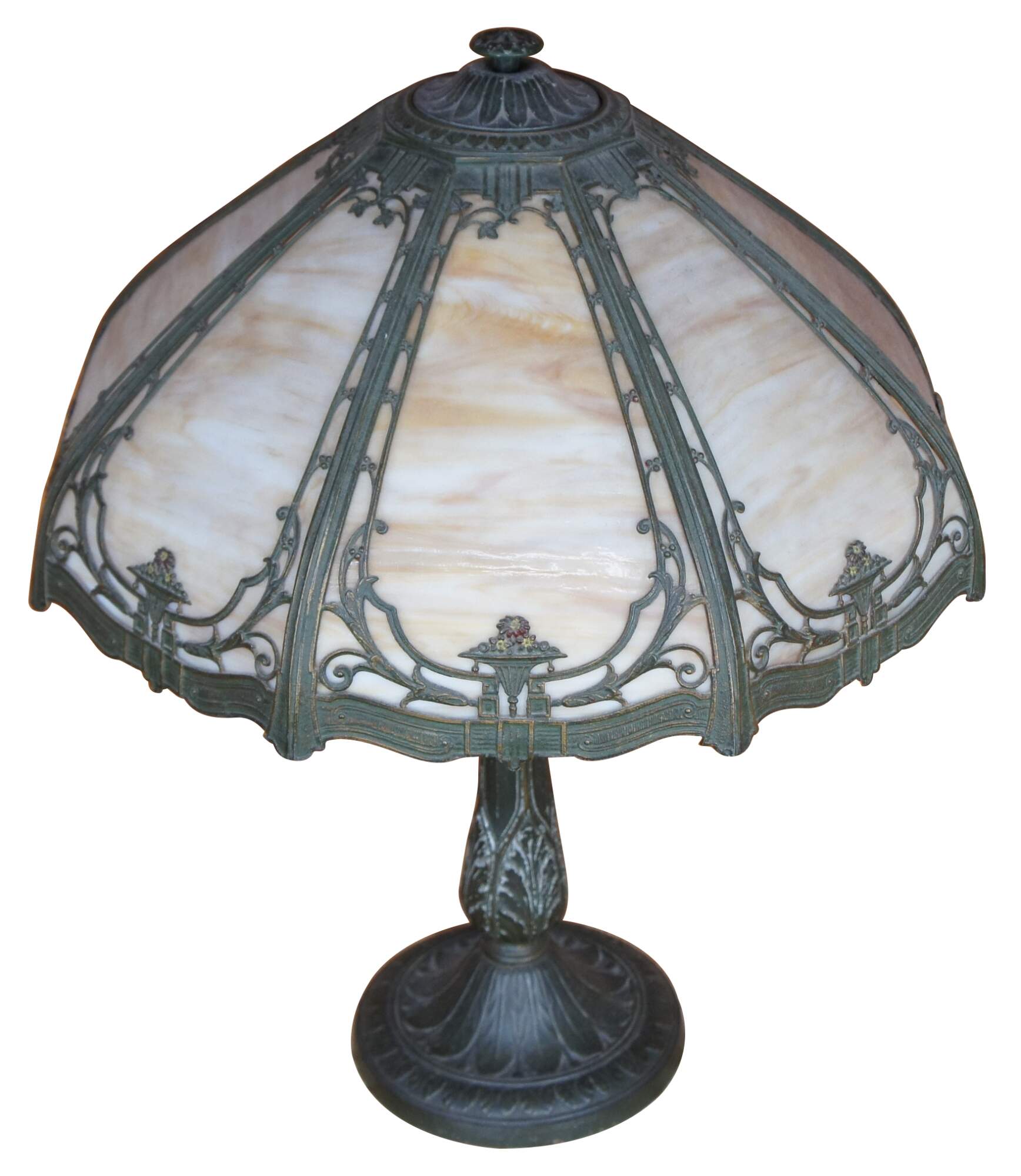 Antique Victorian Rainaud A&R Co cast iron slag glass lamp featuring Neoclassical styling with a round six panel reticulated filigree shade and hexagon base. Circa 1920s, Newark, NJ.