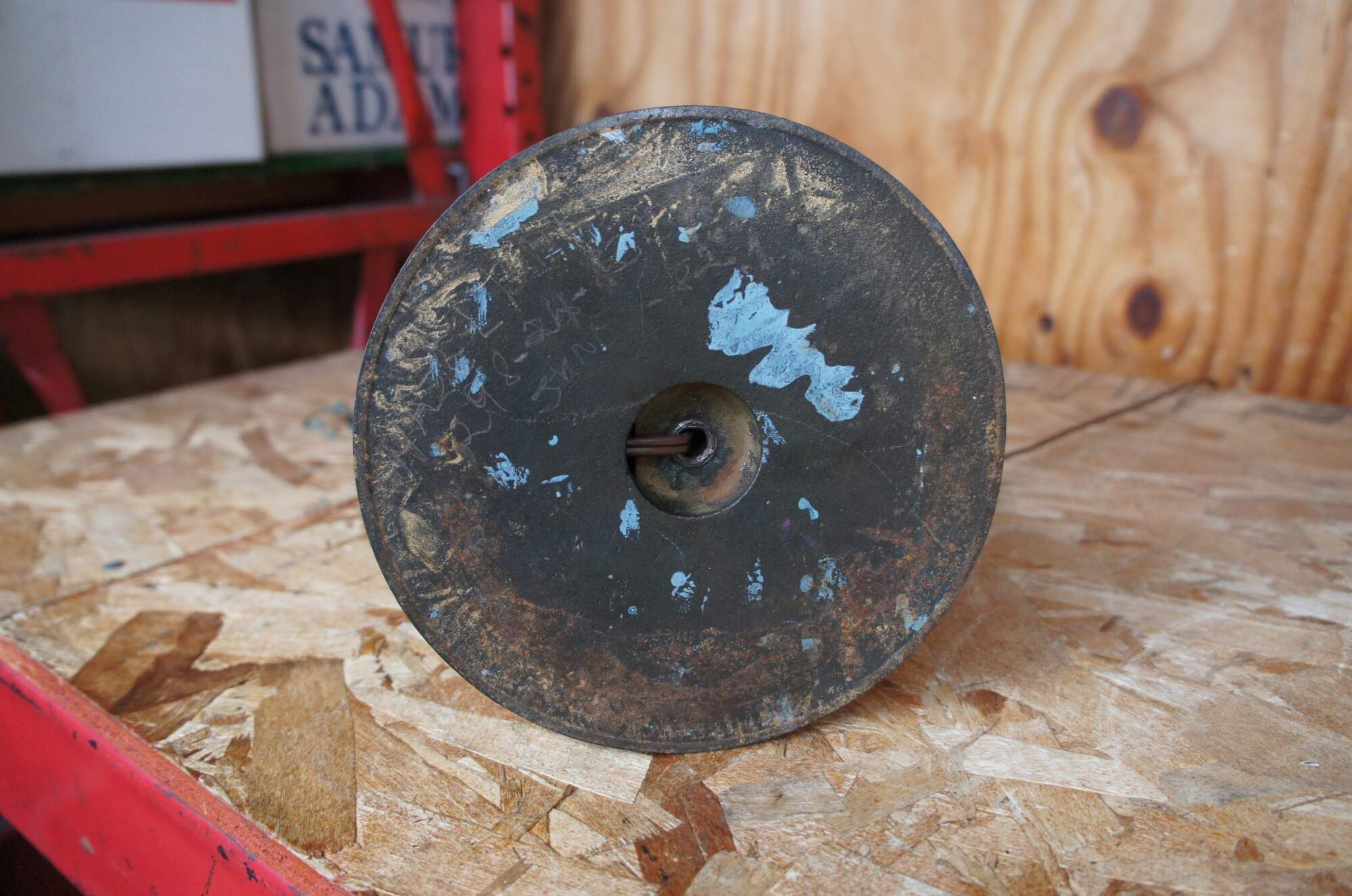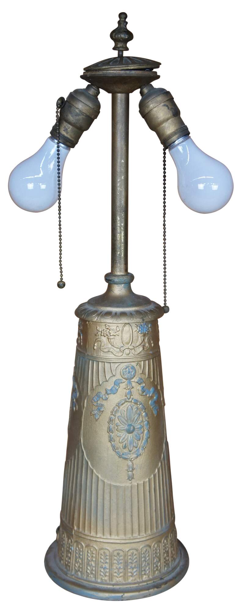 Good antique condition, wear and distressing commensurate with age and use, wear to finish, past reinforcements to shade, rust.