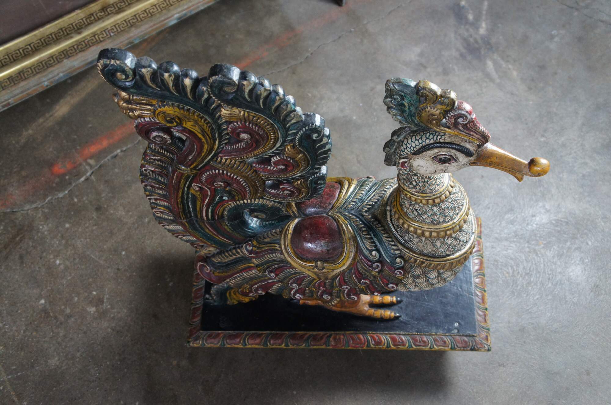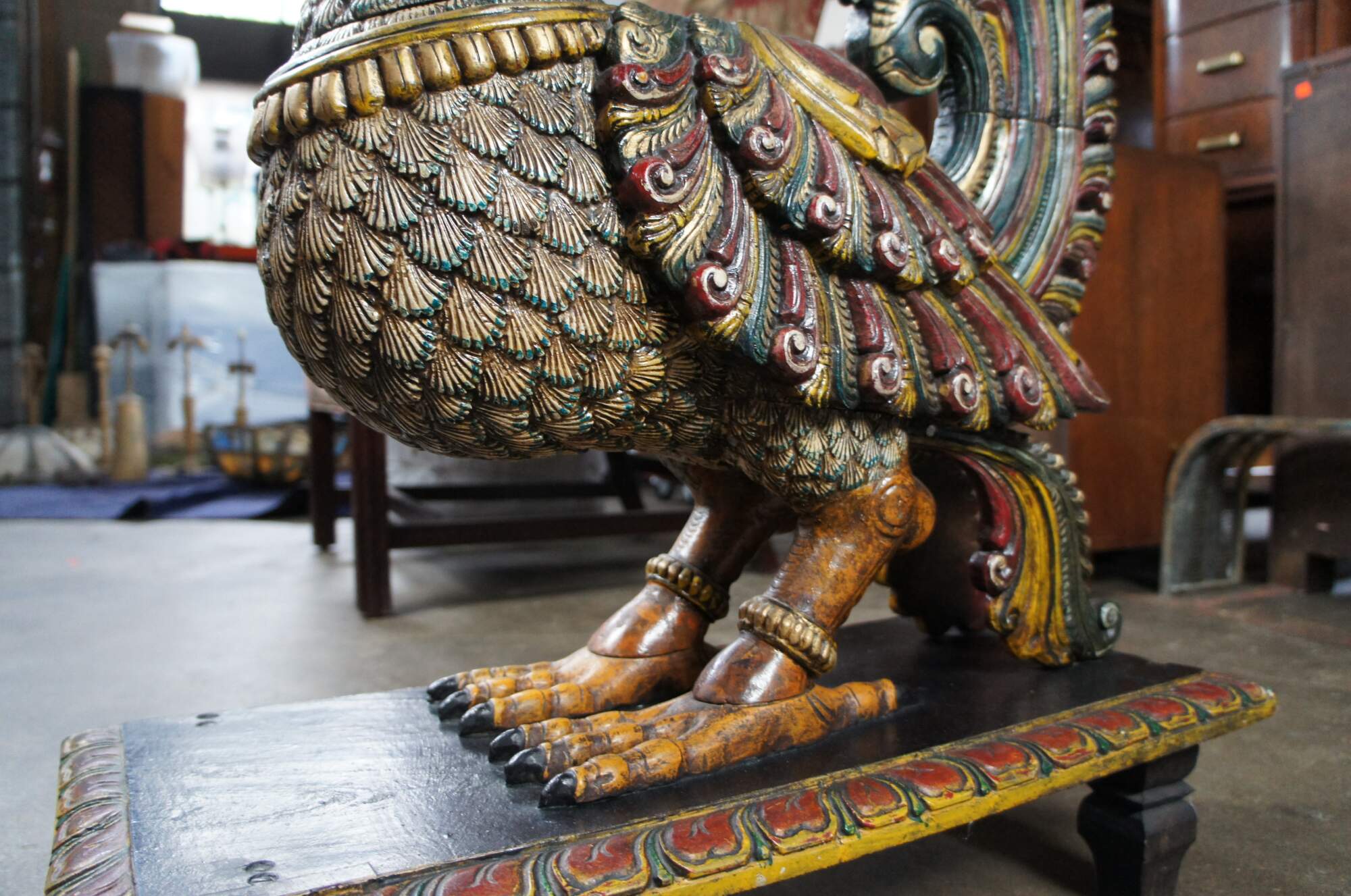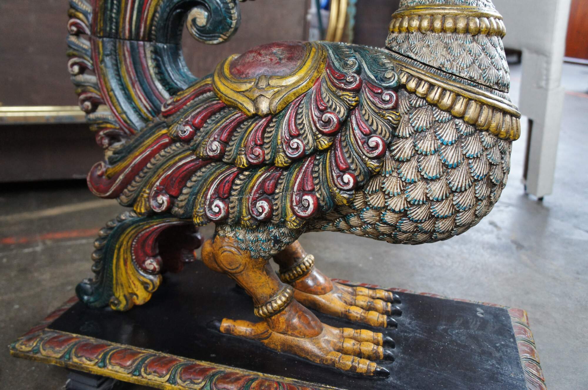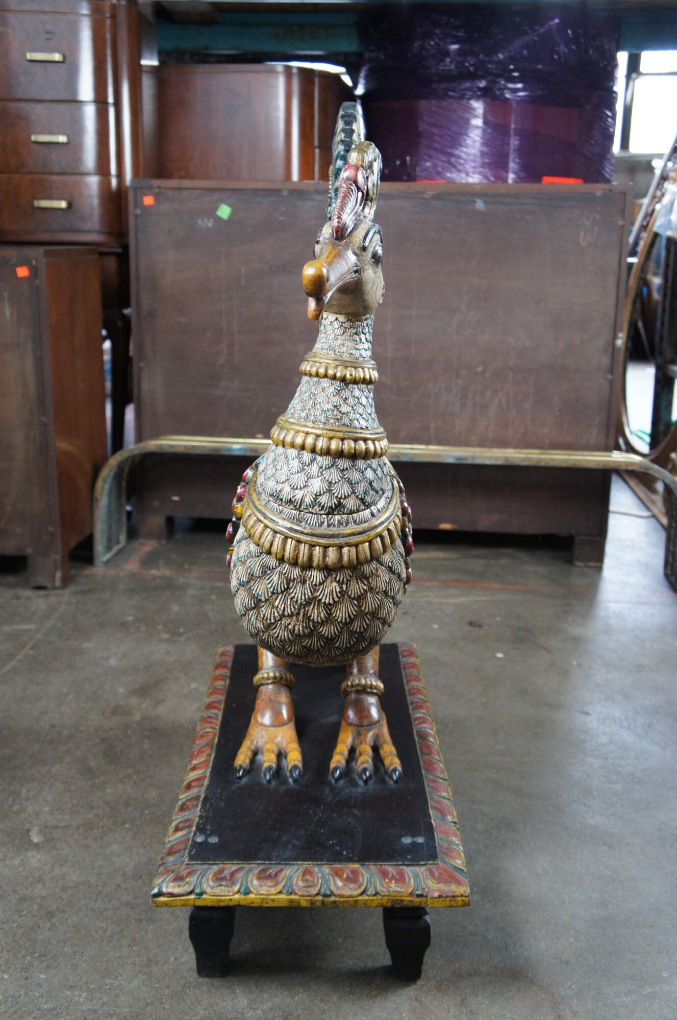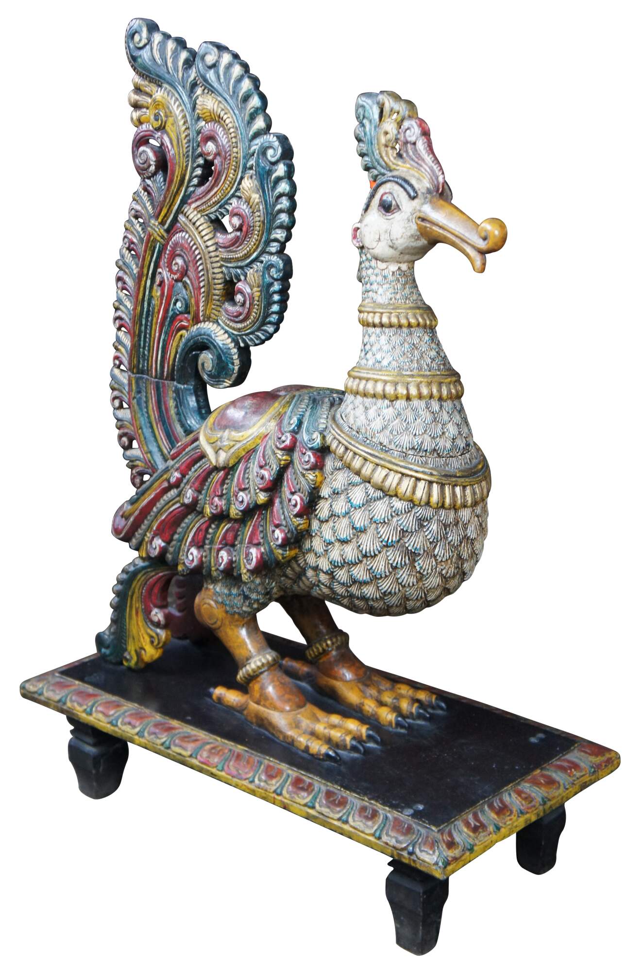 20th century South Indian carved and painted Peacock statue. A folk art sculpture hand carved on a plinth base. Features bright colors of yellow, green, red and orange. A large sculpture with an eye catching presence on a floor, table or outcove. The peacock is the national bird of India. Peacocks are symbols of beauty, grace, and pride.