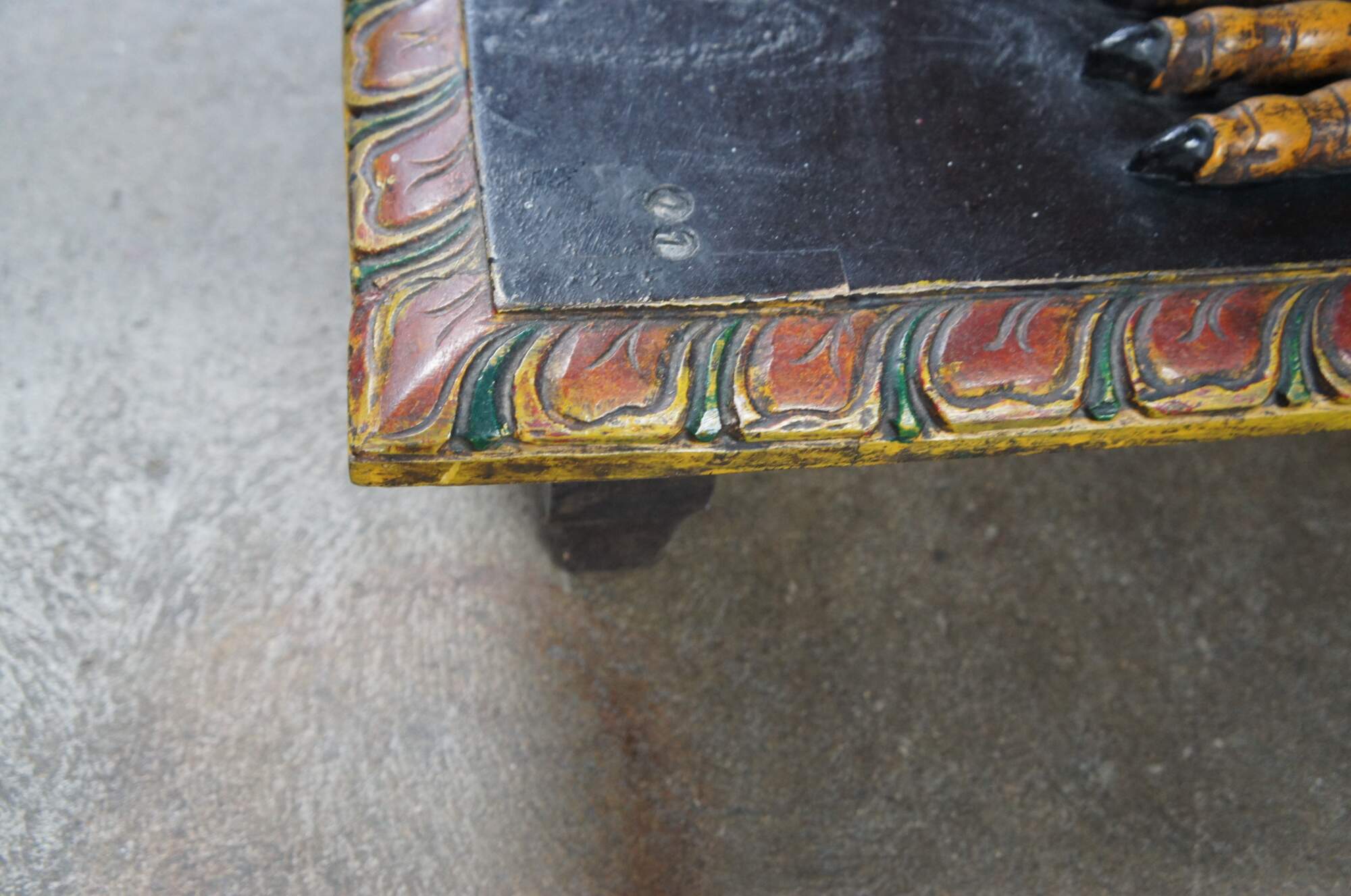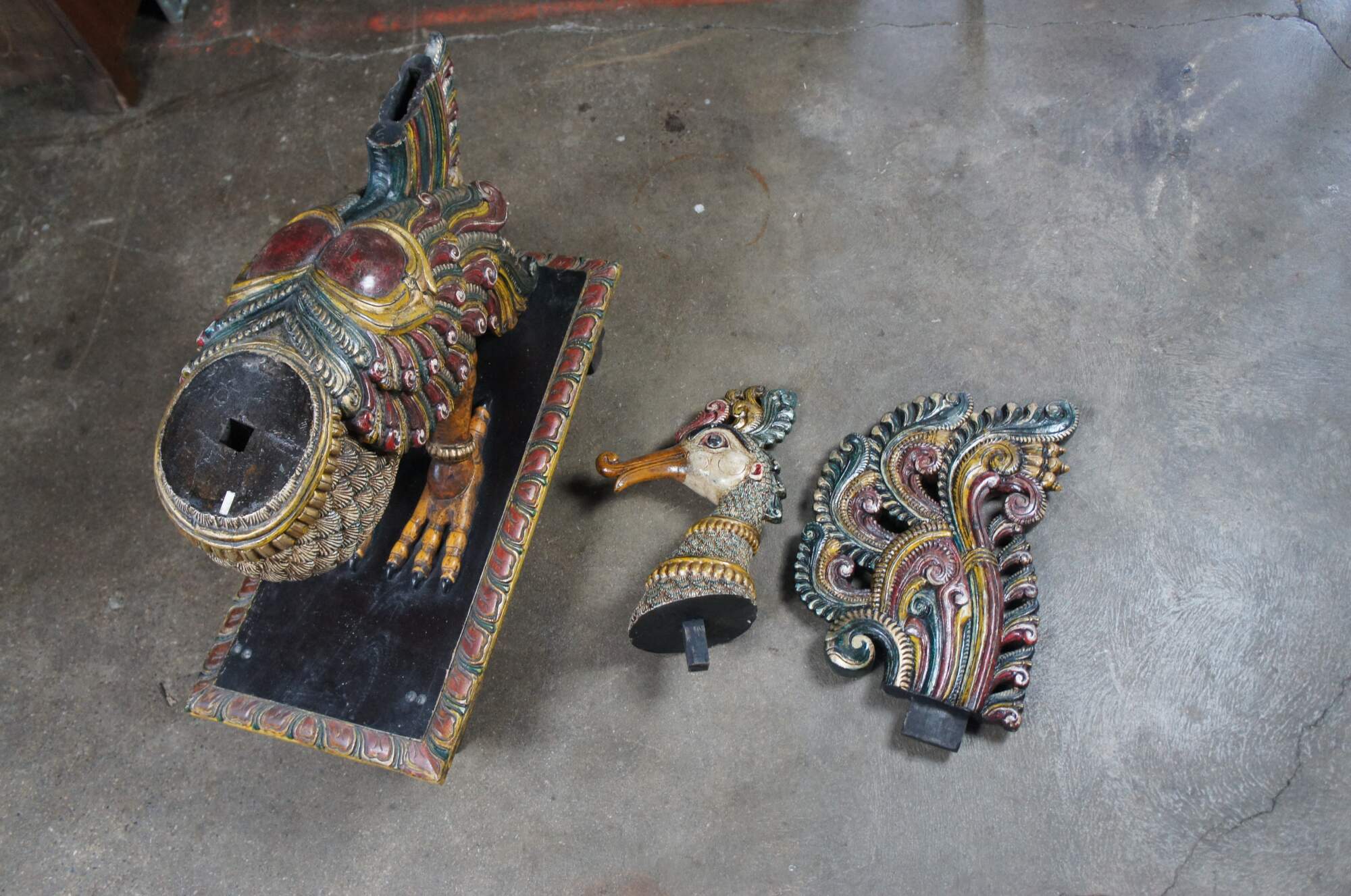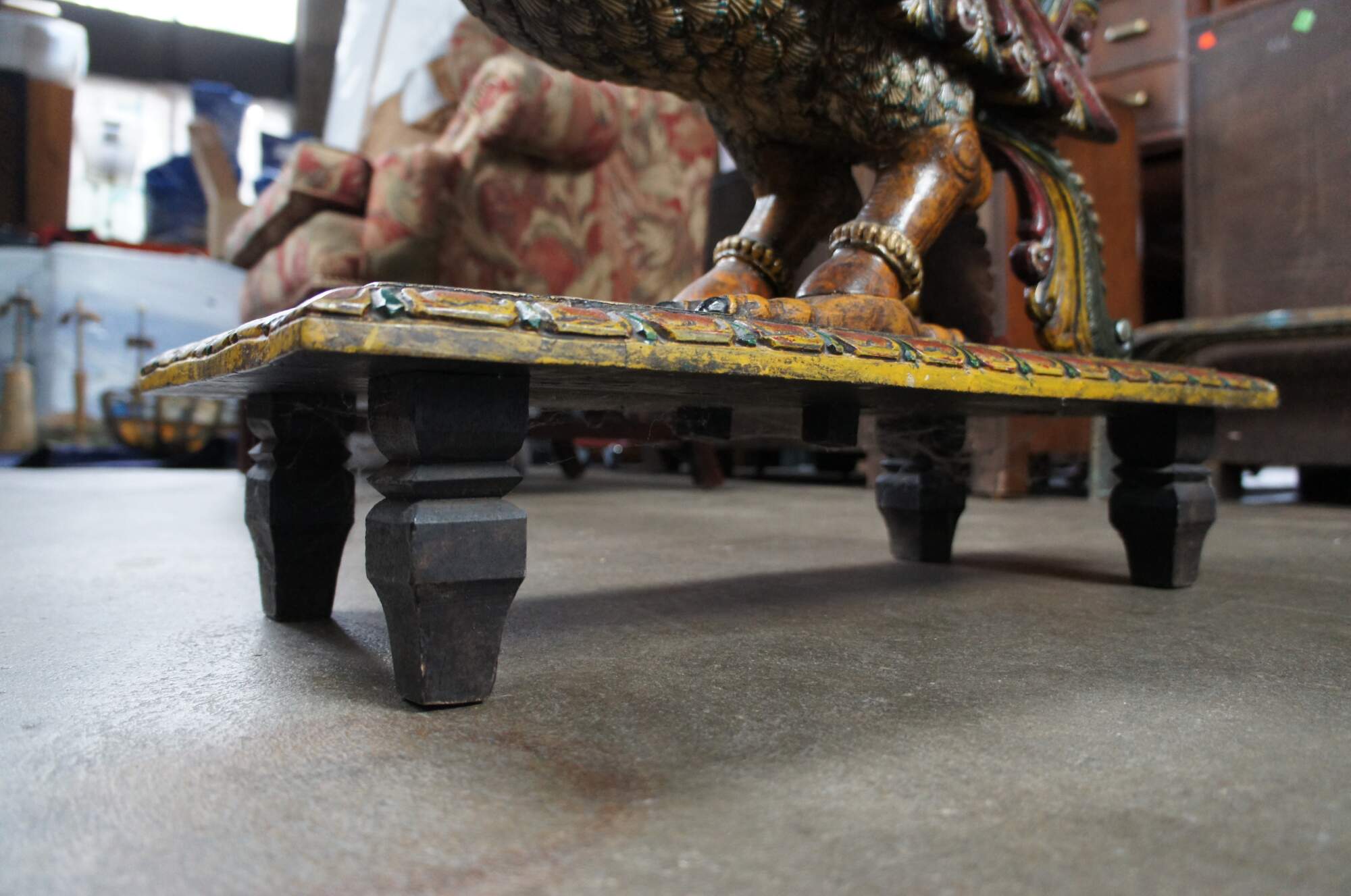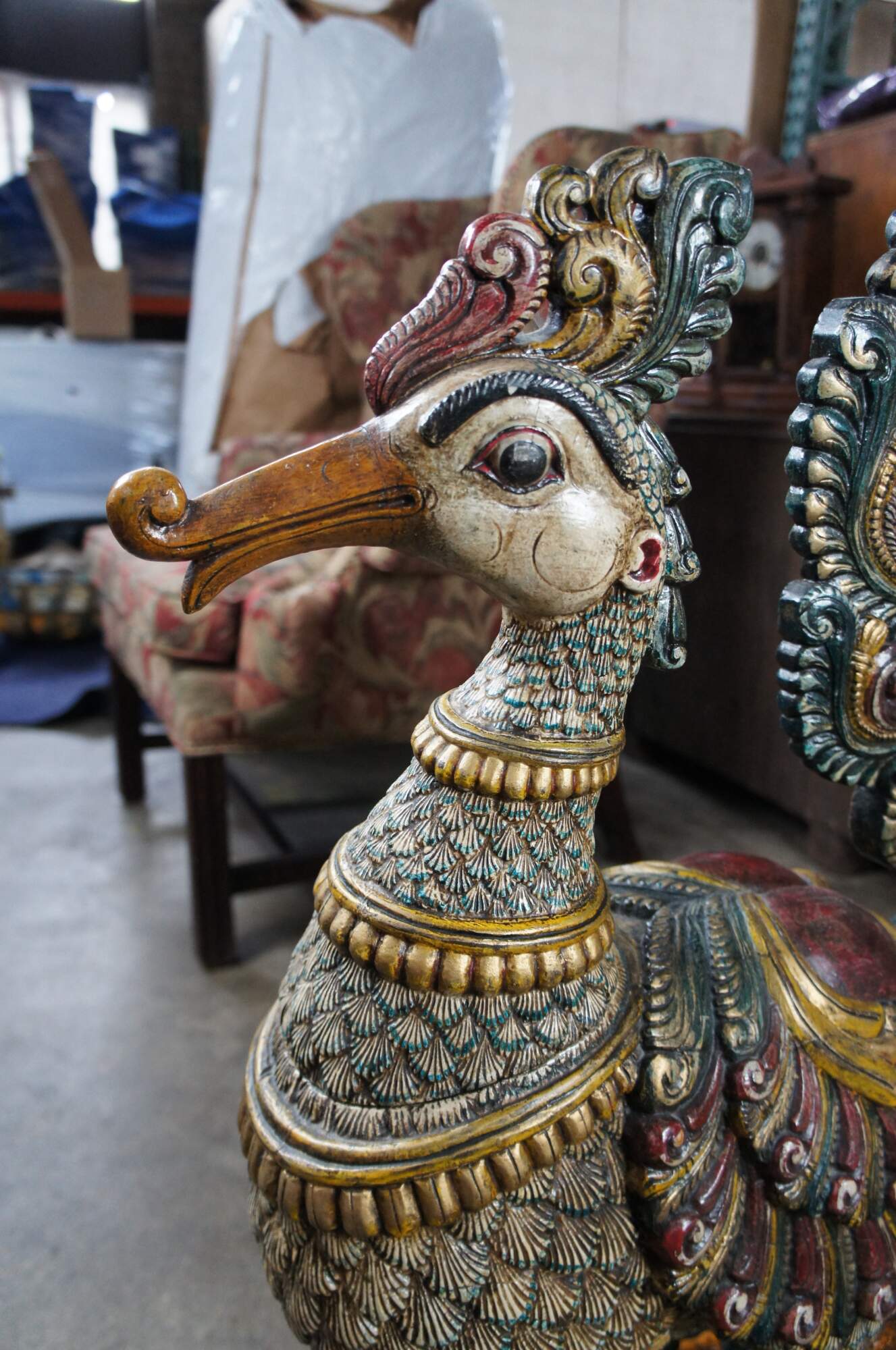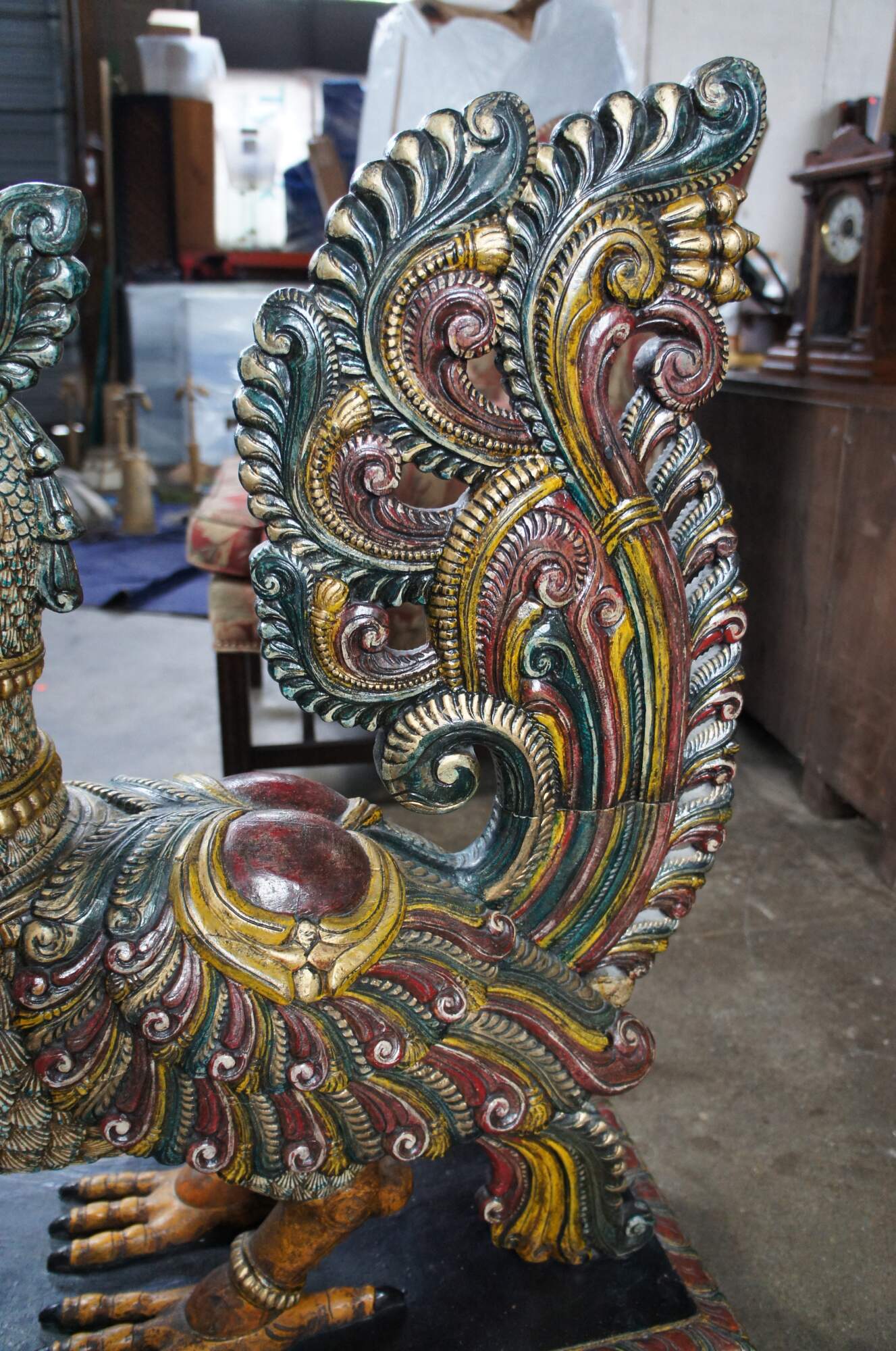20th century South Indian carved and painted Peacock statue. A folk art sculpture hand carved on a plinth base. Features bright colors of yellow, green, red and orange. A large sculpture with an eye catching presence on a floor, table or outcove. The peacock is the national bird of India. Peacocks are symbols of beauty, grace, and pride.