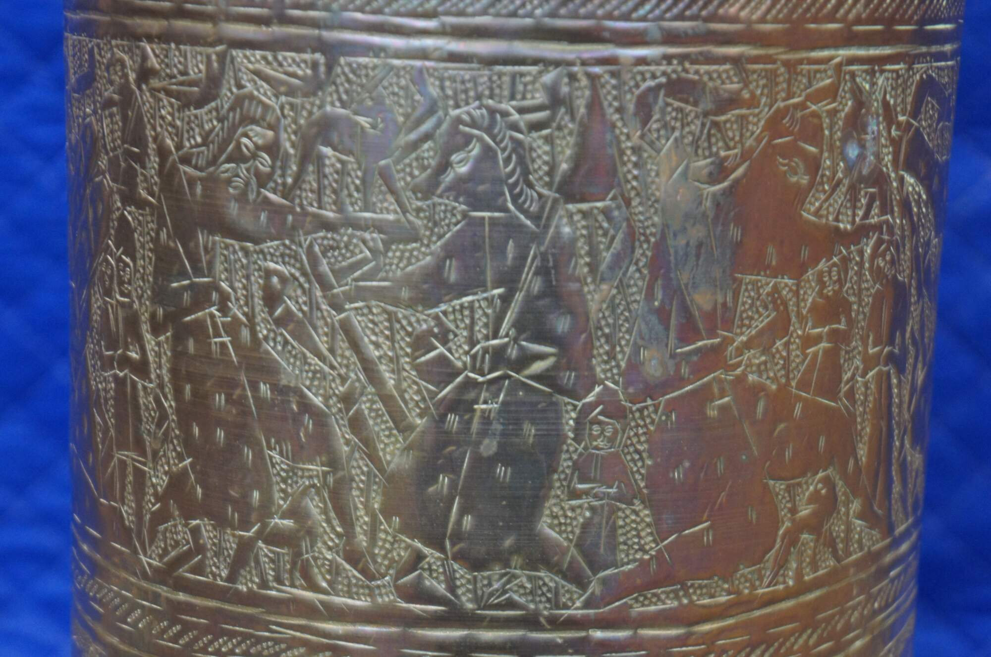 Antique brass umbrella or cane stand etched with Byzantine / Orthodox Christian motifs and figures including a cynocephalus (dog headed) Saint Christopher and Moses with horns holding the Ten Commandments, among other saintly figures dwarfing other smaller figures and animals. “The Orthodox icon of St-Christopher presents him as a warrior cynocephalus, a dog-headed man from Lycea. Sometimes he is also of gigantic size as well. According to his tradition, he was a Roman soldier taken from the far end of the world who converted and was martyred by an Emperor. The use of dog-headed men in iconography is not limited to the icon of St-Christopher. The Dog-headed men are seen as the farthest race present at Pentecost. Another perspective on this tradition is that it stems from a linguistic error. Christopher was a Canannite, which in Latin is Cananeus. Change one letter of the Latin and you get Canineus, or Caninite: Dog-men.” “In ancient Middle-Eastern iconography, horns are a common way of expressing the strength and the power of a god or of a king representing him.”