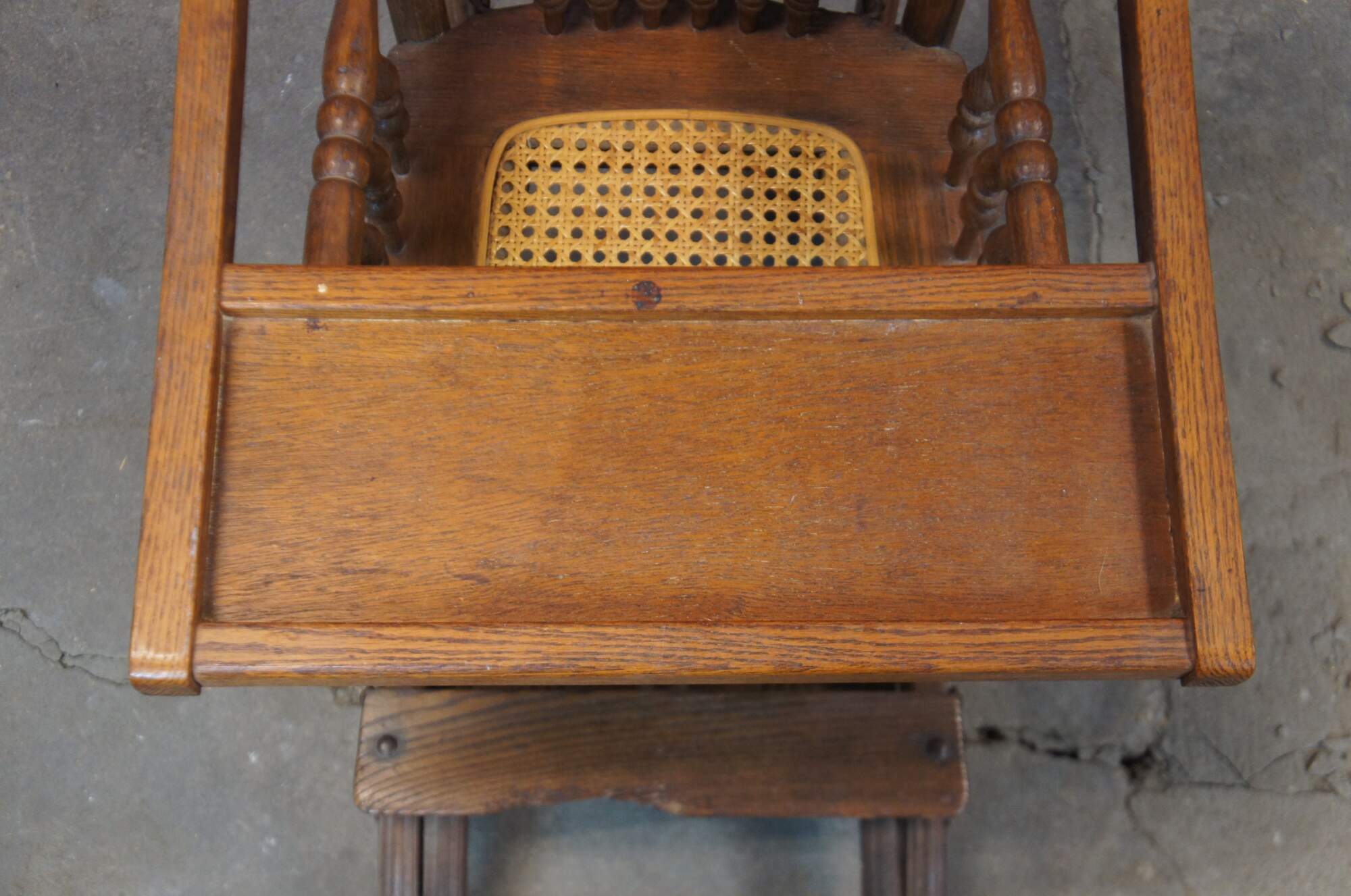 Antique Victorian pressed back oak stroller convertible to a high chair, with metal wheels, cane seat, and flip up tray.