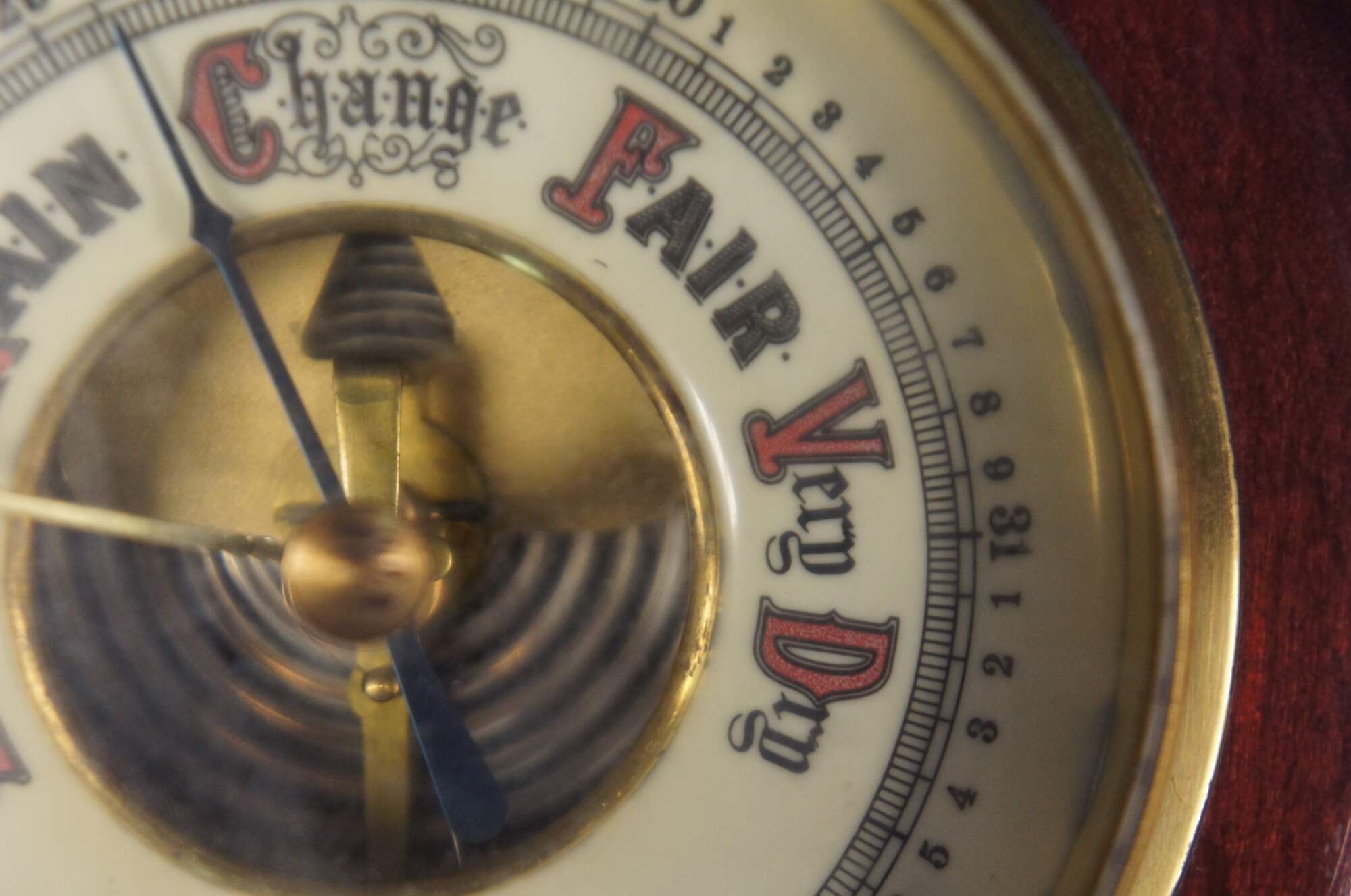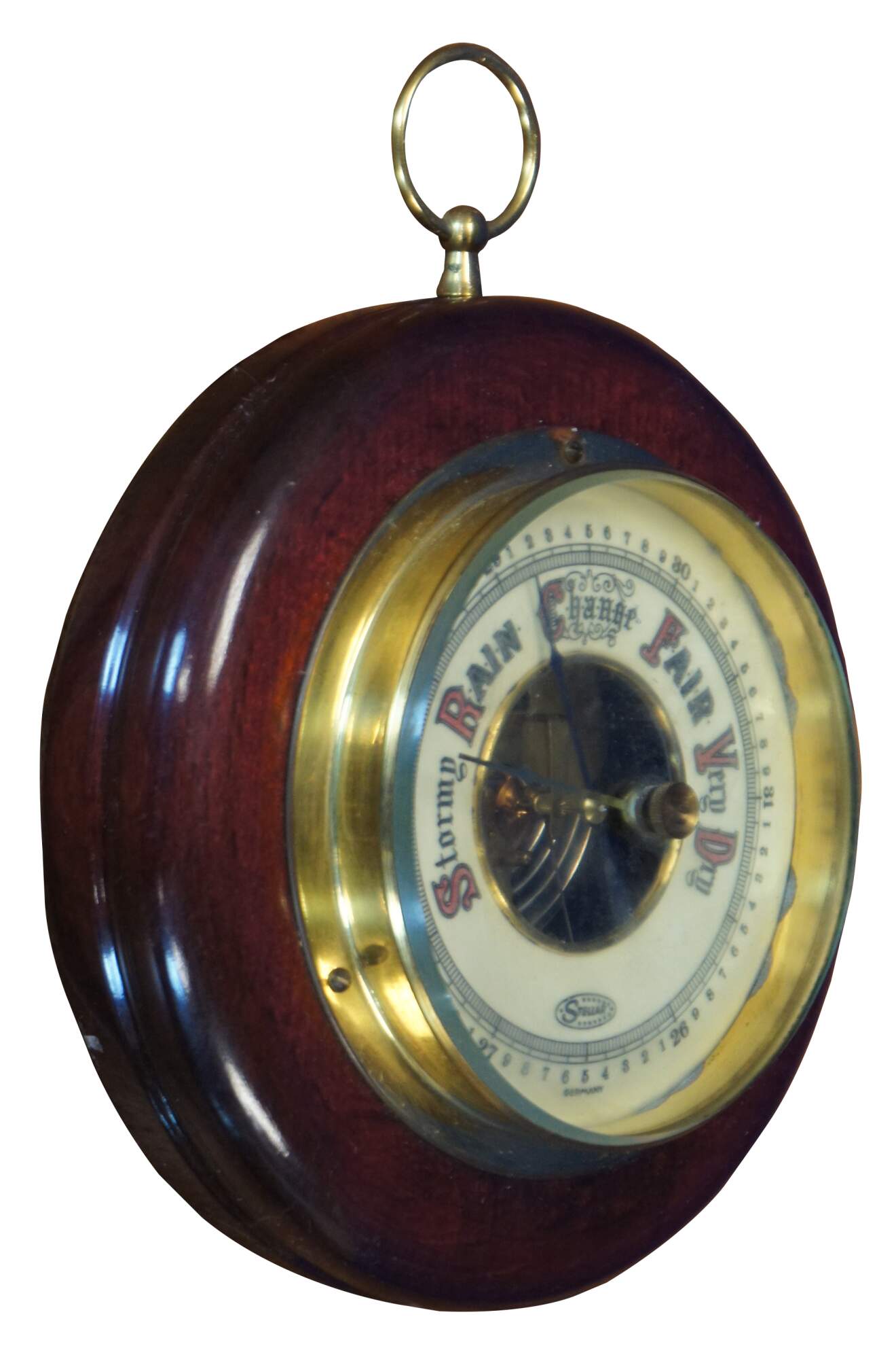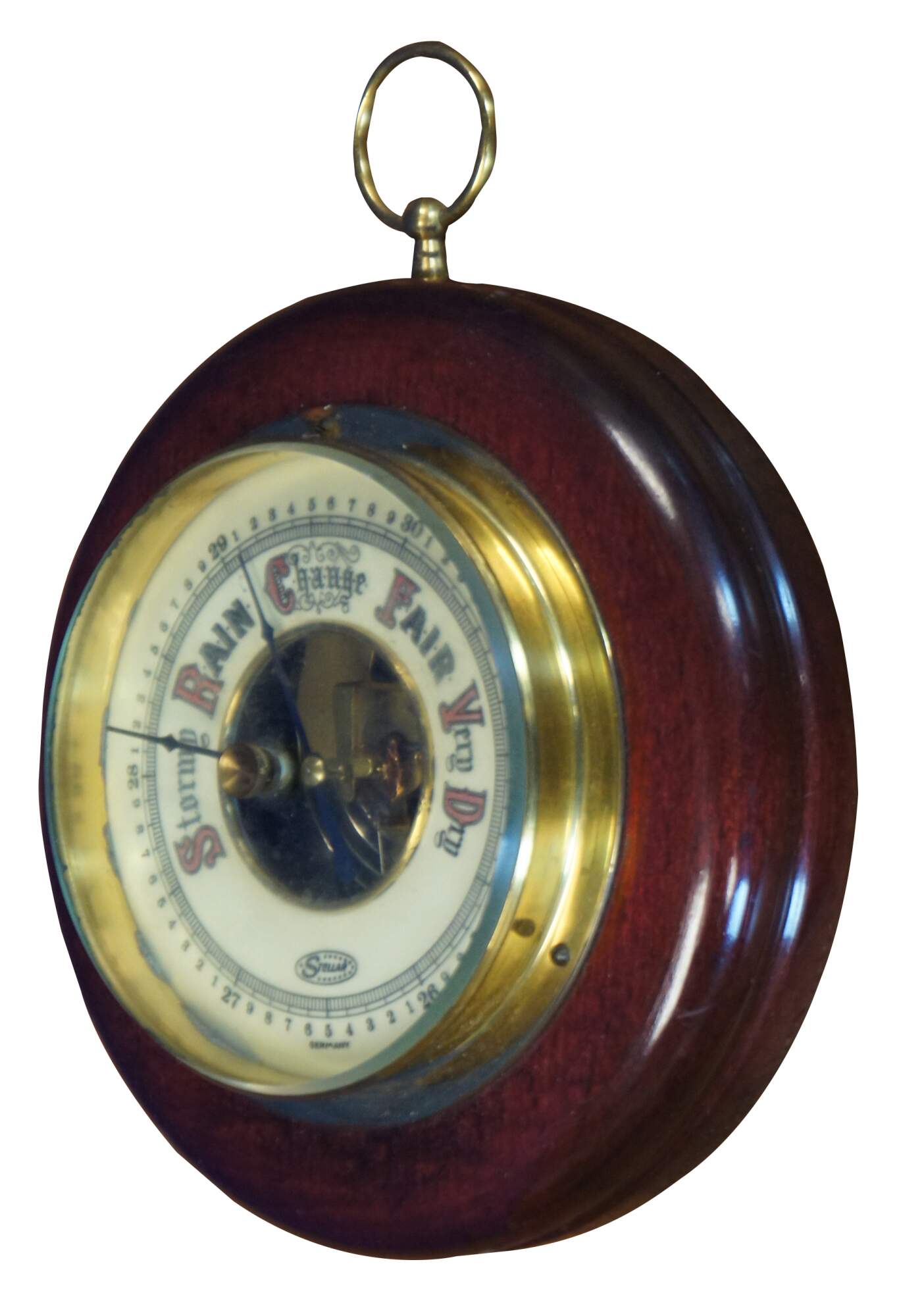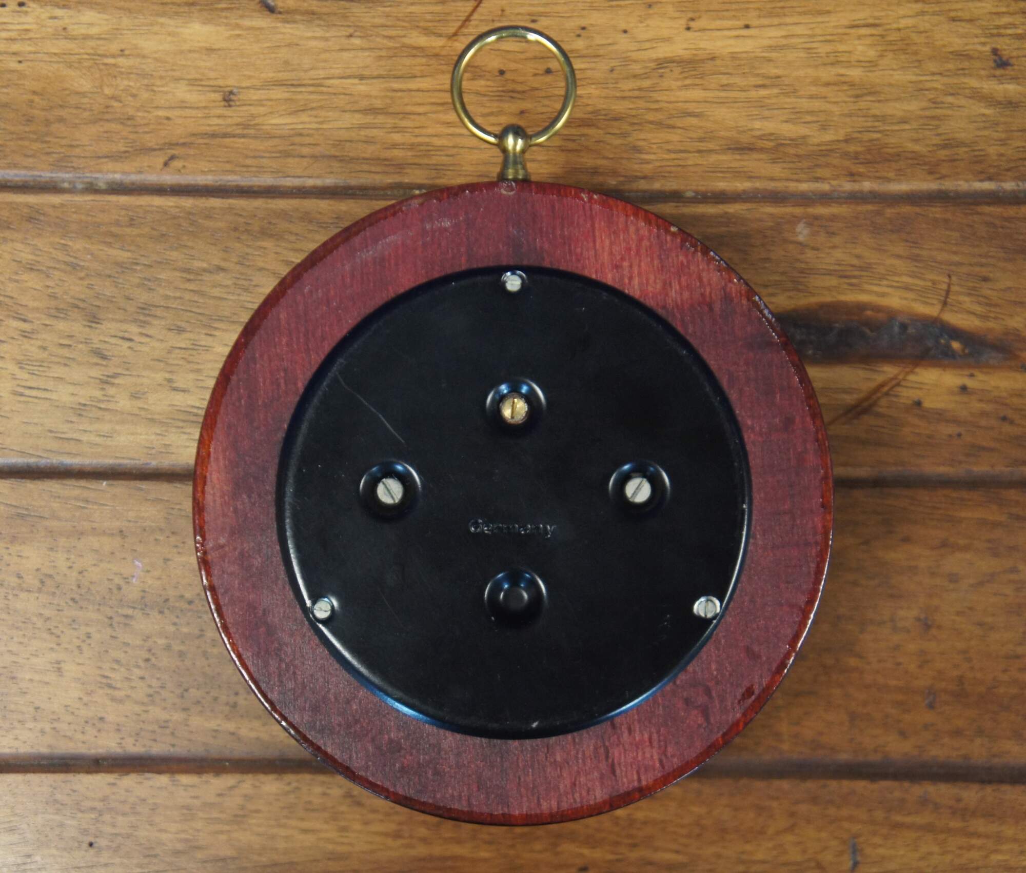 Mid century wall hanging barometer by Stellar Germany with a round pocket watch shaped wooden case and brass hanger.