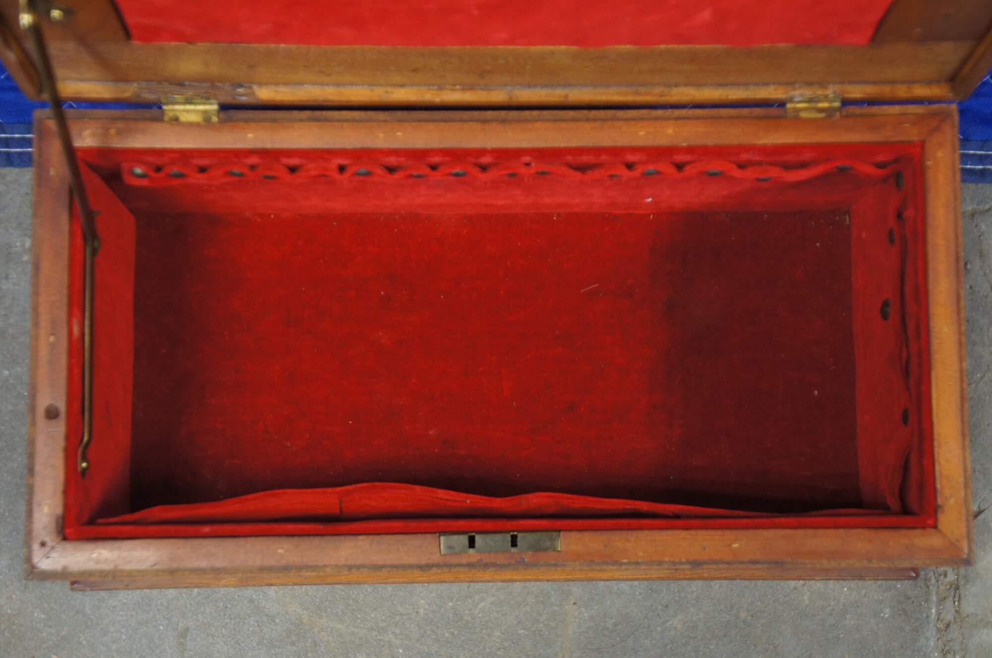 Antique red velvet lined carved and reticulated oak jewelry keepsake box or chest with handle on top and lock on the front.