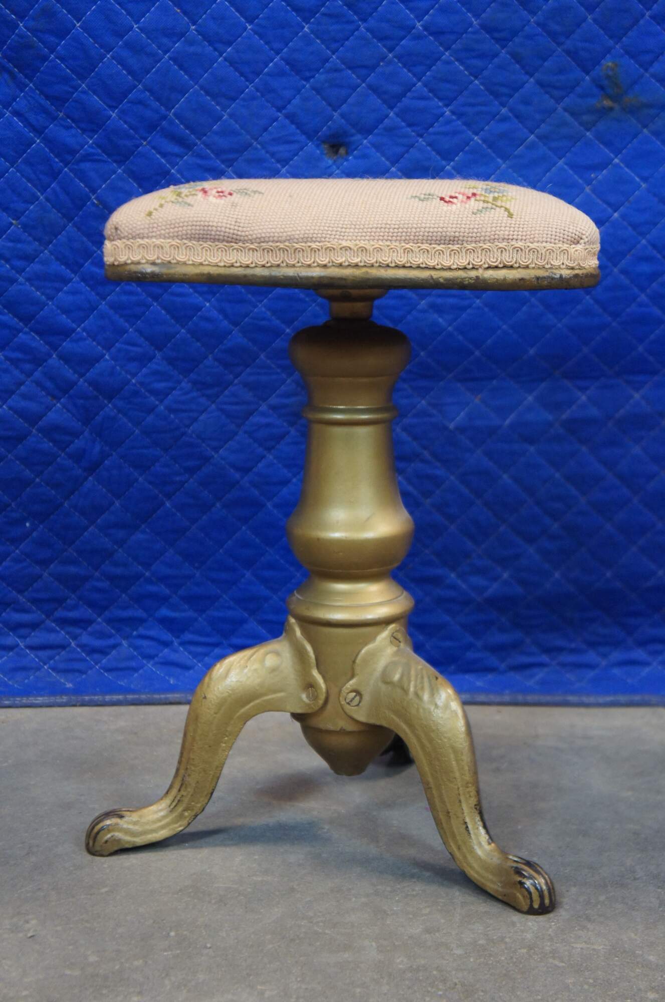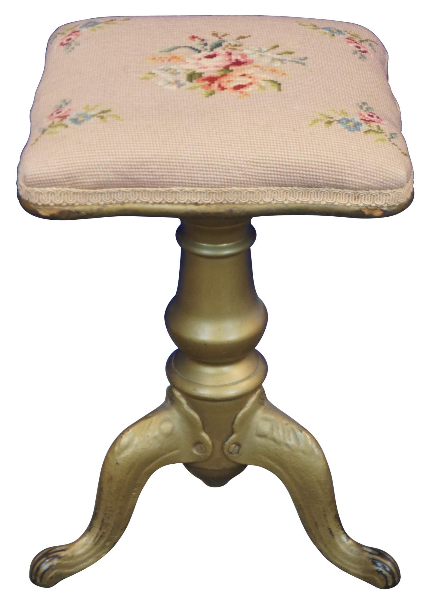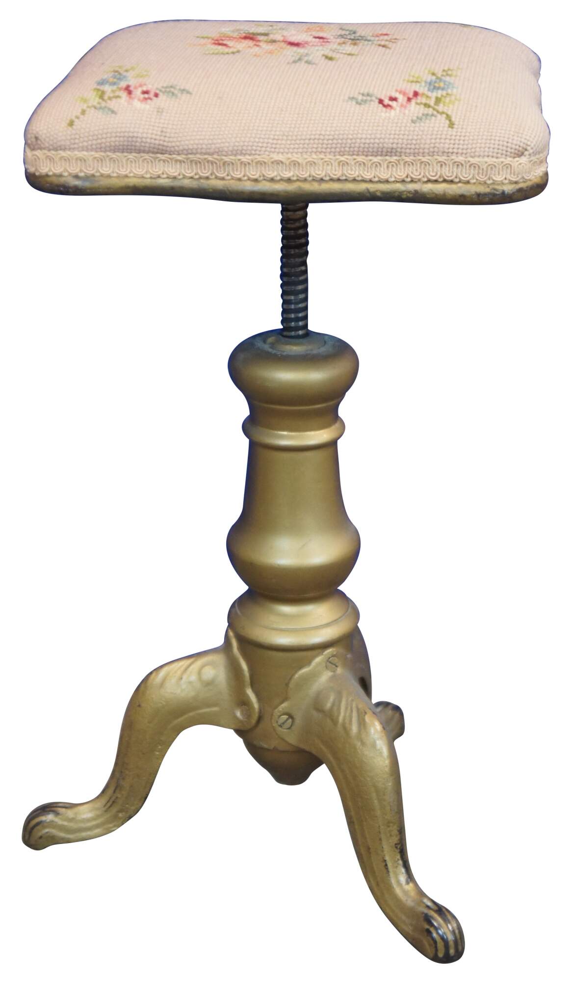 Antique Victorian piano stool with a wood and metal baluster shaped base with cabriole paw feet, painted gold, and a square adjustable height seat covered in pink floral needlepoint.
