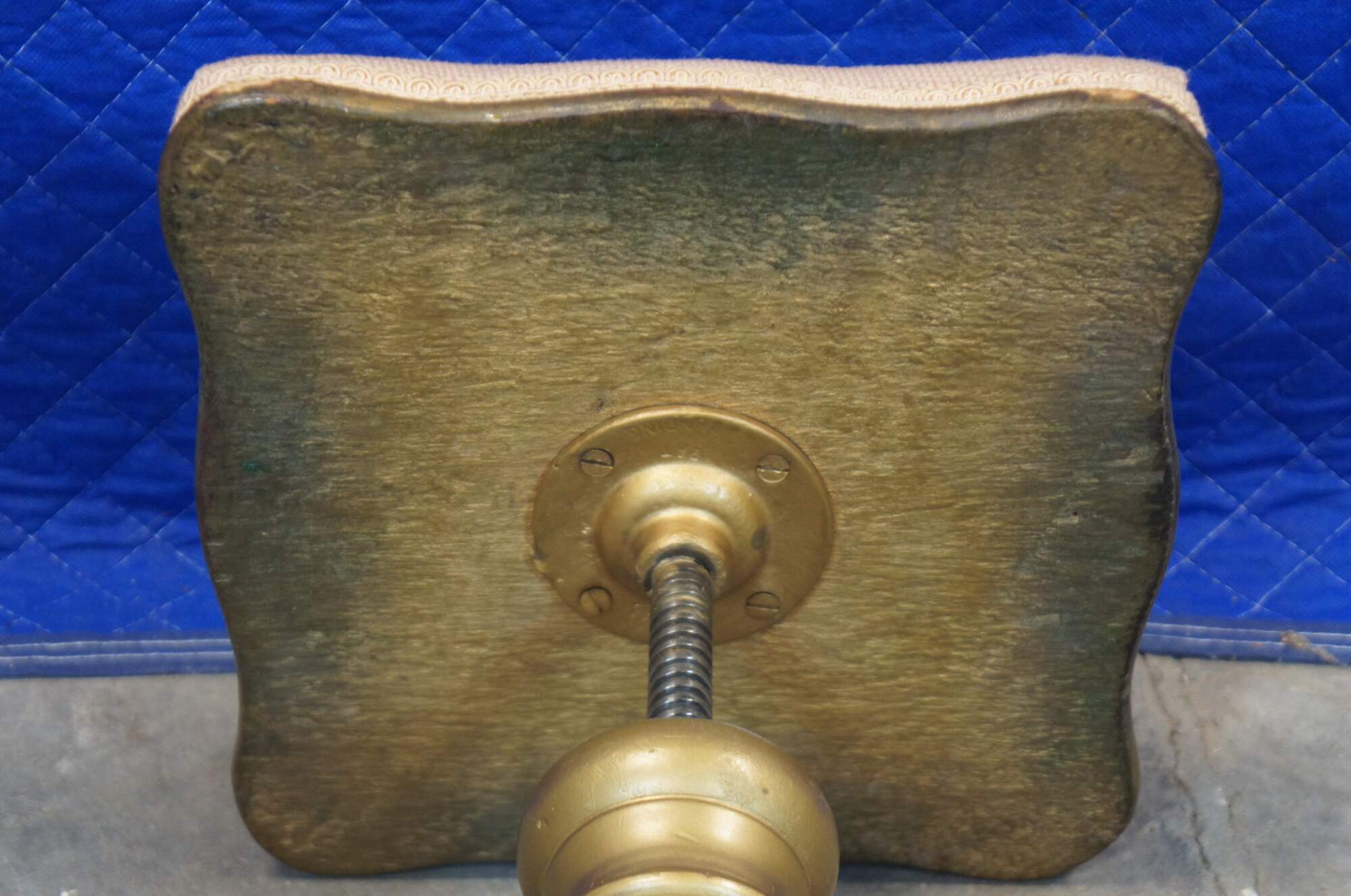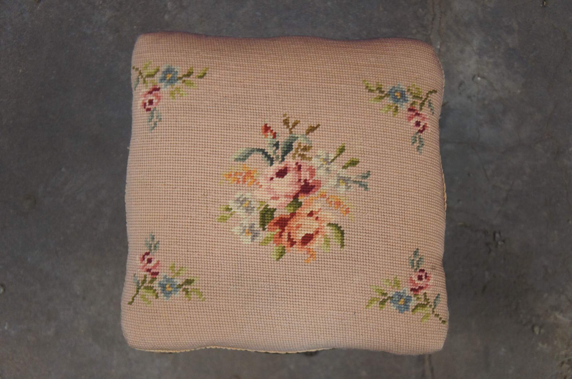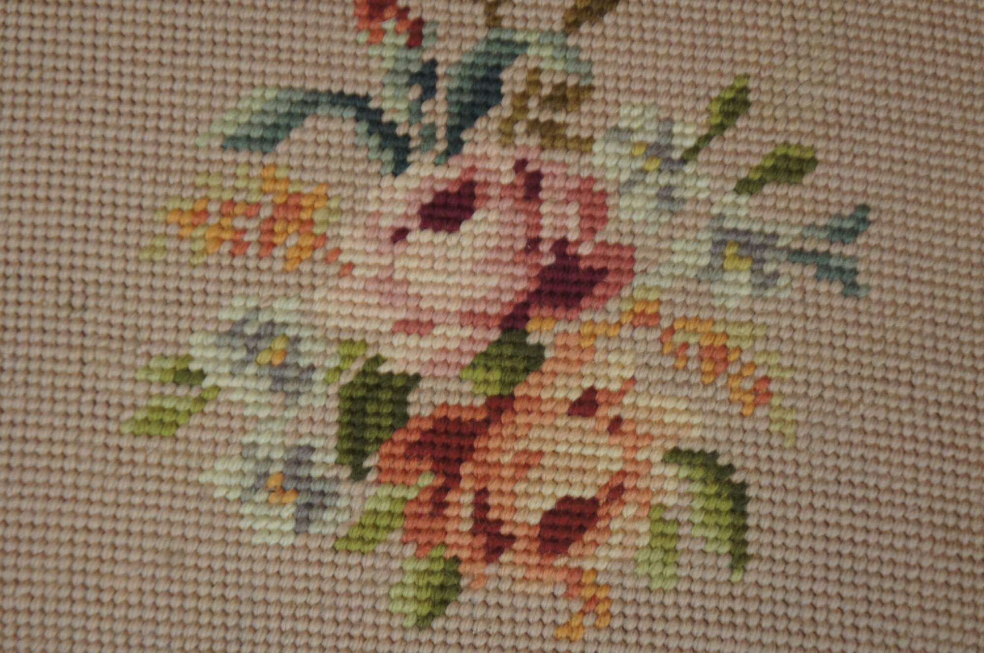 Antique Victorian piano stool with a wood and metal baluster shaped base with cabriole paw feet, painted gold, and a square adjustable height seat covered in pink floral needlepoint.