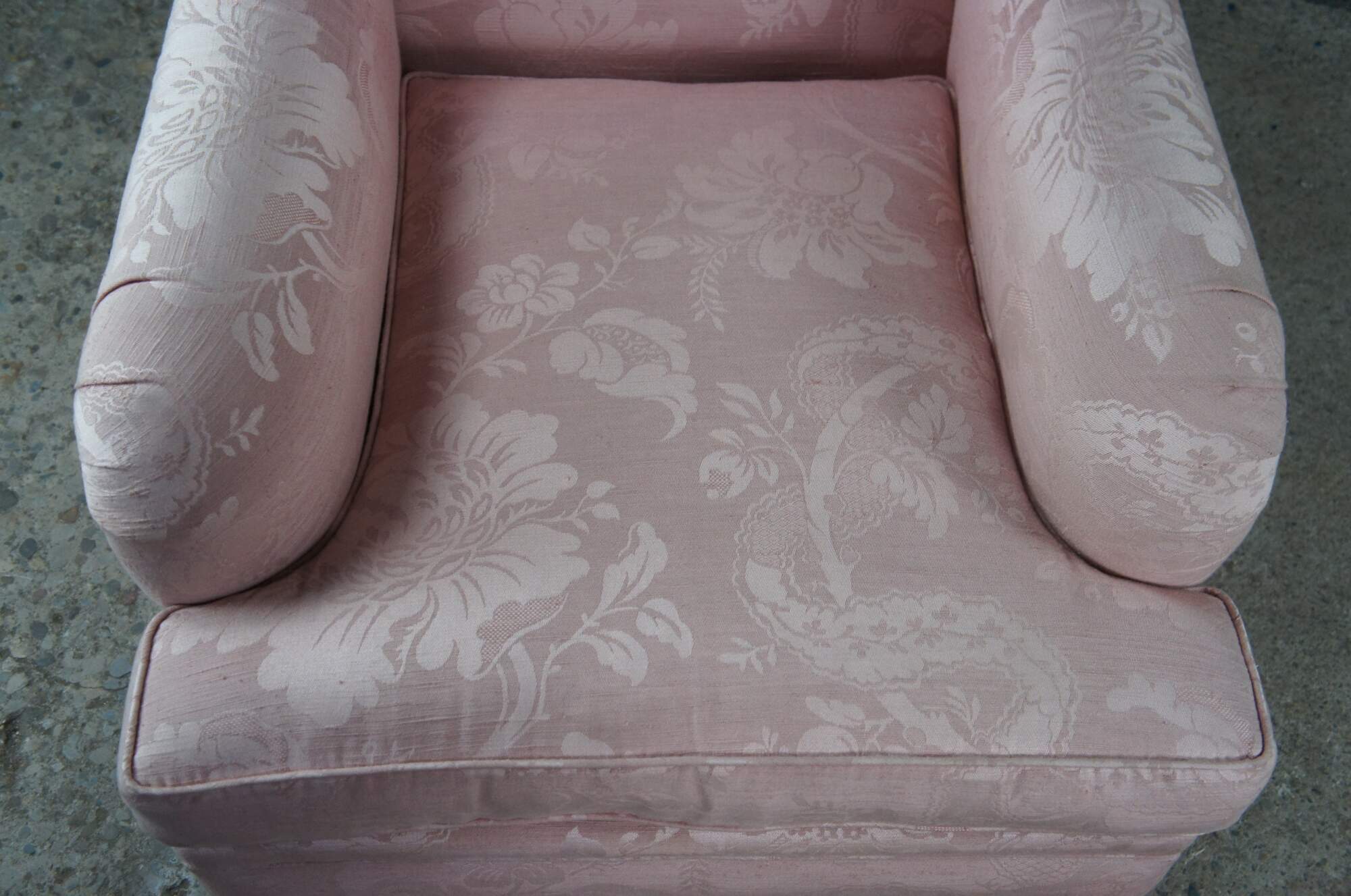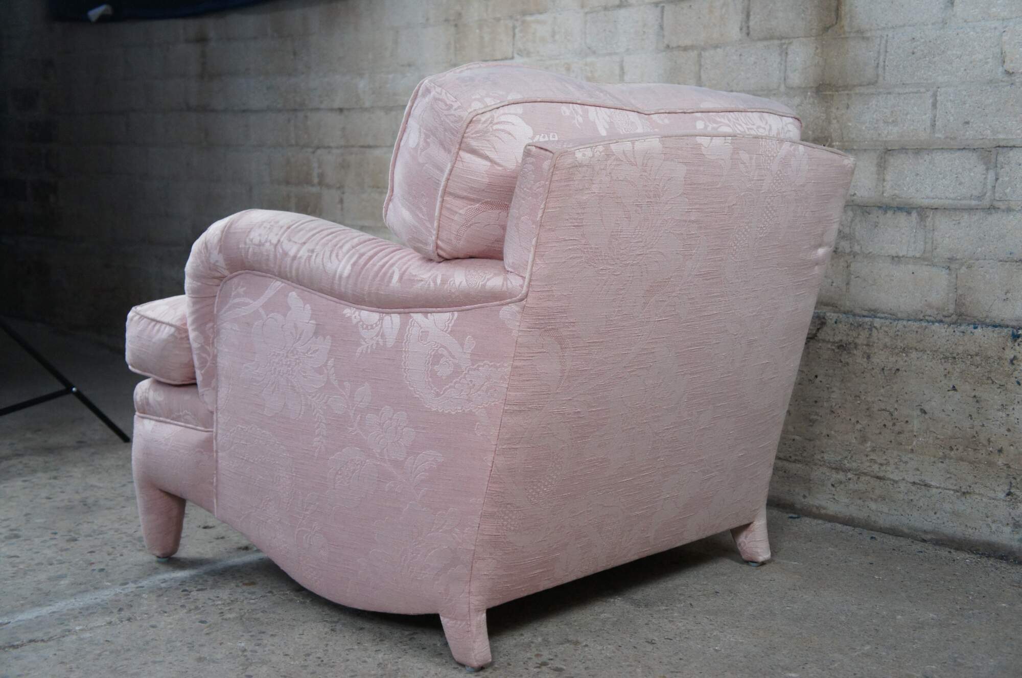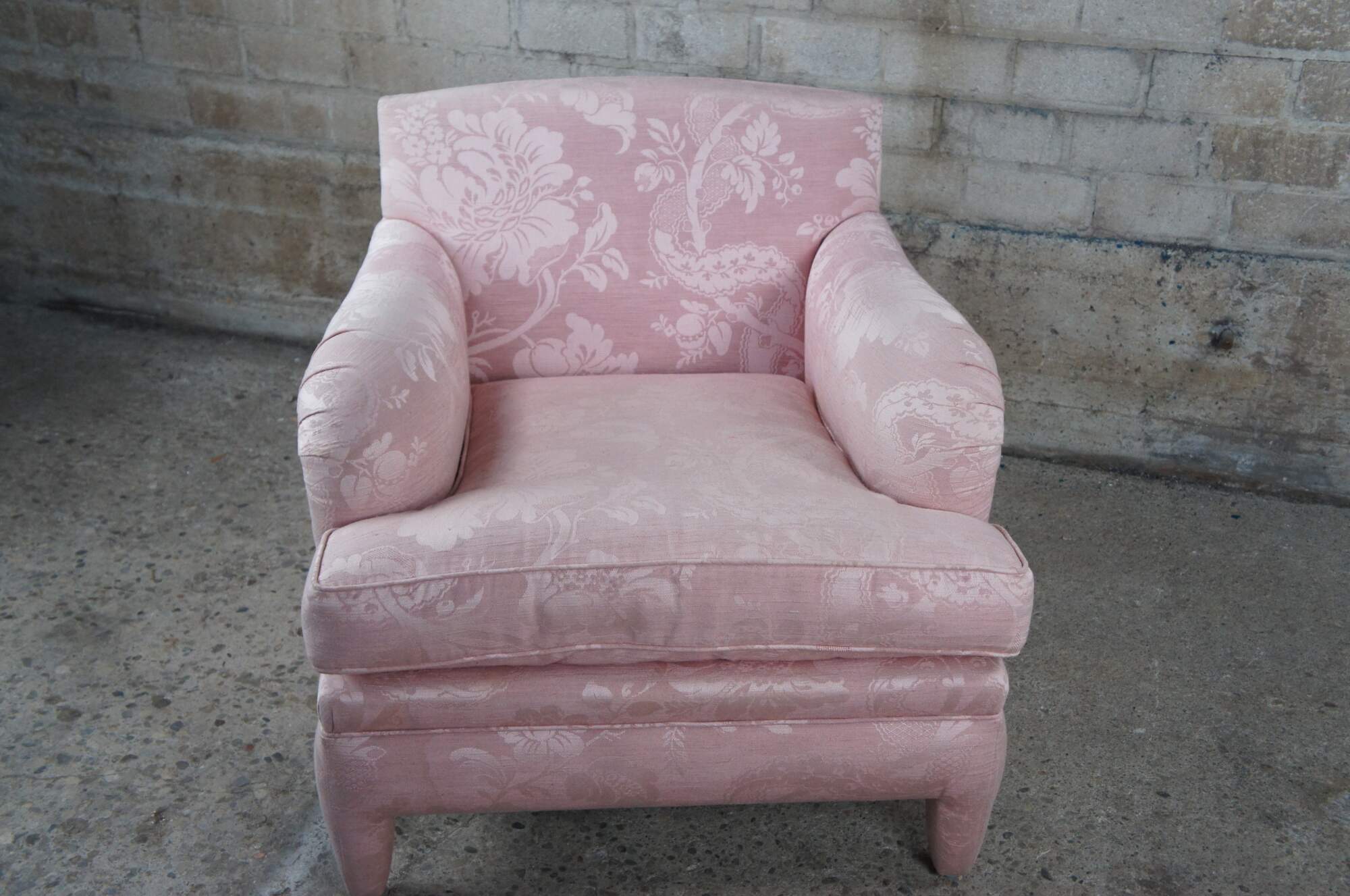 Mid century Donghia Furniture armchair featuring serpentine form with rolled arms, tapered and flared legs, and pink silk floral motif with goose down.