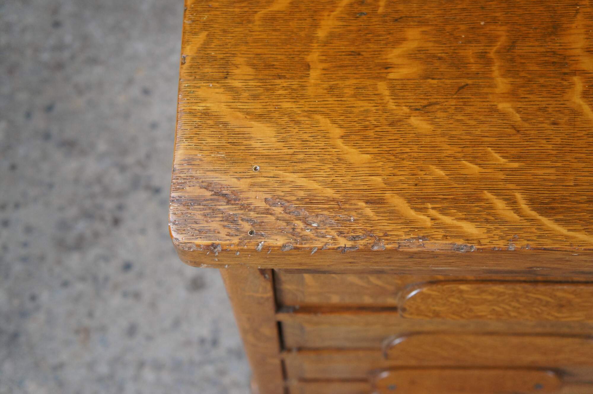 Antique late victorian oak executive desk. Made of quartersawn oak featuring rectangular form with paneled exterior, large central drawer flanked by six drawers, one file cabinet drawer and two pull out writing surfaces.