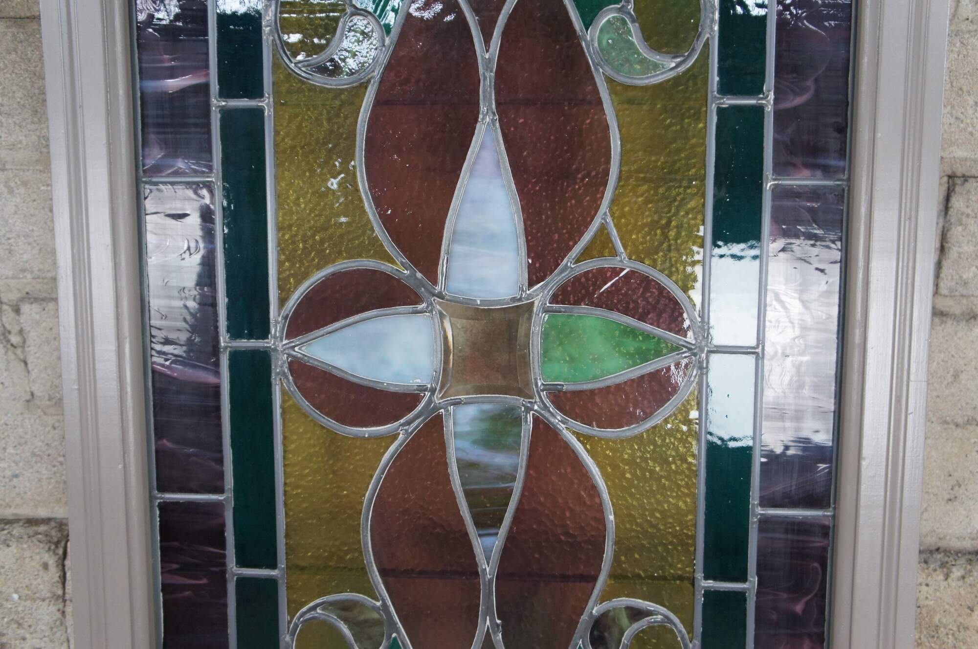 Beautiful antique Victorian leaded stained glass window panel. A geometric blend of amber, purple, greens and pink. Framed in gray and ready to hang.