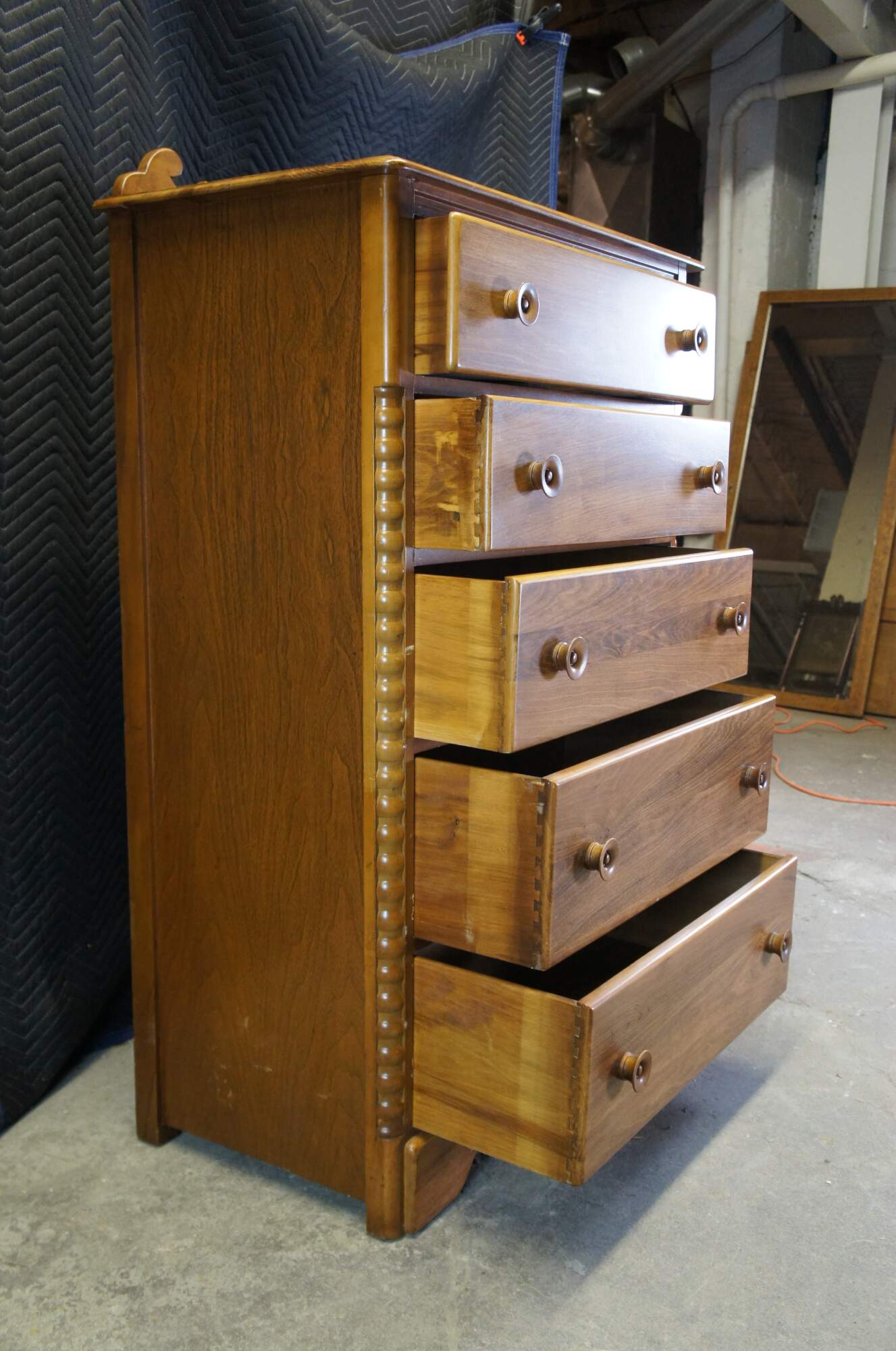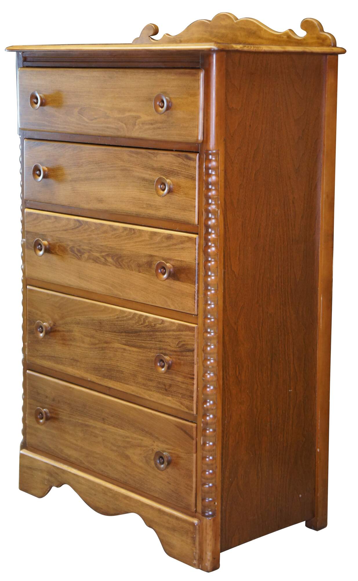 Early American inspired oak dreser, circa 1960s. Features 5 dovetailed drawers with quarter cut ribbed sides and ornate backsplash.