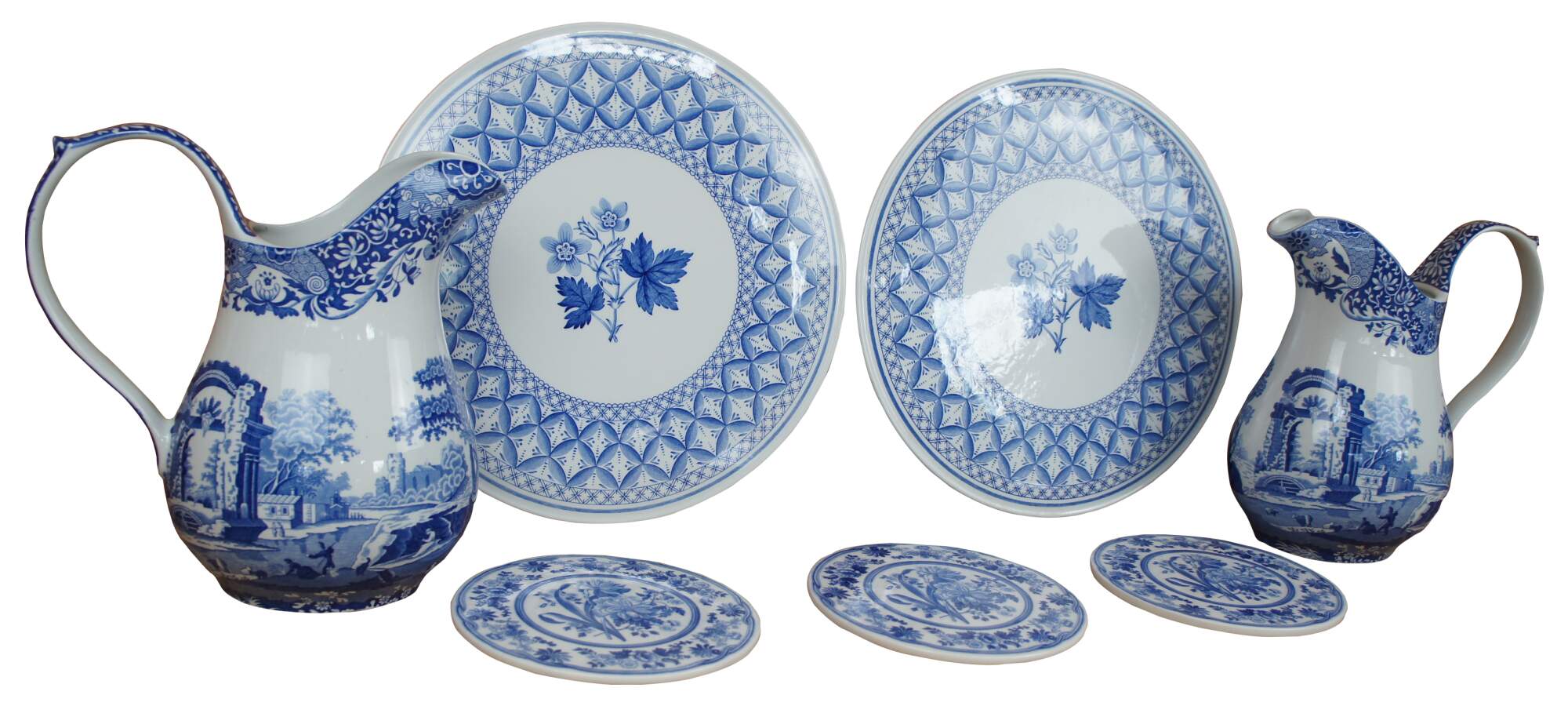 Lot of 7 Spode pieces. Spode England Geranium, Blue Room round Trivet L0906, Italian design pitchers.