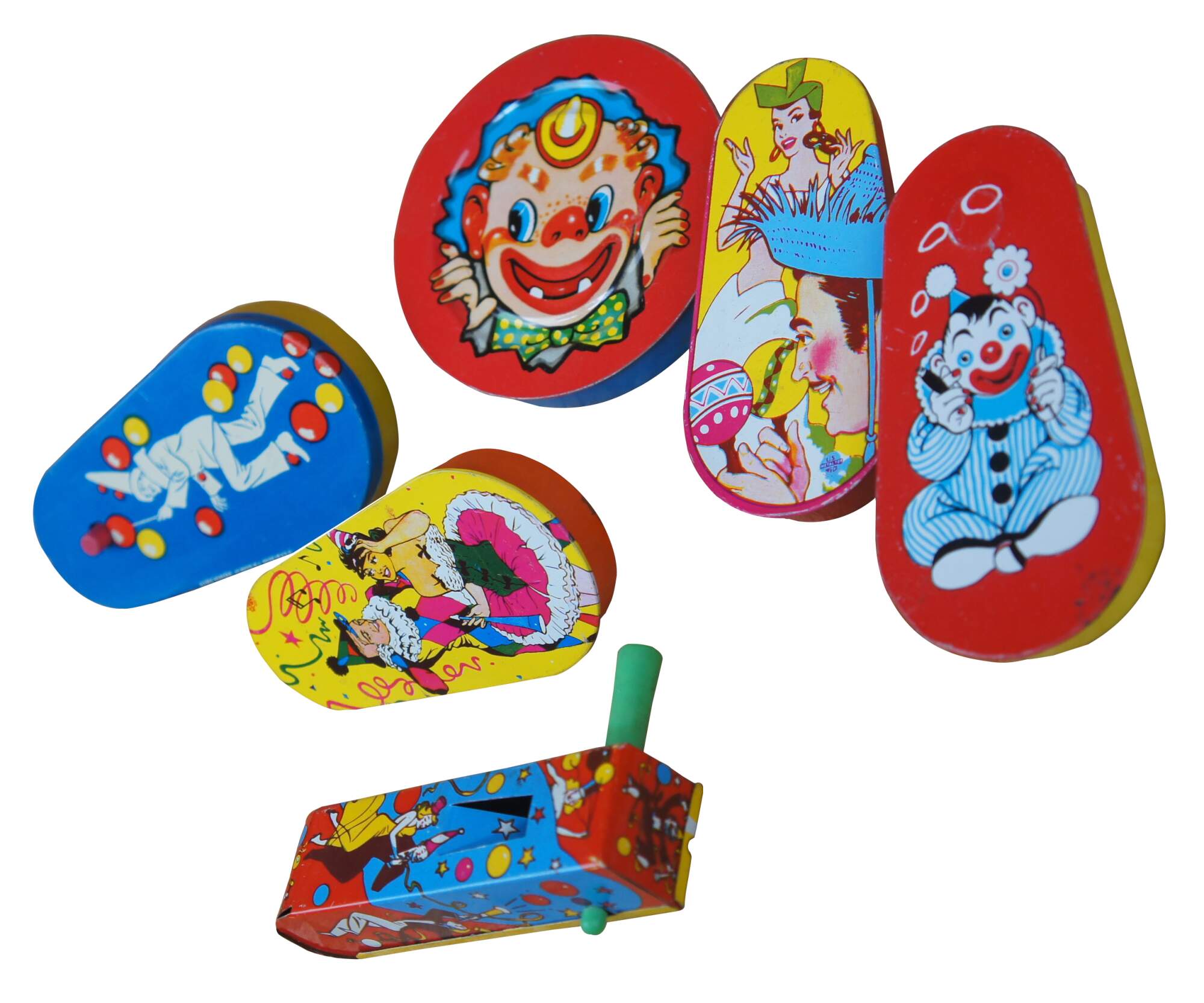 Lot of 6 assorted tin noise makers in different sizes and shapes.