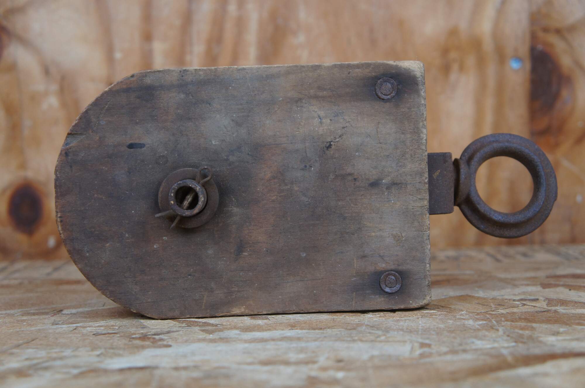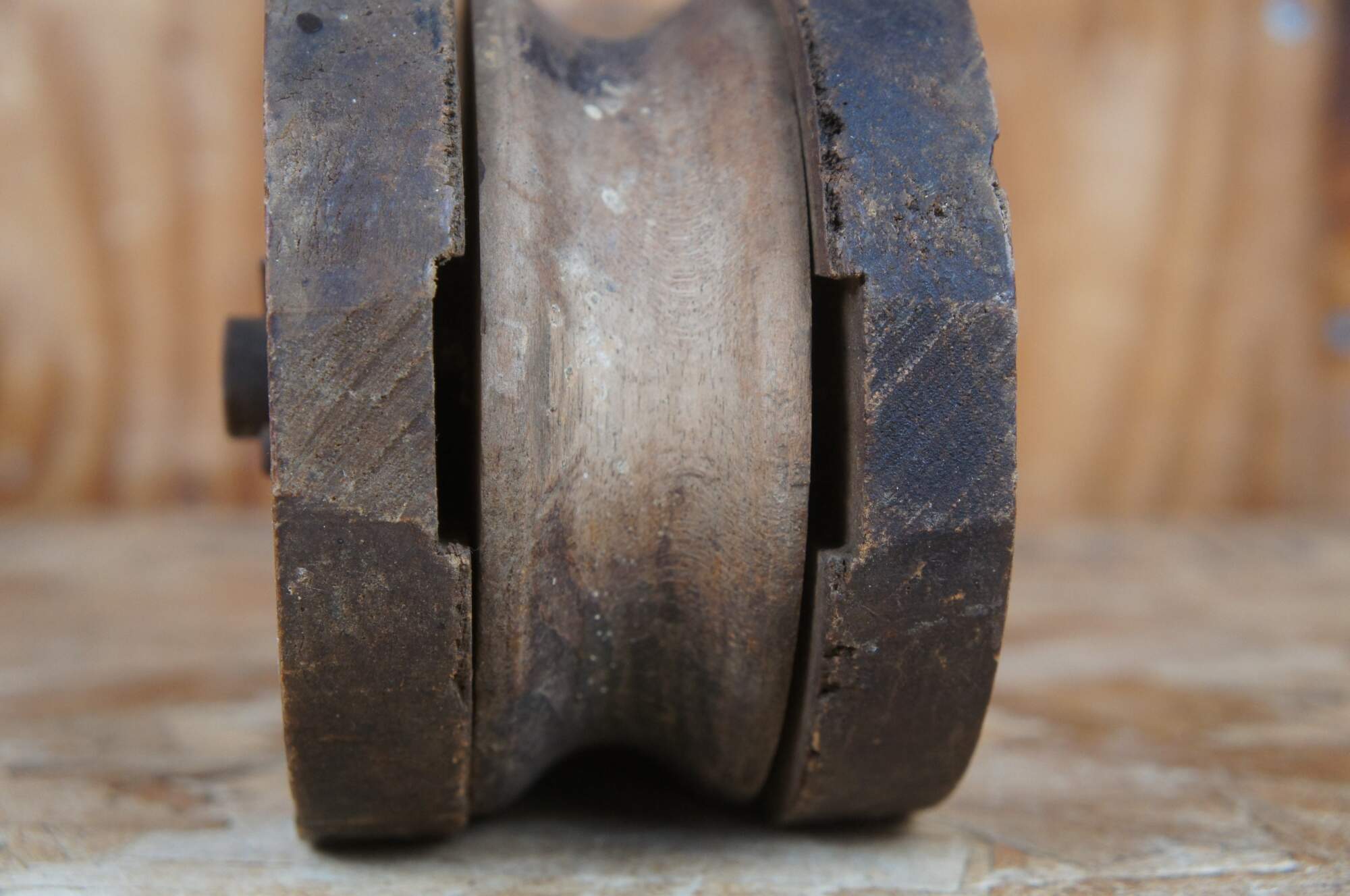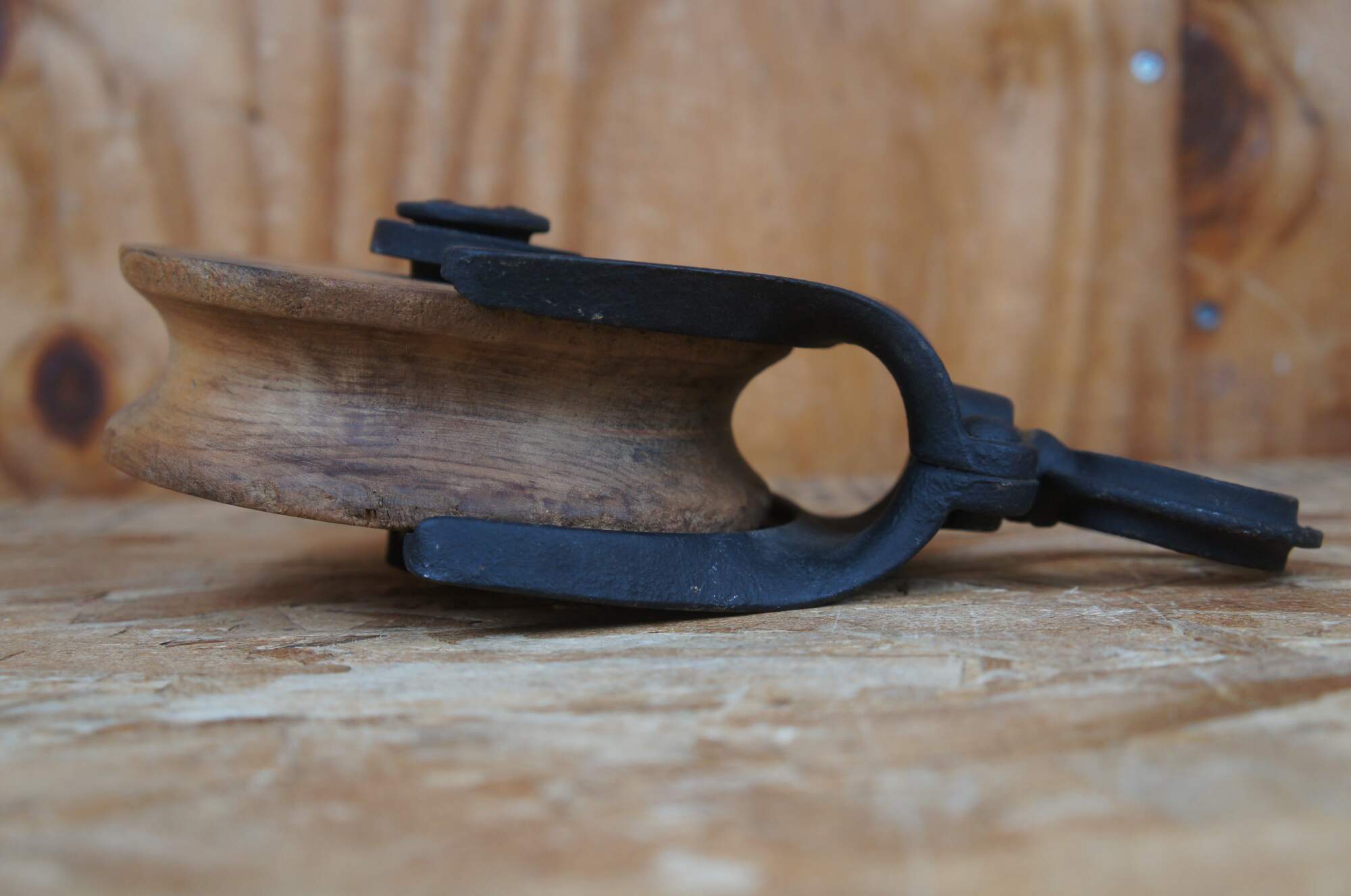 Two rustic antique pulleys with swivel mounts made of cast iron and wood.