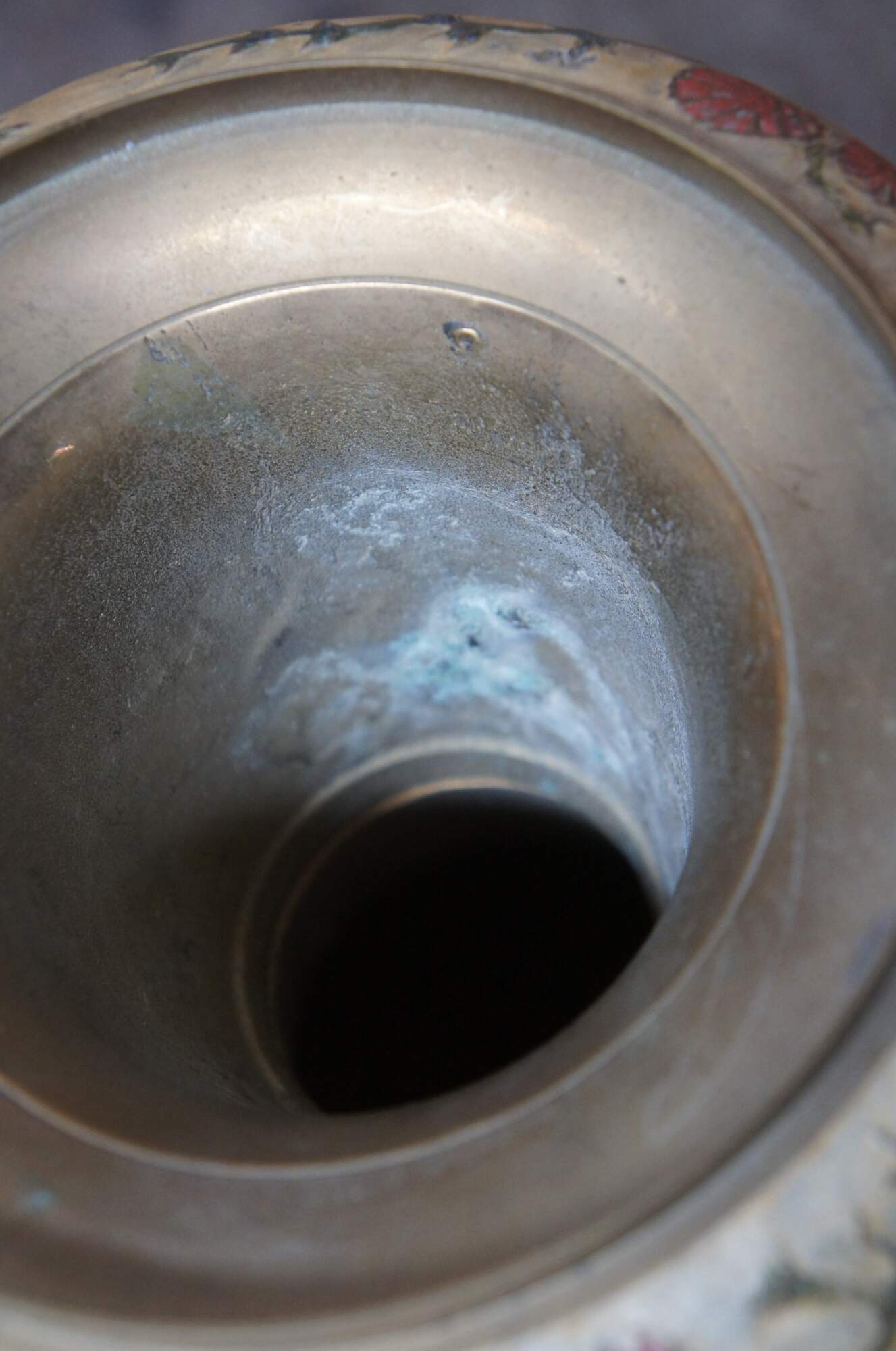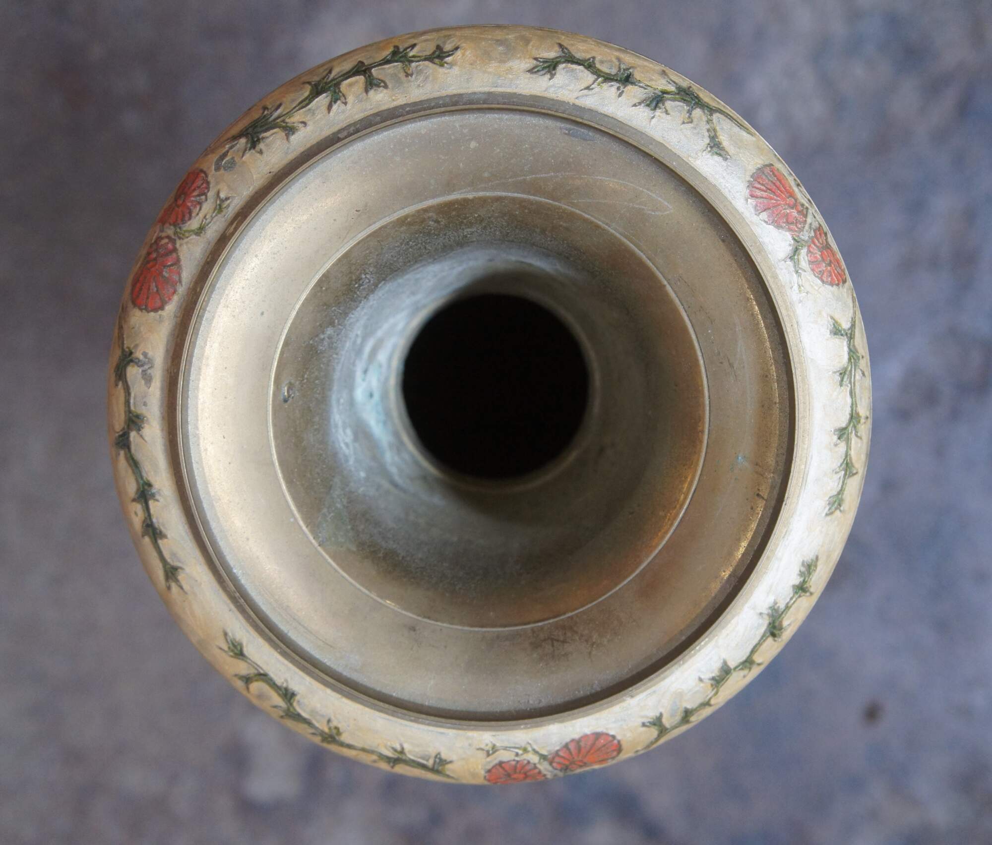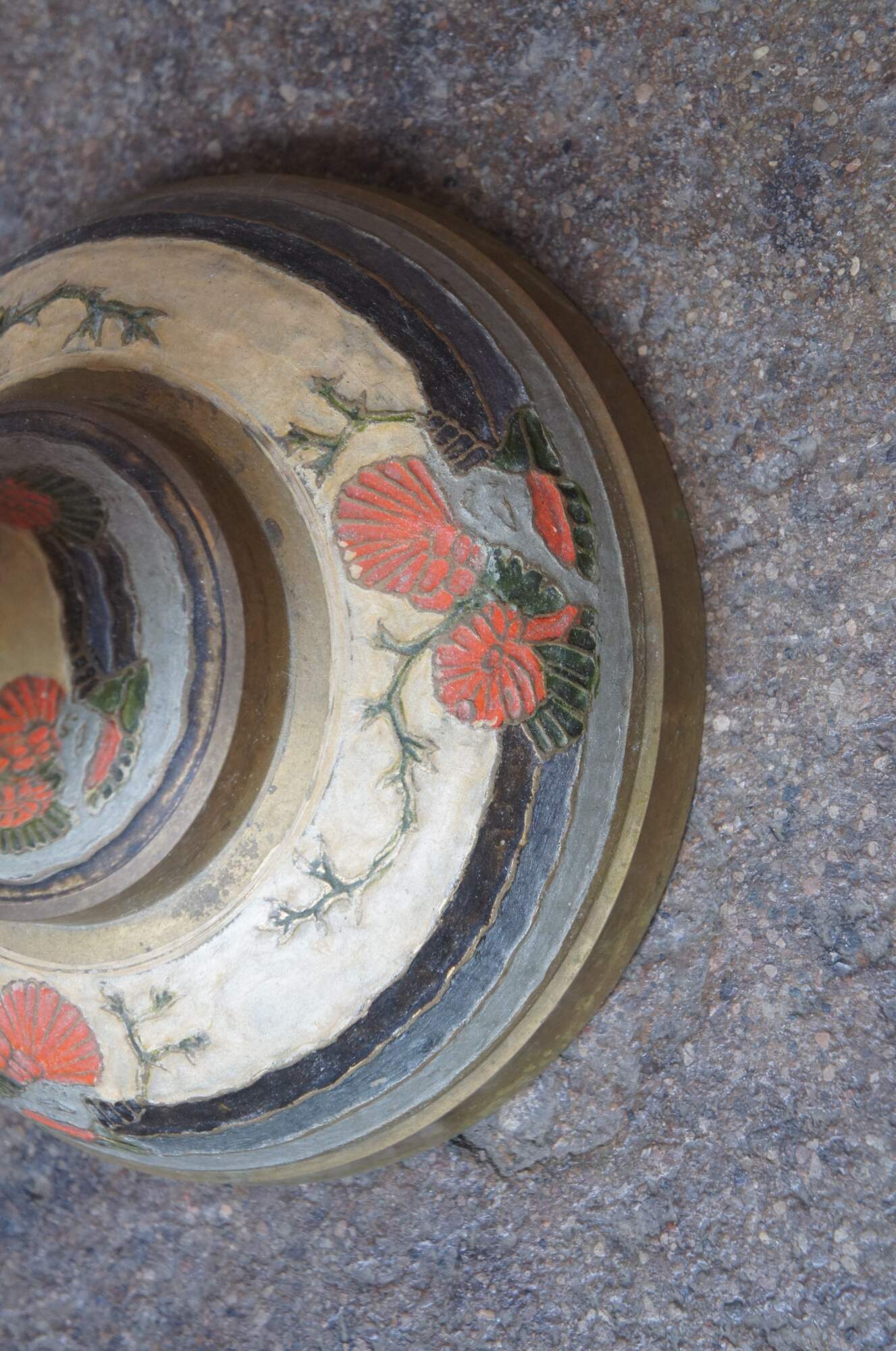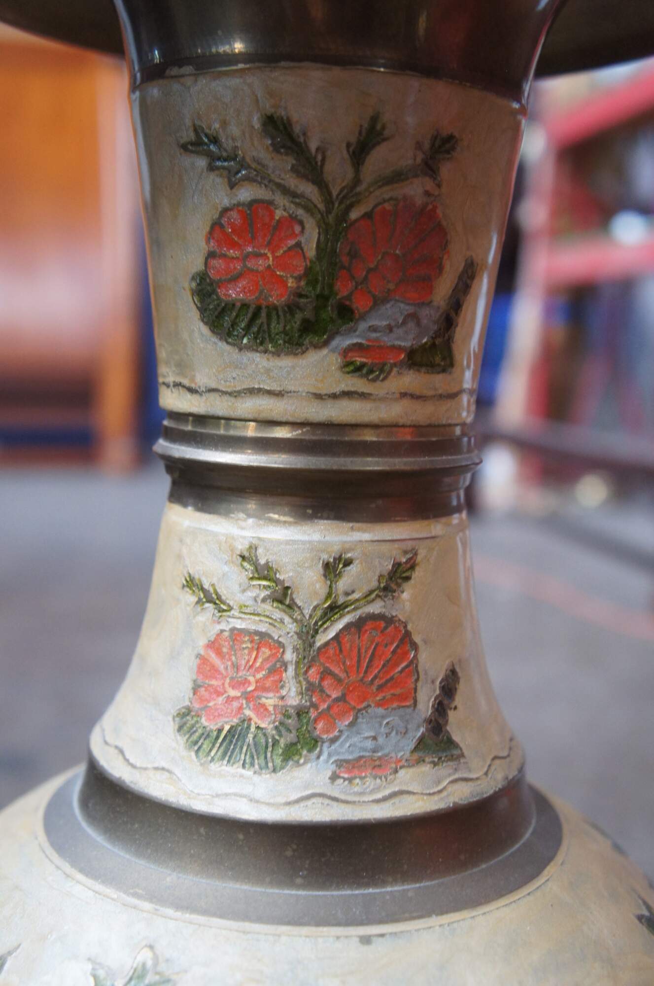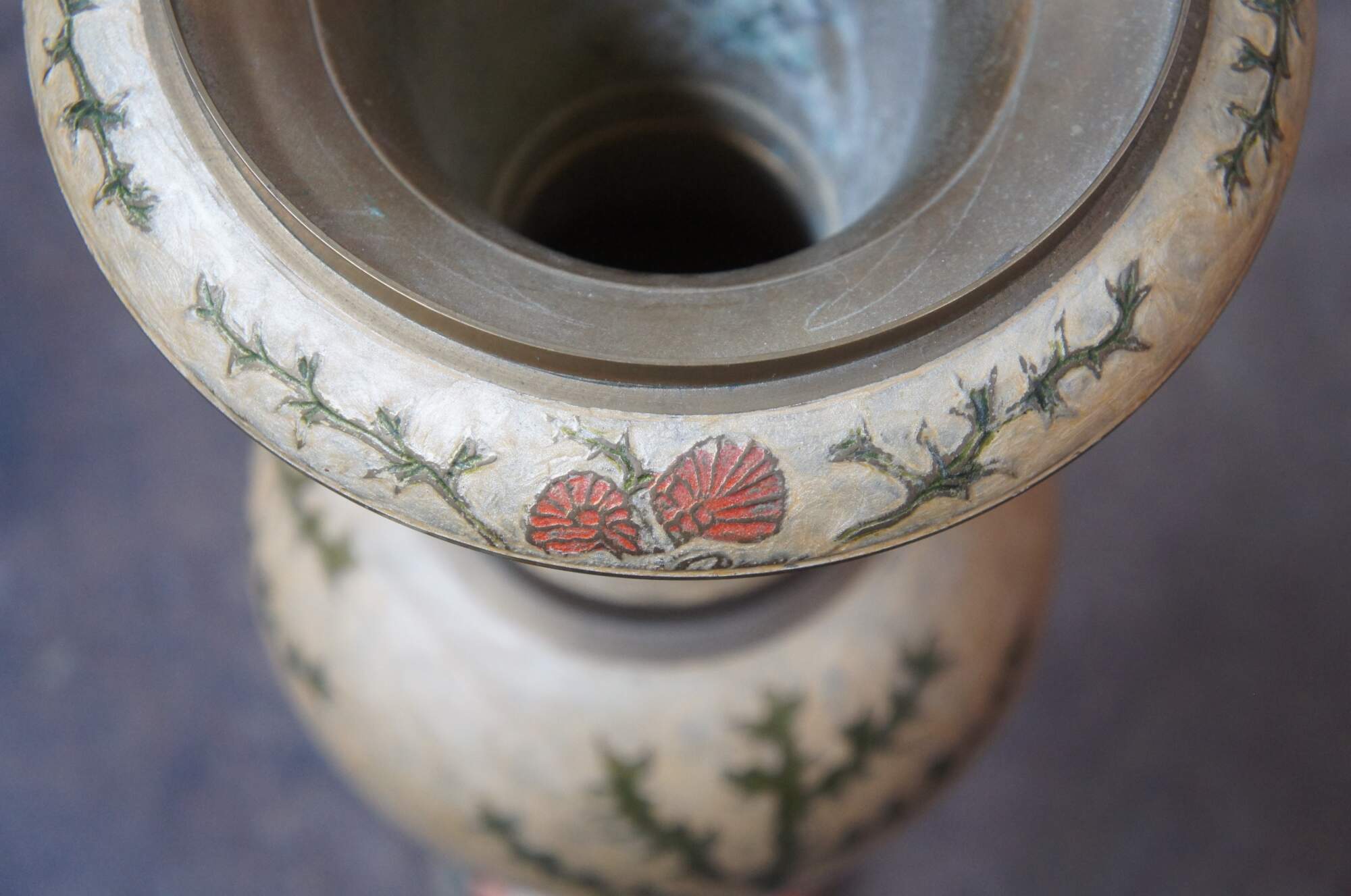 Tall vintage brass vase or urn featuring muted earth tones in enamel. Made in India.