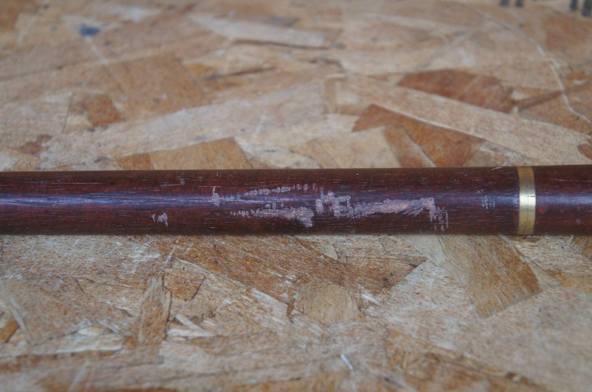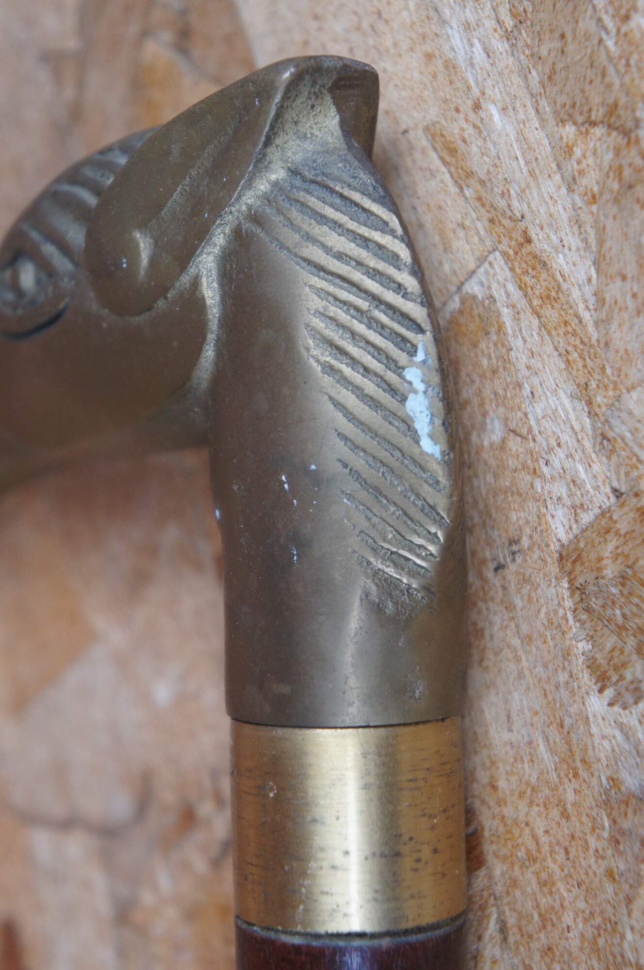 Vintage mahogany walking stick features a brass horse head and can be unscrewed into three pieces.