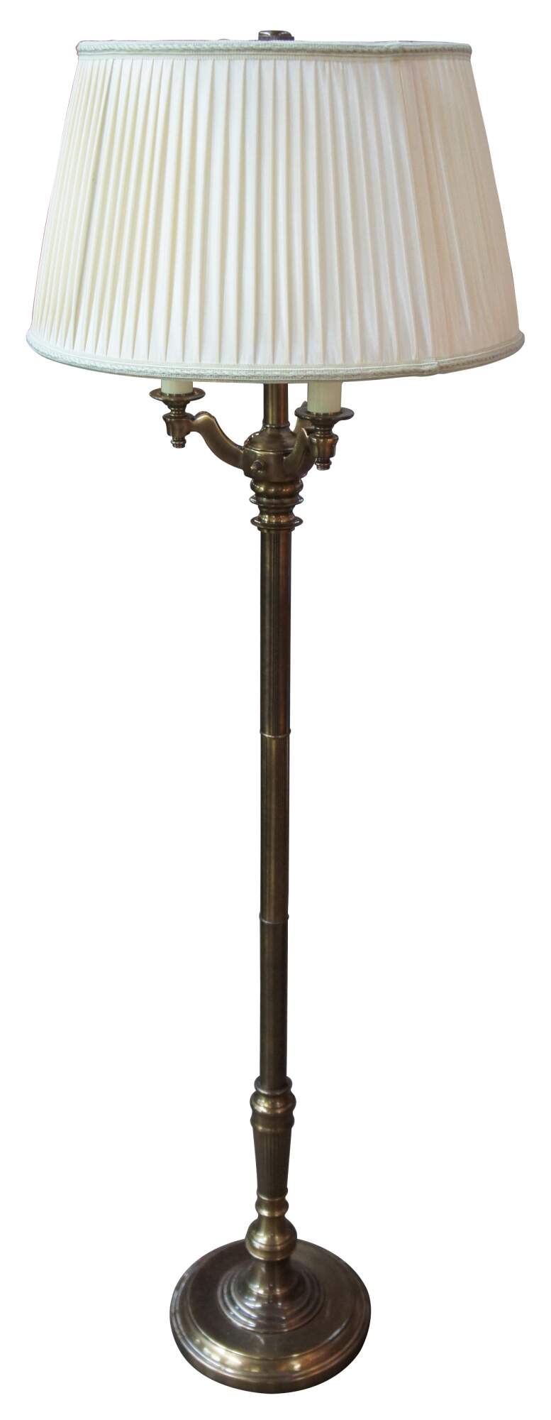 Vintage Stiffel mogul candelabra floor lamp in brass fiish with three torchiere style candlstick lights and a central light with cream Stiffel shade.