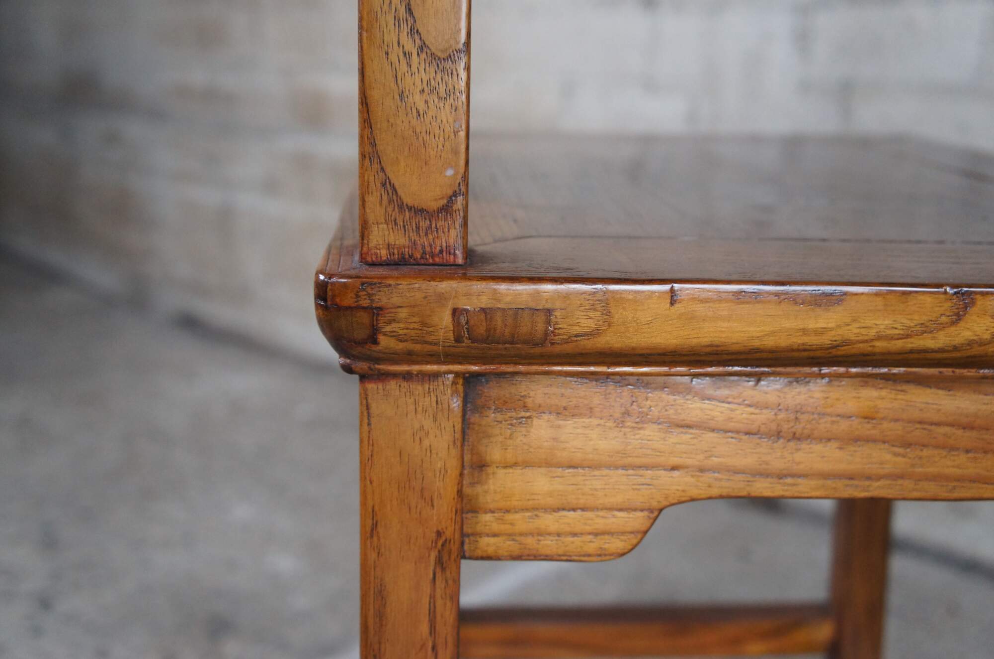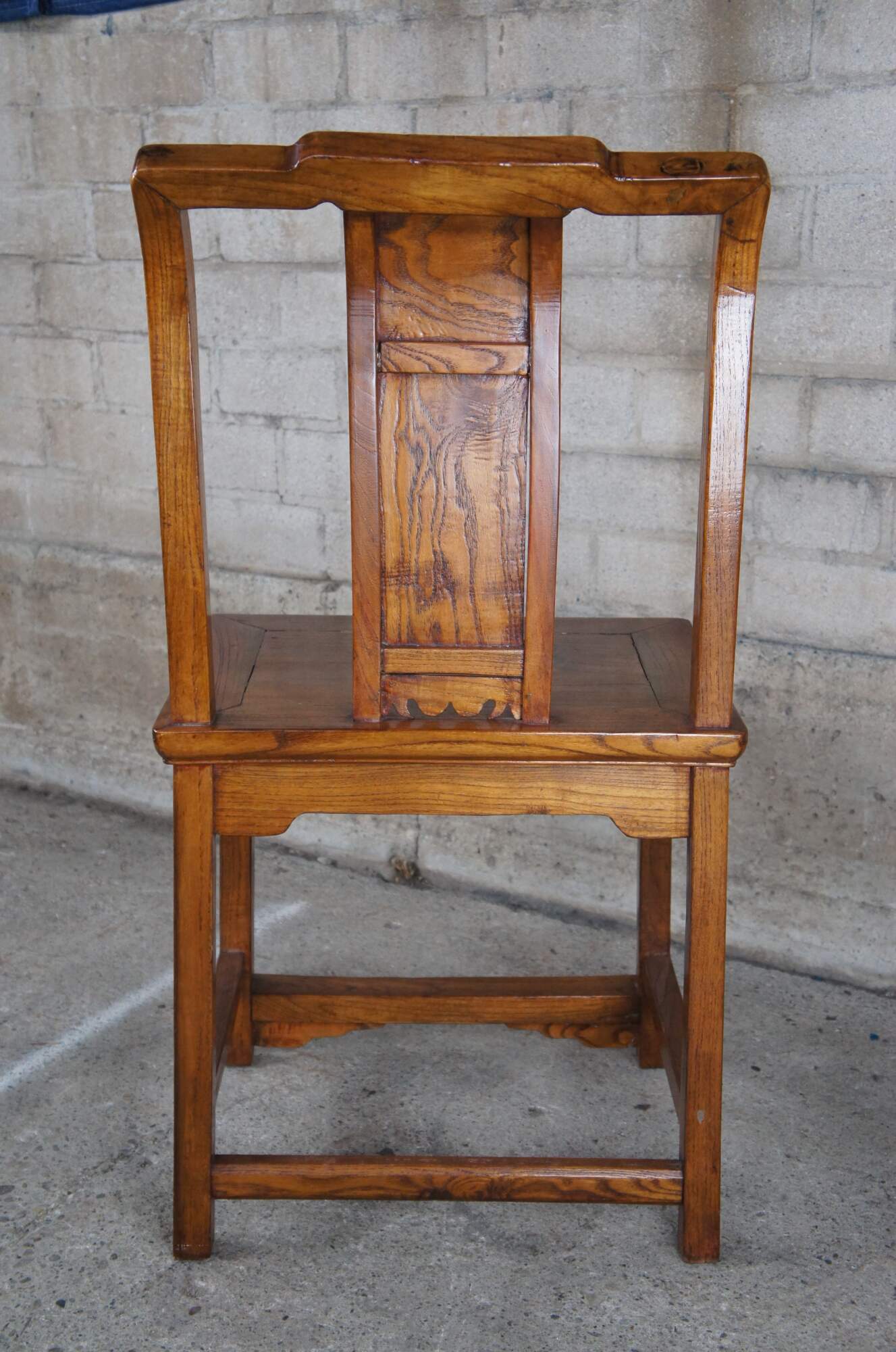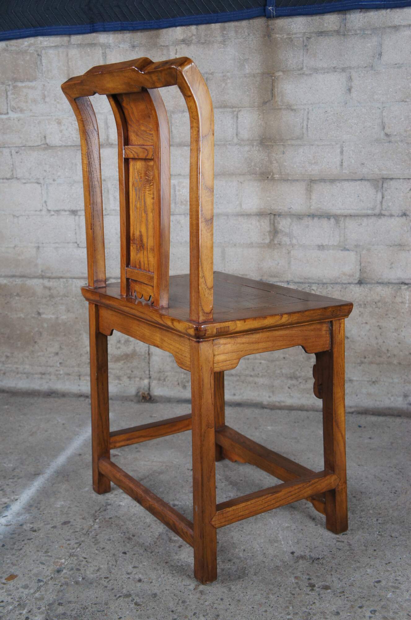 4 beautiful Japanese solid elm dining or Mahjong chairs. Purchased during Japan in the last quarter of the 20th century. Traditional form with a carved back and scolling front apron. Built via Mortise and Tenon joinery.