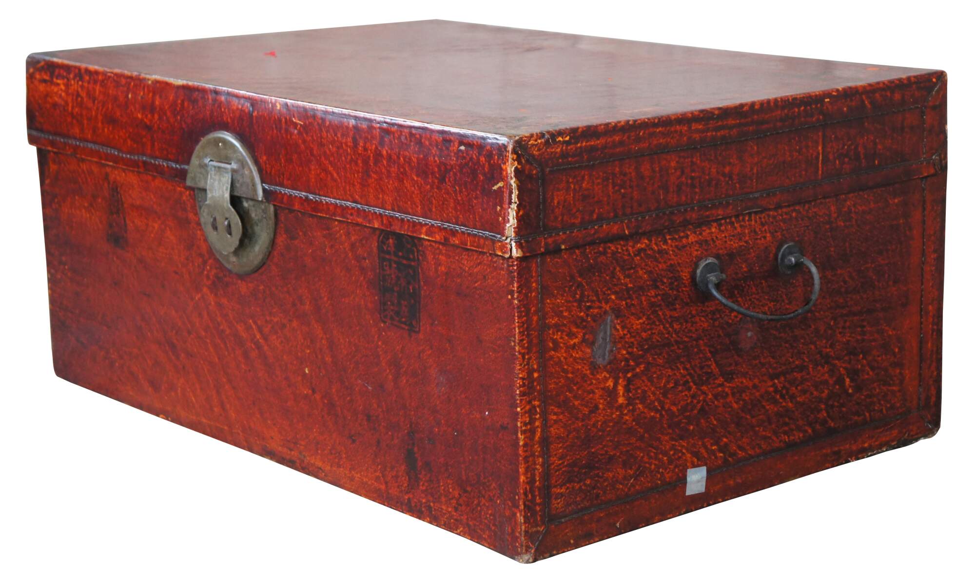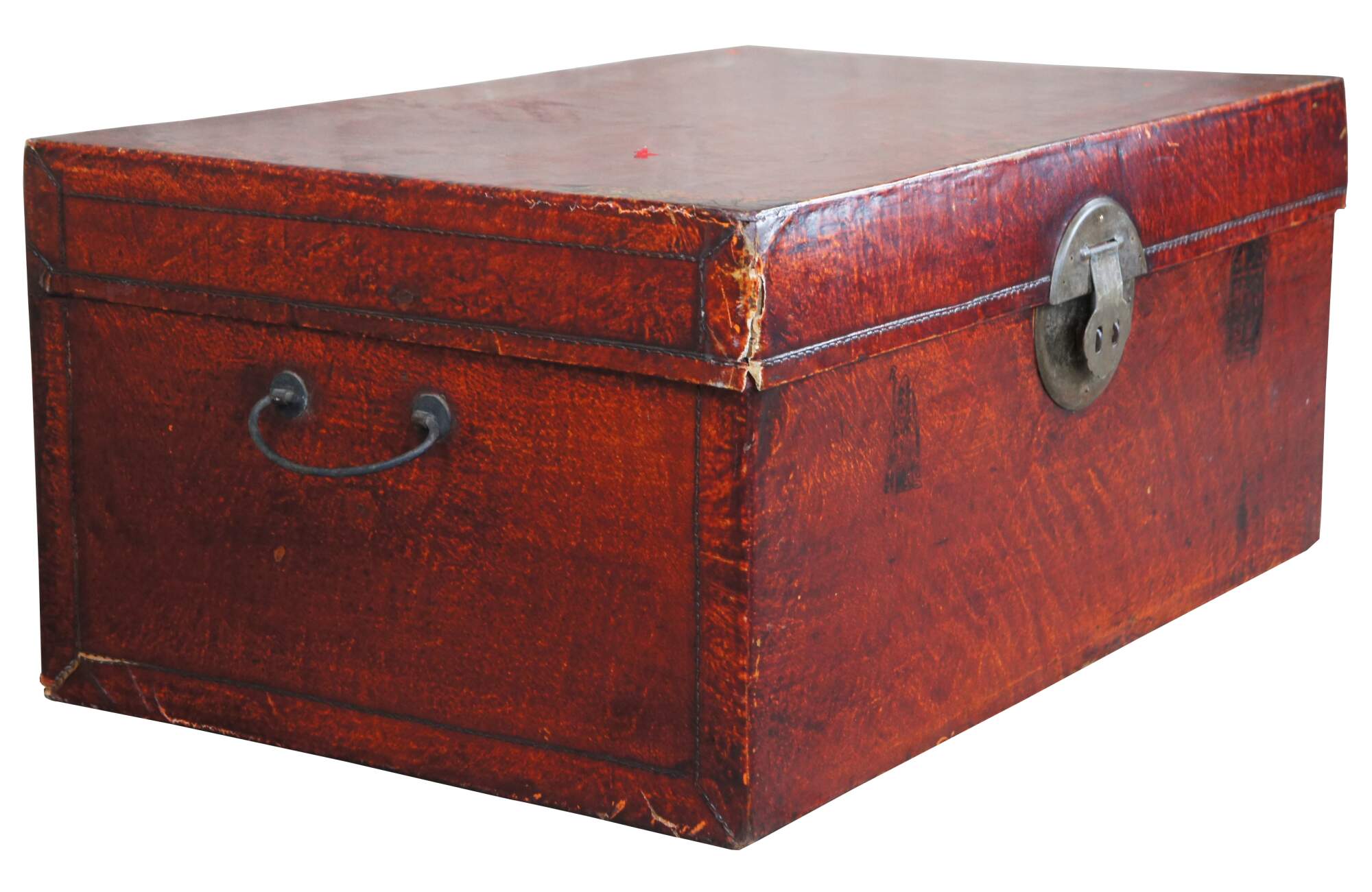 Vintage red leather storage trunk. Rectangular form with ming inspired brass clasp along the front and handles along the side. Features a black stamp to the right of the clasp and fu Sanxing God of Porsperity figure stamped to the left.