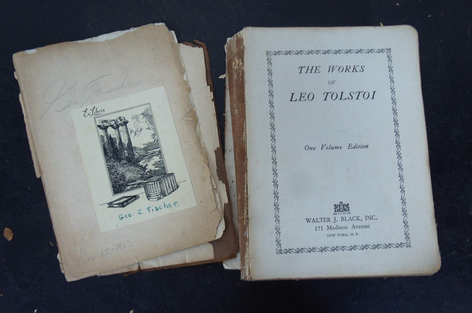 Antique leather cover copies of “The Works of Victor Hugo” and “The Works of Leo Tolstoi” in one volume editions, published by Walter J. Black 1928.