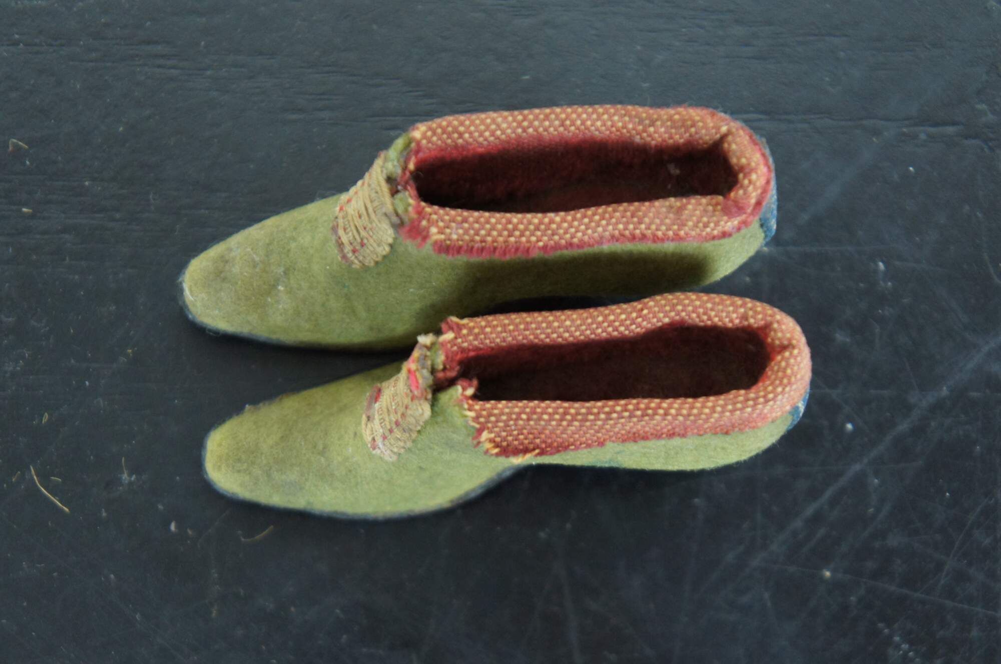 Pair of antique Victorian miniature folk art cobbler doll sized evening shoe pincushions made of light green felt with red cloth trim and stitched braid “buckles" with leather soles.