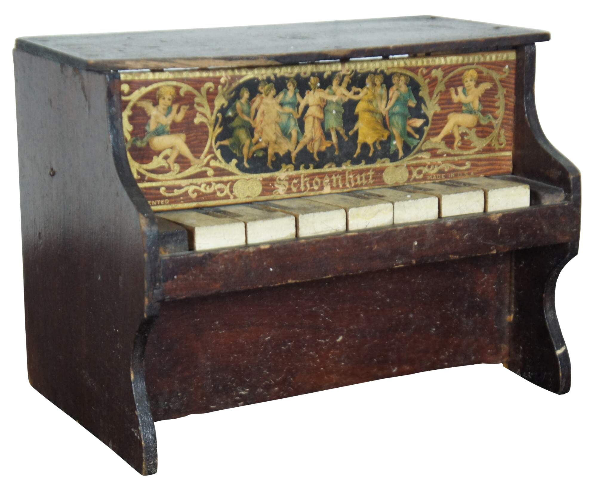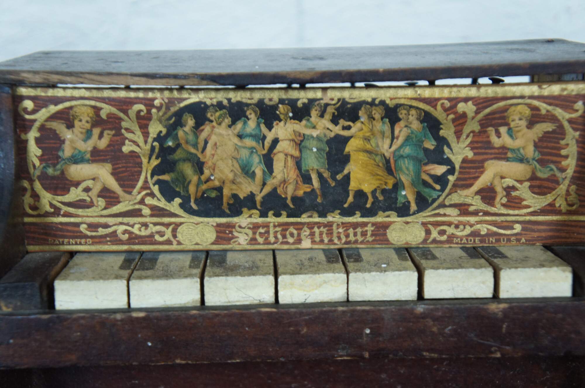Antique late Victorian Schoenhut wooden toy upright piano with seven keys, decorated with a Neoclassical lithograph showing Apollo and the Muses flanked by cherubs.