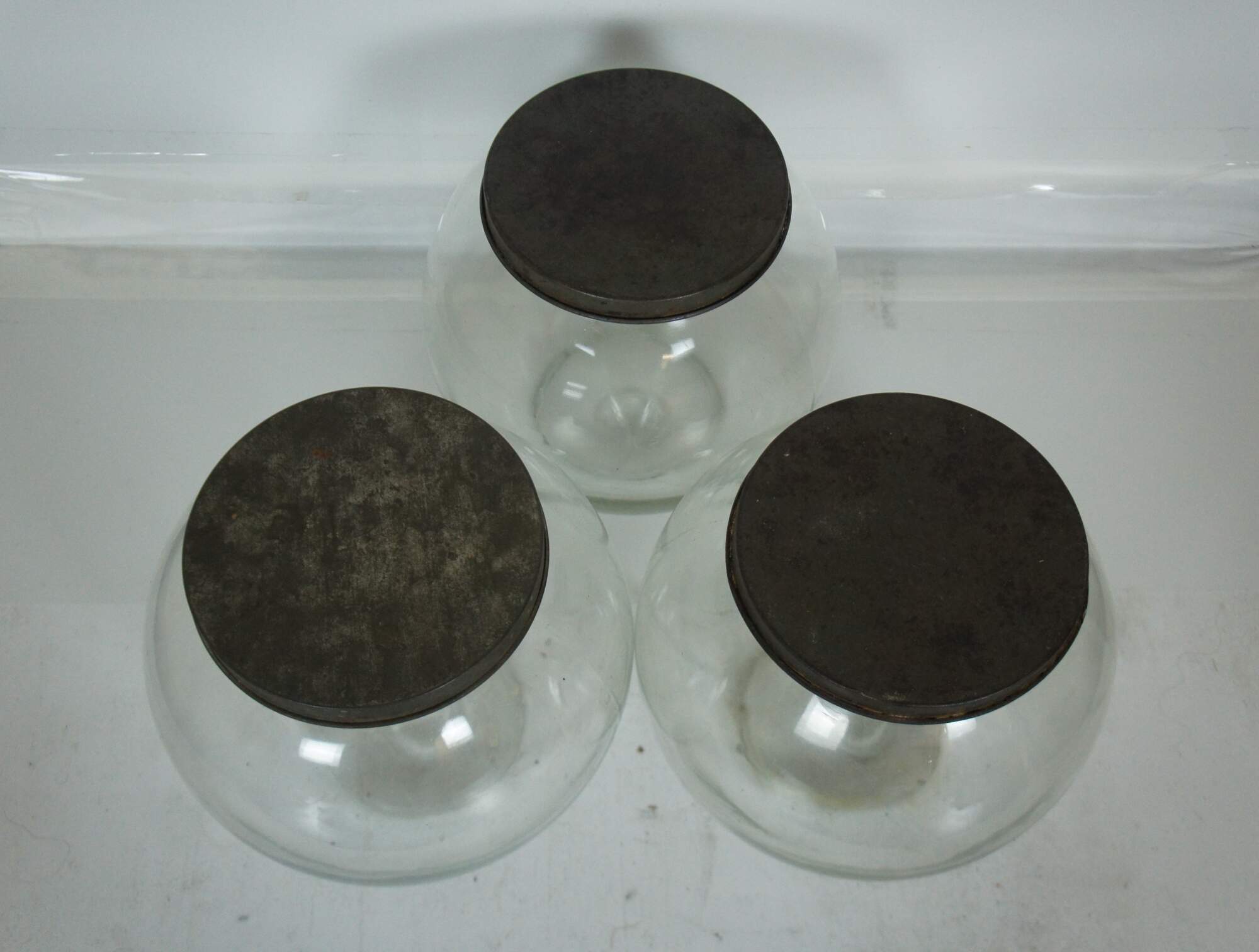 Set of three rare antique 1920’s clear glass fish bowl shaped candy containers with metal lids and three vintage West German scoops.