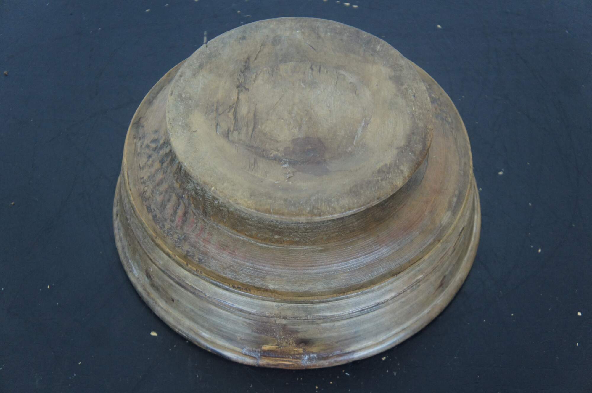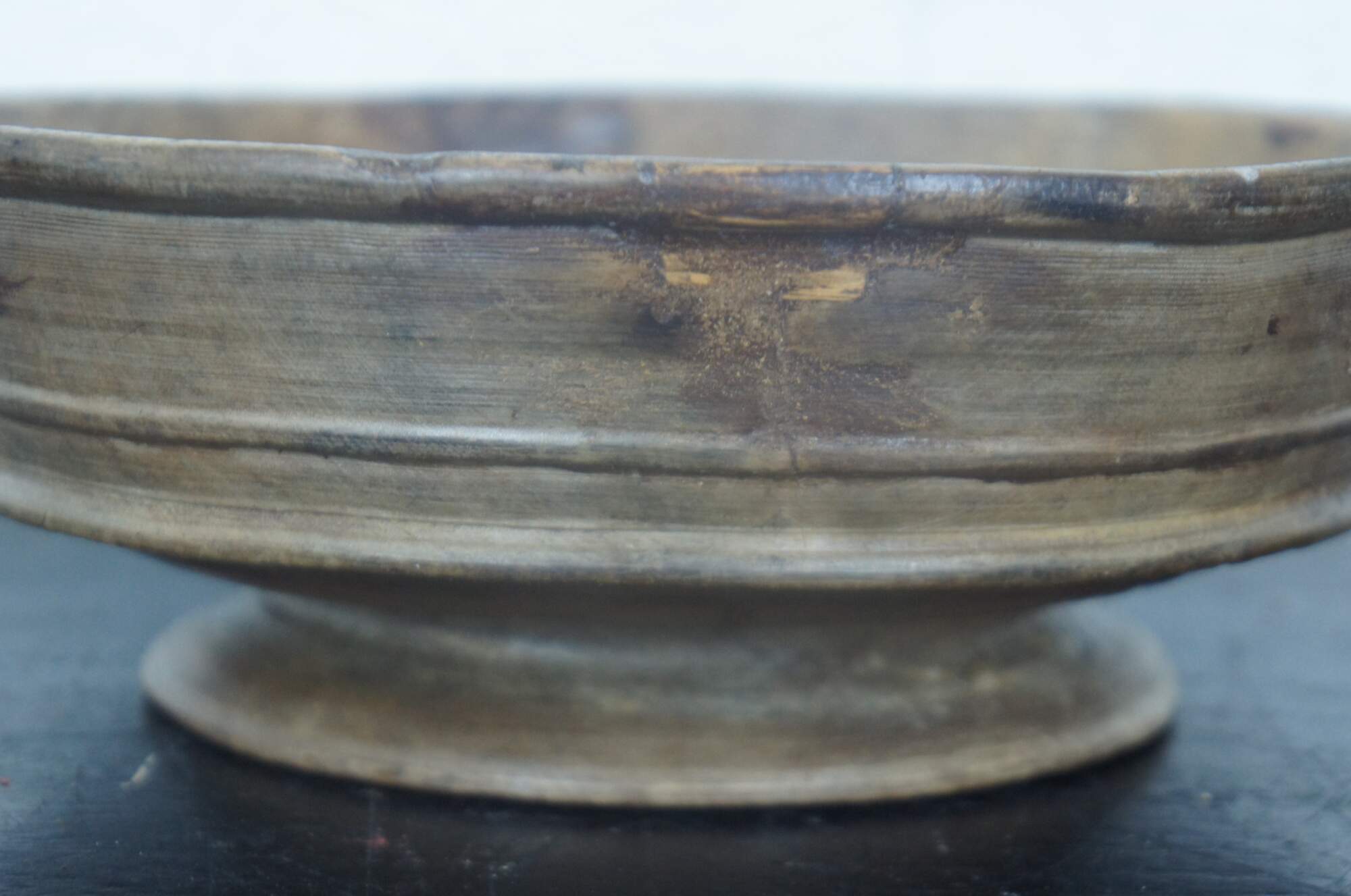 Antique primitive turned wood footed dough bowl or centerpiece with simple decorative ridges.