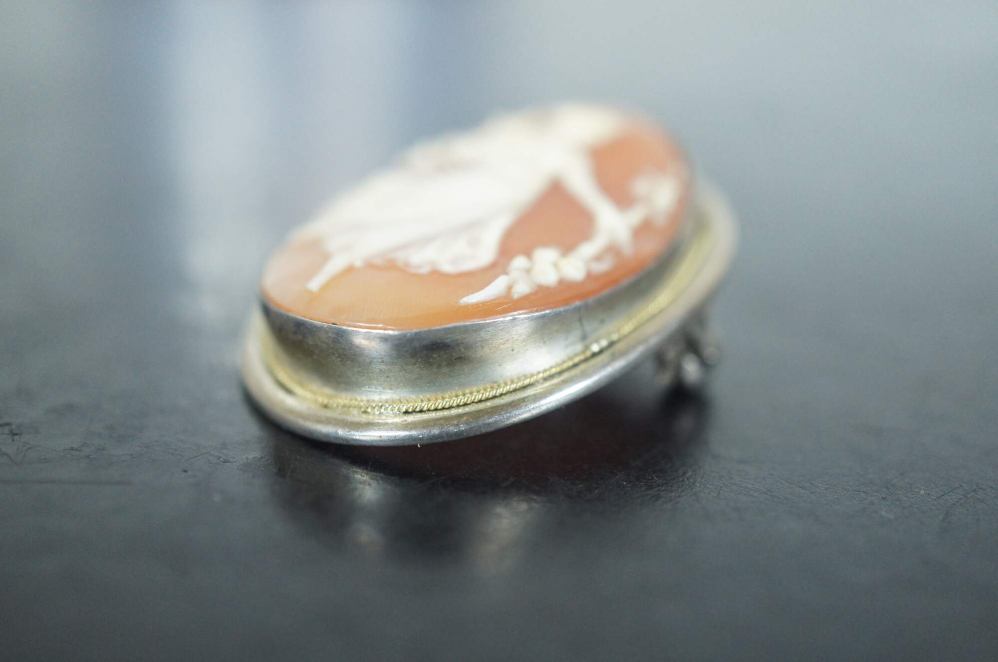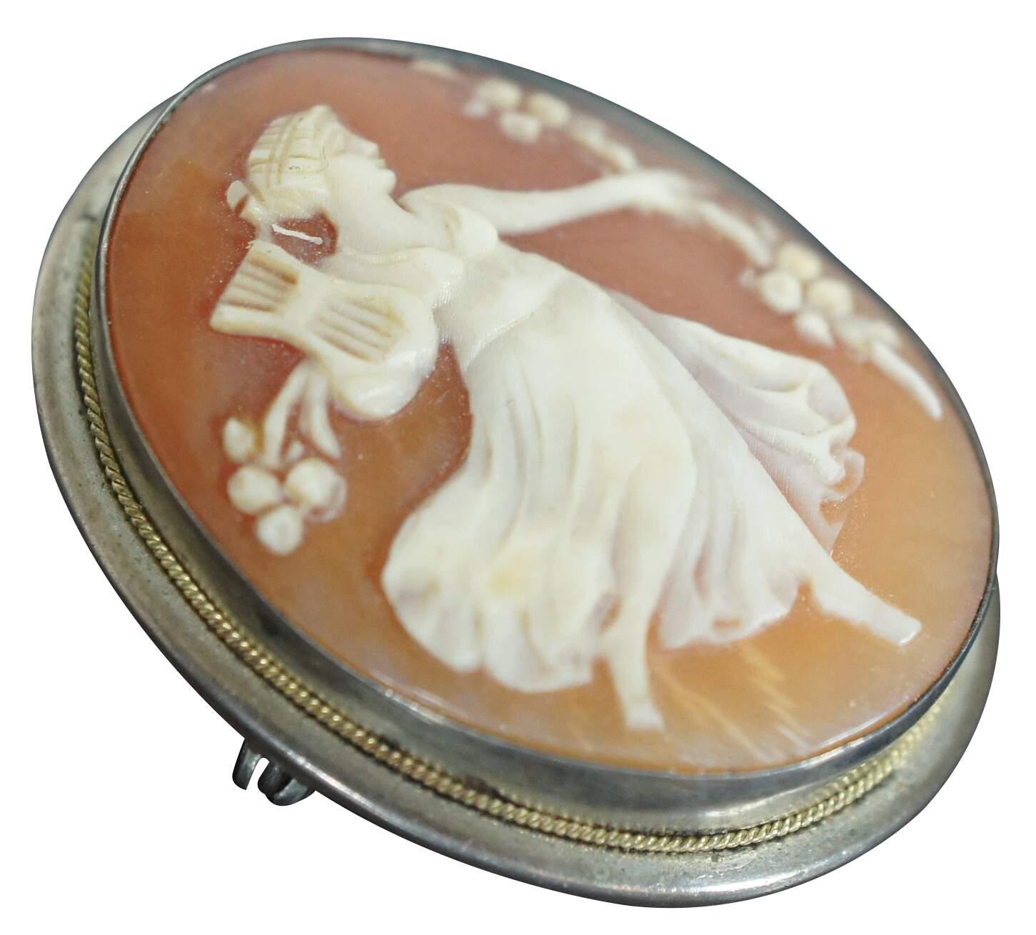 Antique carved shell cameo brooch in an 800 silver frame, carved with a Greek or Roman style dancing female figure with a lyre and flowers. Frame also features a loop for use as a pendant.