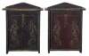 Pair of antique miniature dollhouse sized matching wardrobes with triangular pediments and doors painted in gold with scroll work, vines and birds.