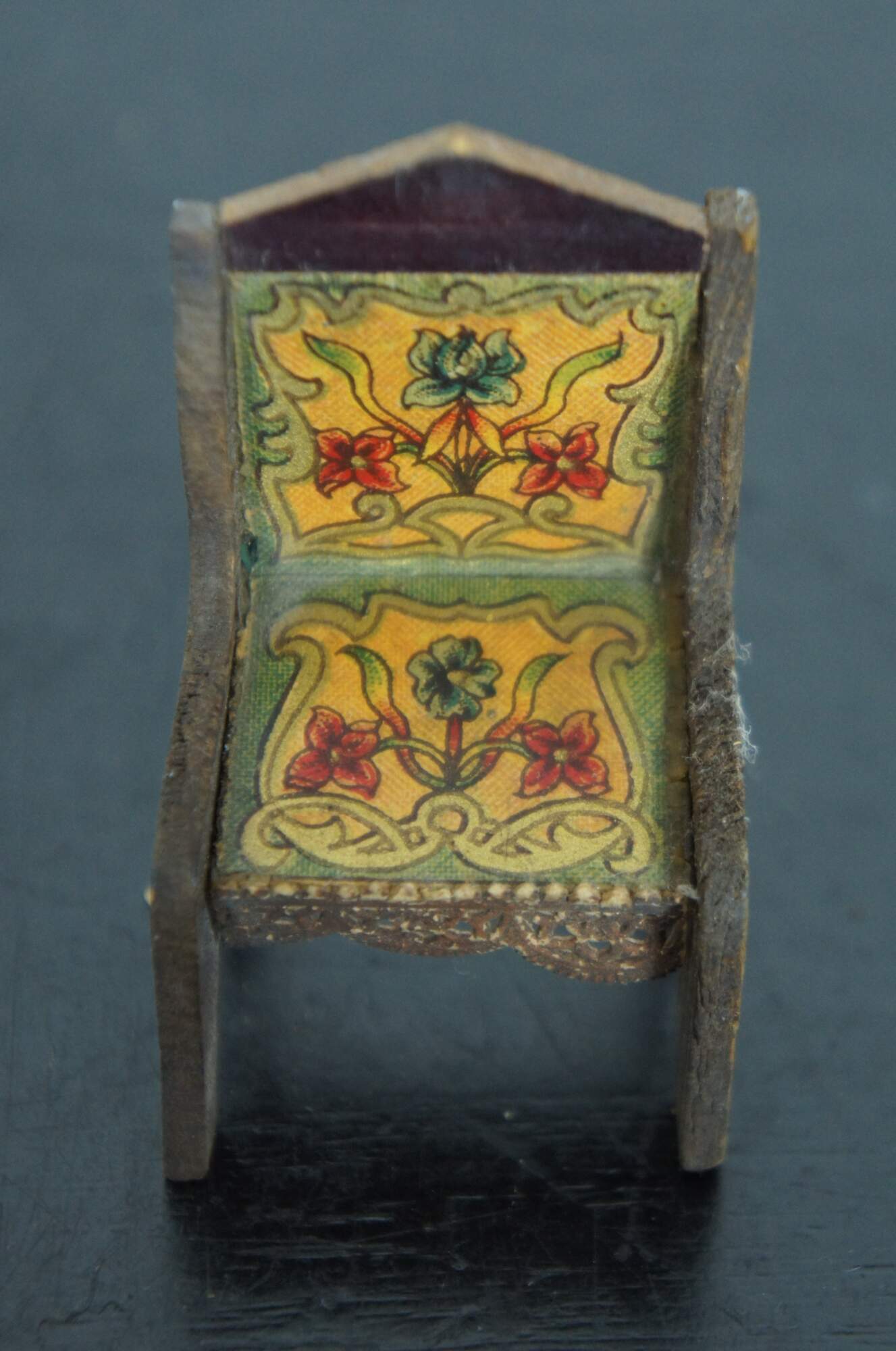Set of three doll house sized pieces of furniture – one reticulated / pierced settee, one intact chair, and one chair missing a combination arm/leg – decorated with floral lithograph printed paper.