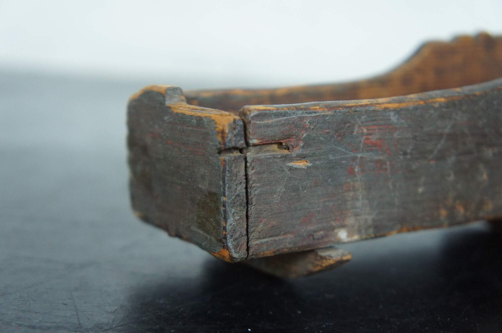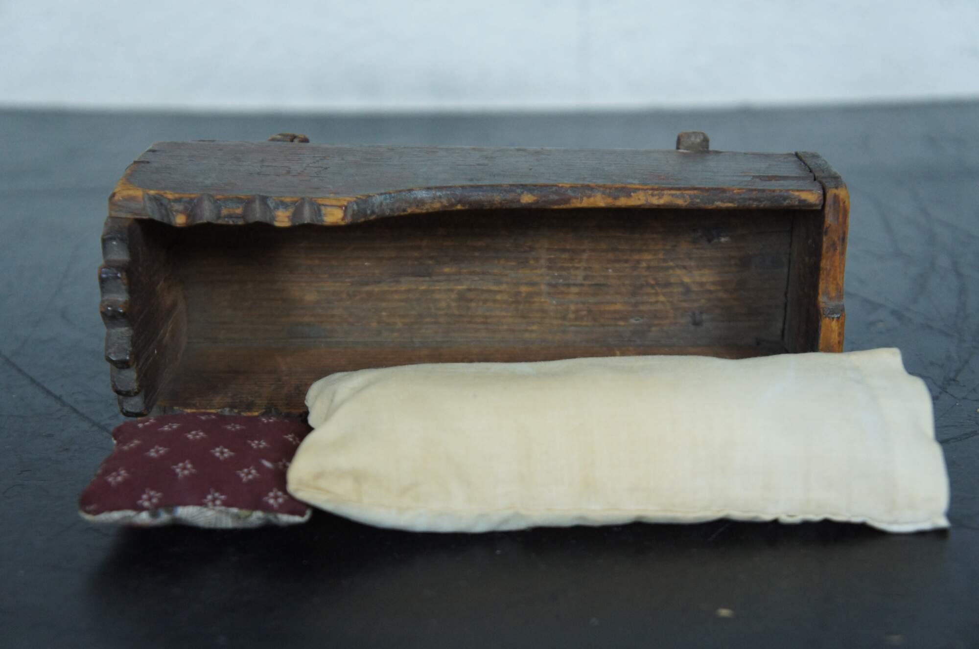 Small antique hand made wooden early American farmhouse doll cradle with a decorative saw tooth edge and cotton covered cushions.