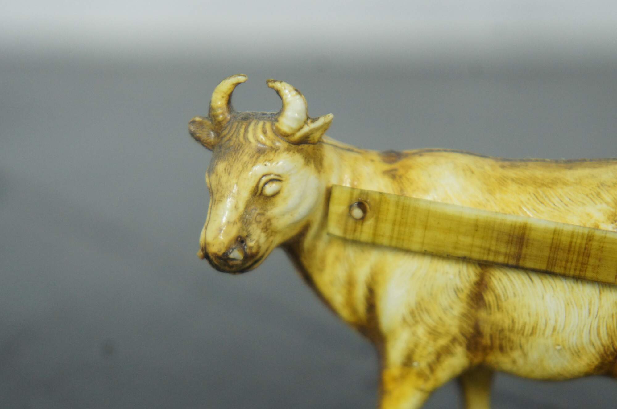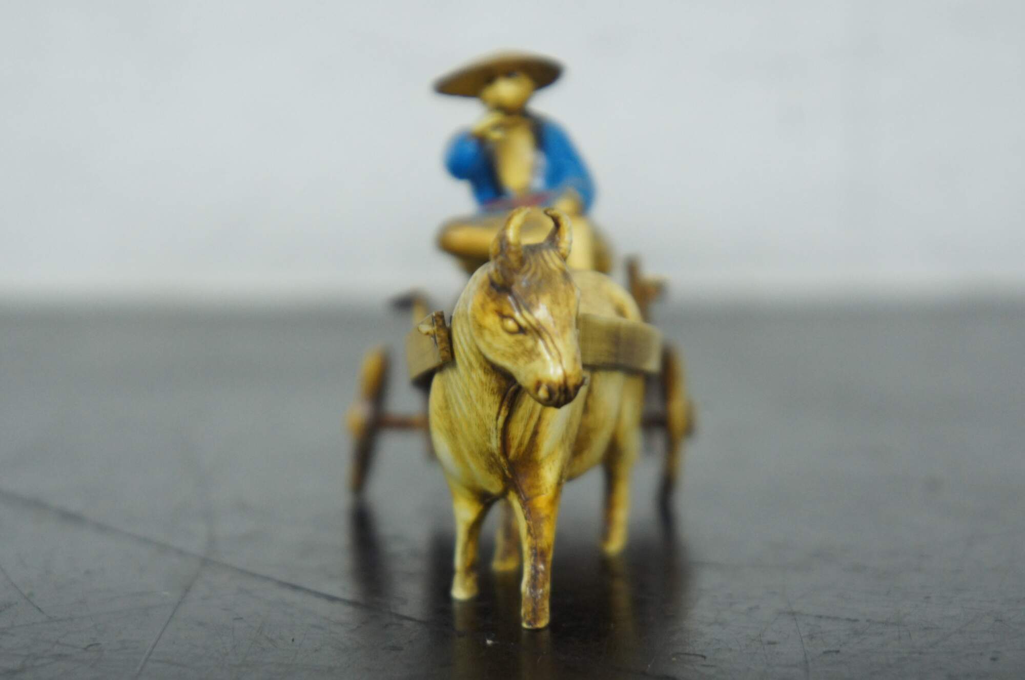 Antique painted plastic toy in the shape of an cart filled with bales of hay, driven by a figure in Chinese clothing and drawn by an ox or cow.