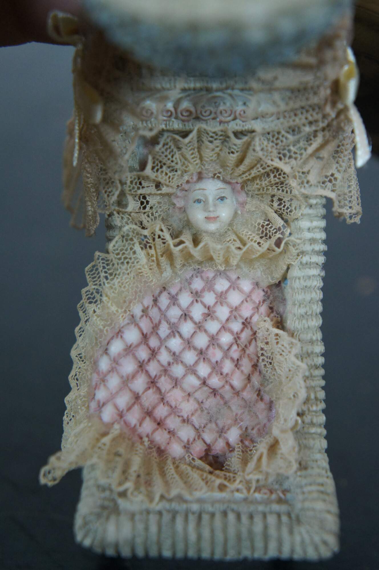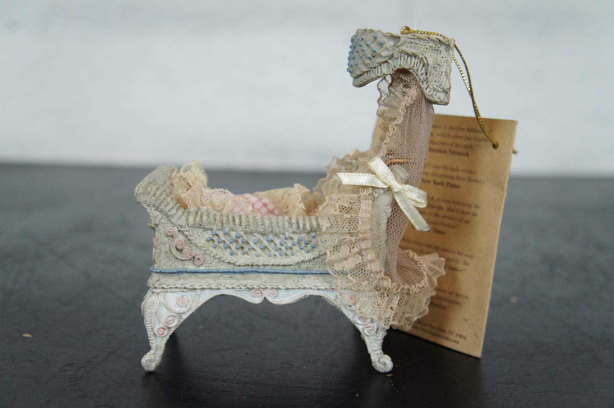 Vintage 2001 Louis Nichole Christmas ornament in the shape of a lace trimmed Victorian crib with a baby inside.