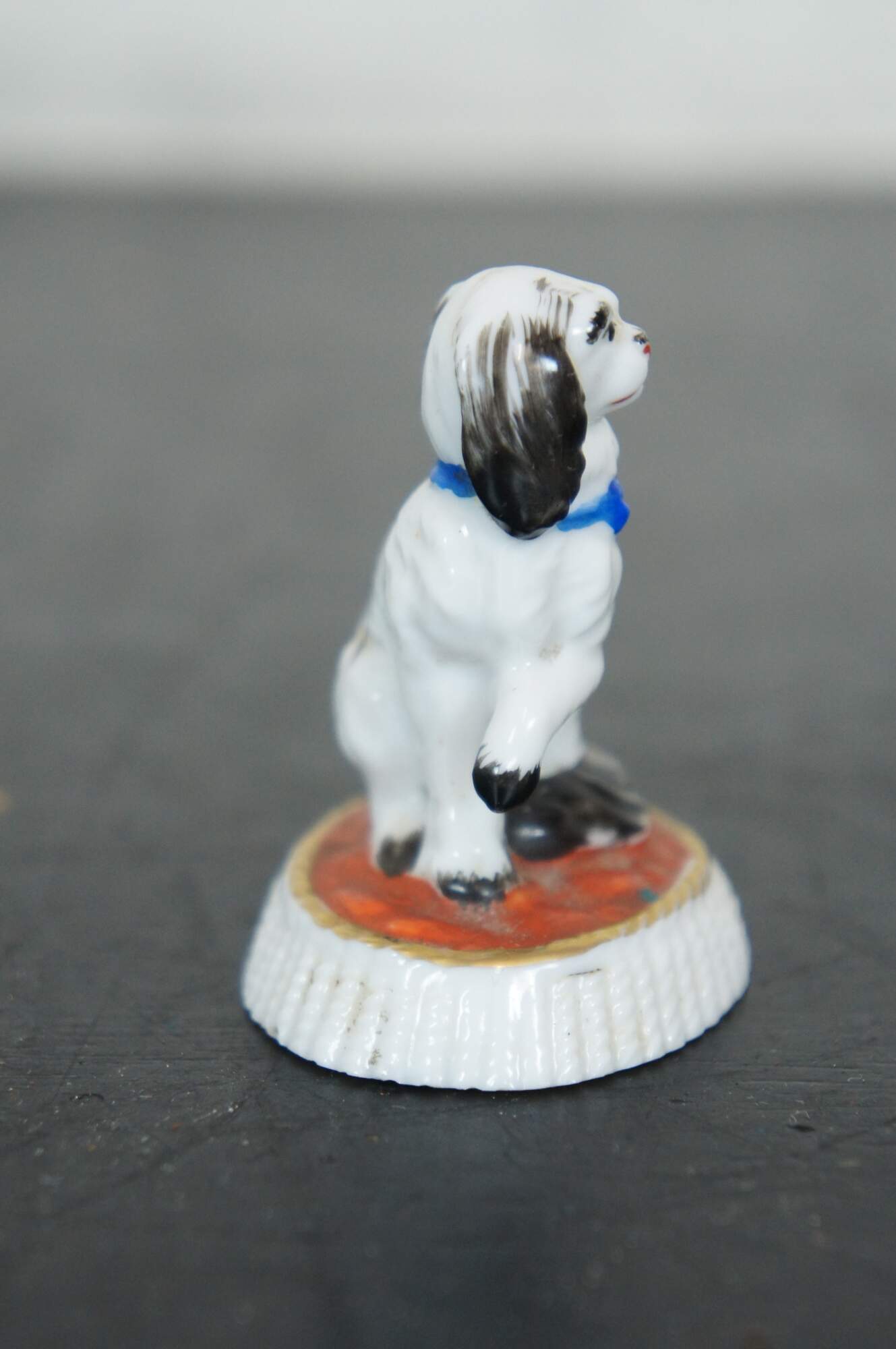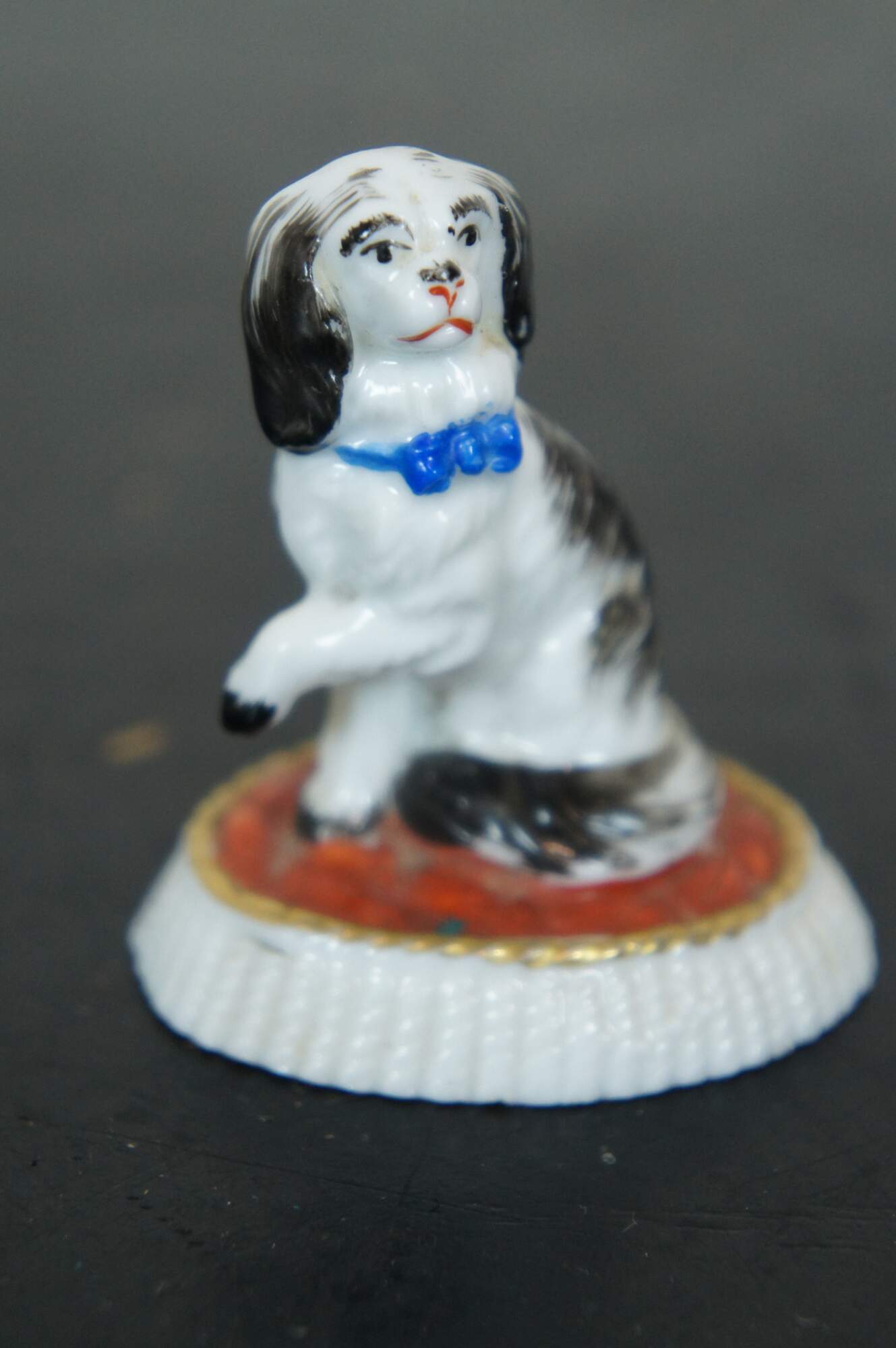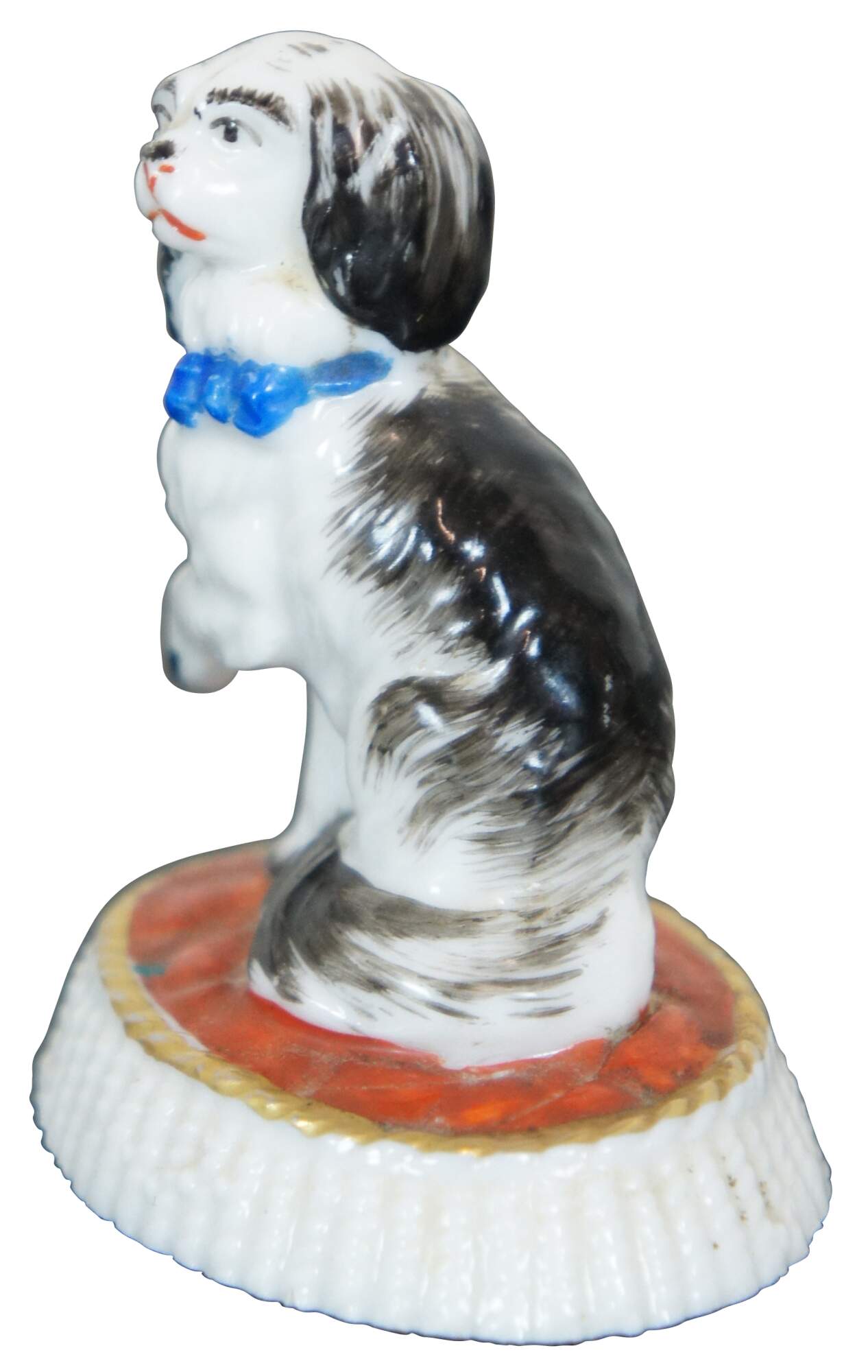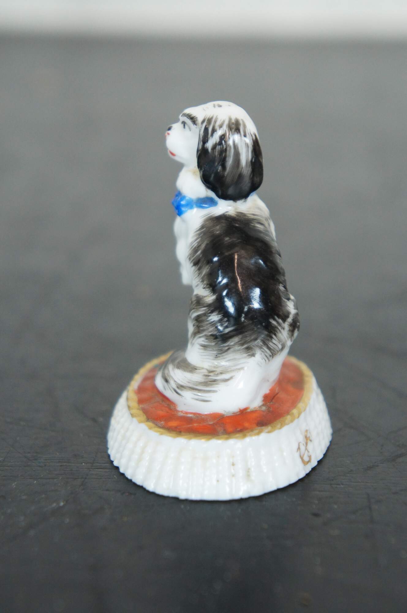 Antique 1885 - 1920s century miniature porcelain figurine in the shape of a black and white spaniel with a blue bow, seated on a red and white fringed cushion. Marked with a Samson golden anchor. This mark was used on German Chelsea Reproductions