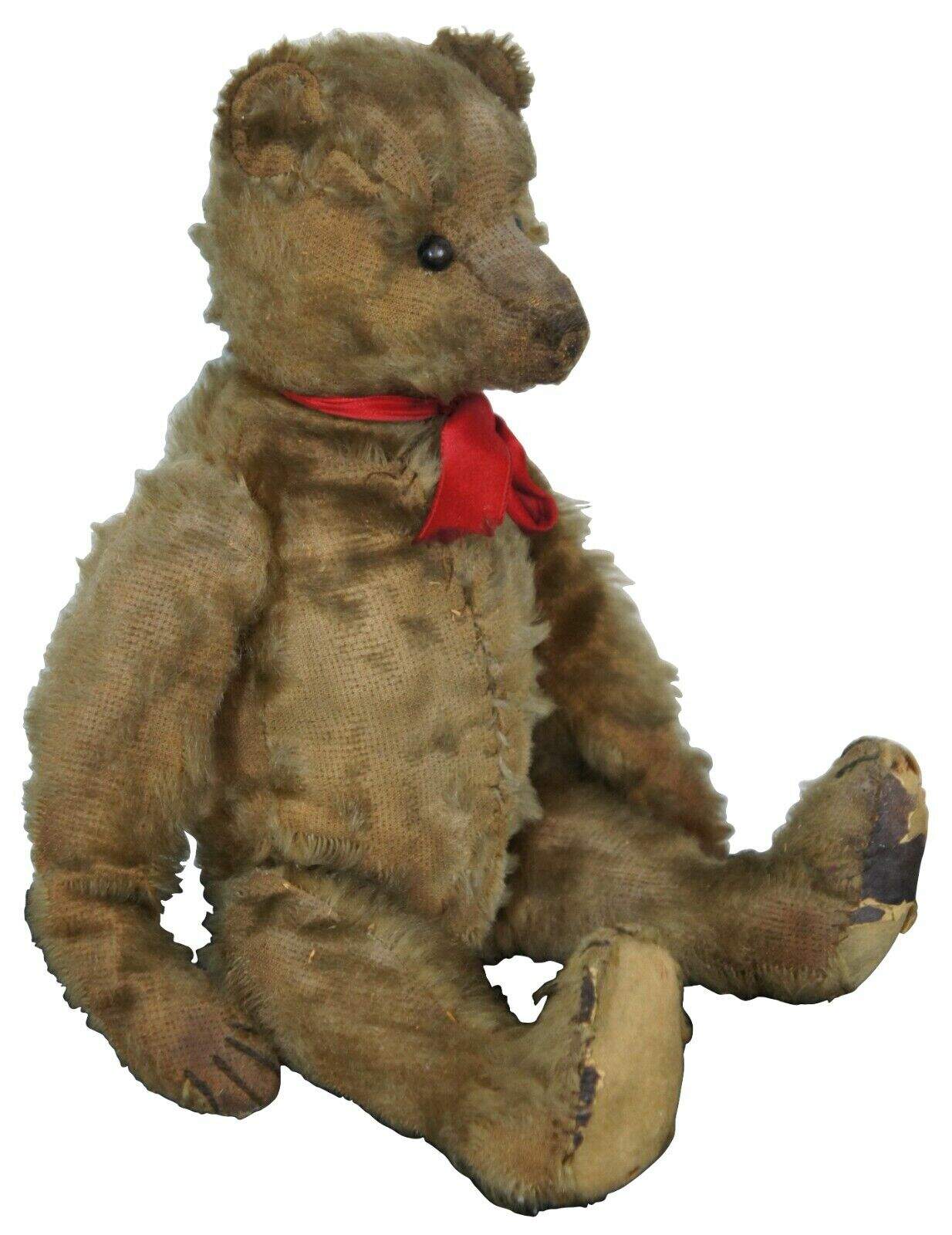 Antique early 1900s Steiff light brown mohair teddy bear with jointed limbs, hunchback, leather paw pads, four claws, stitched nose, black button eyes, and stuffed with wood wool. Circa 1907-08